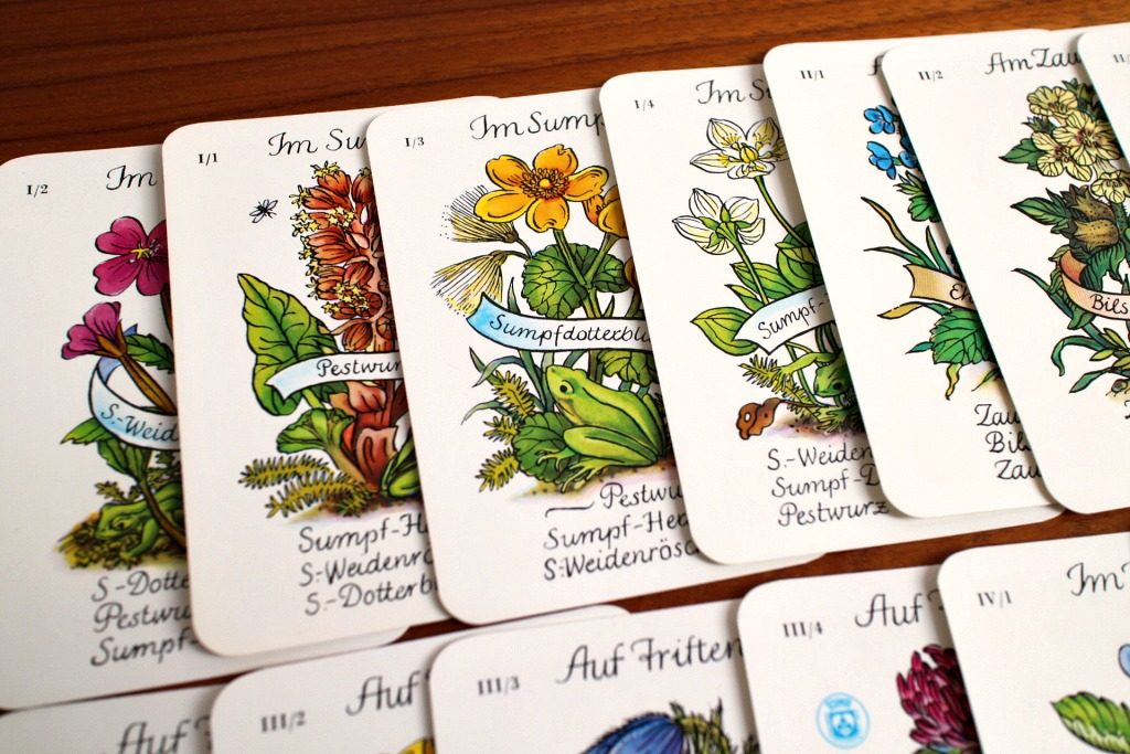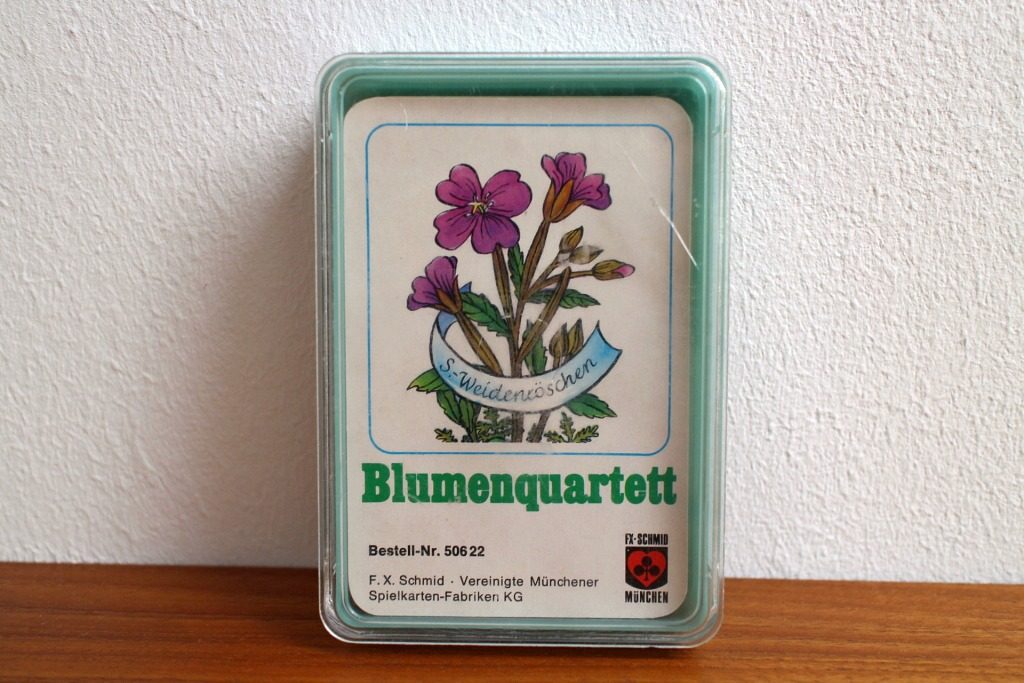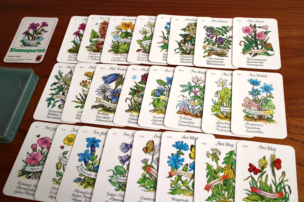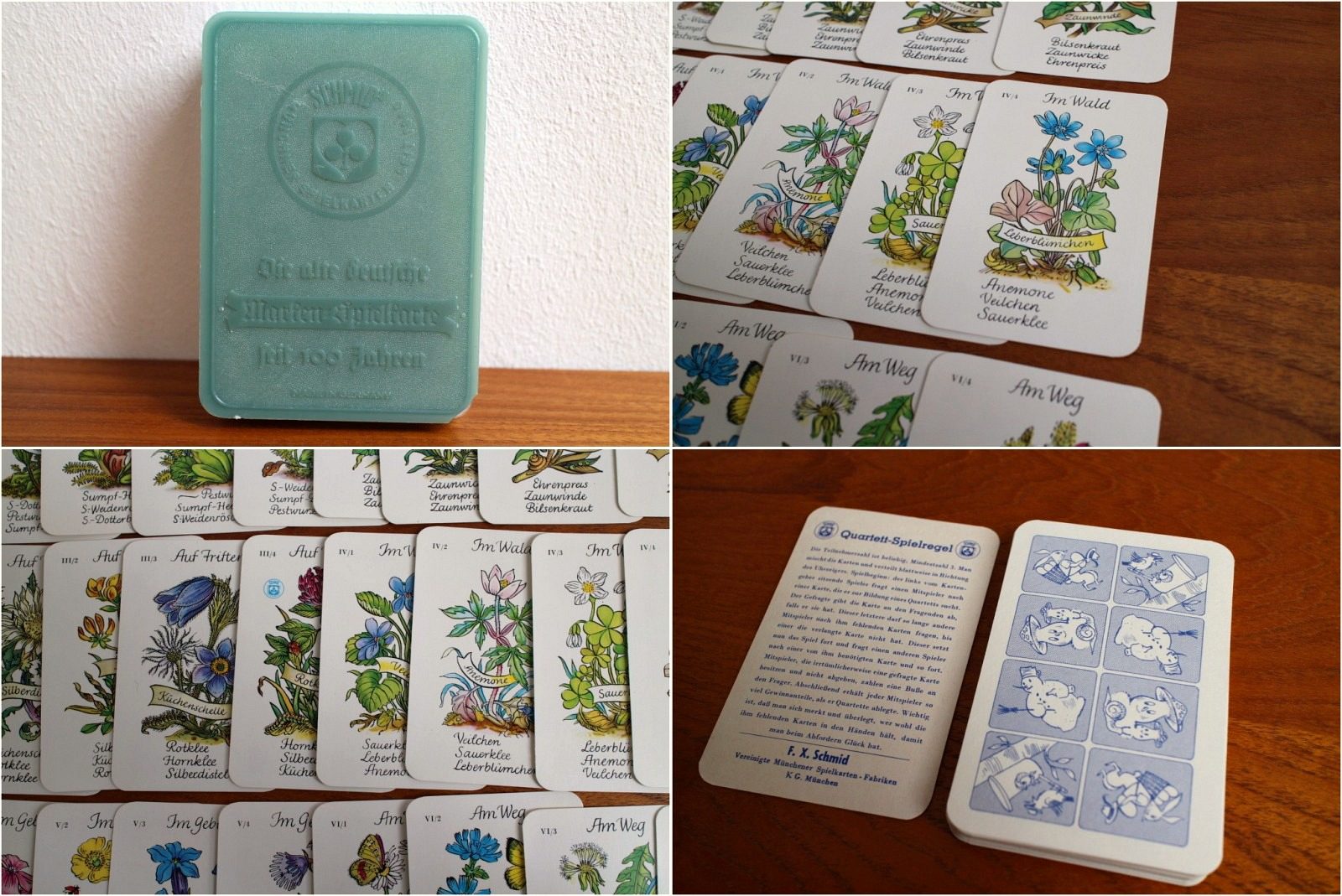 蚤の市で見つけた、25枚それぞれに違った絵柄の入ったレトロなカードゲームセット。 繊細なタッチで描かれた多種多様のお花と名前がドイツ語で書かれたちょっとした図鑑のような楽しいカード。