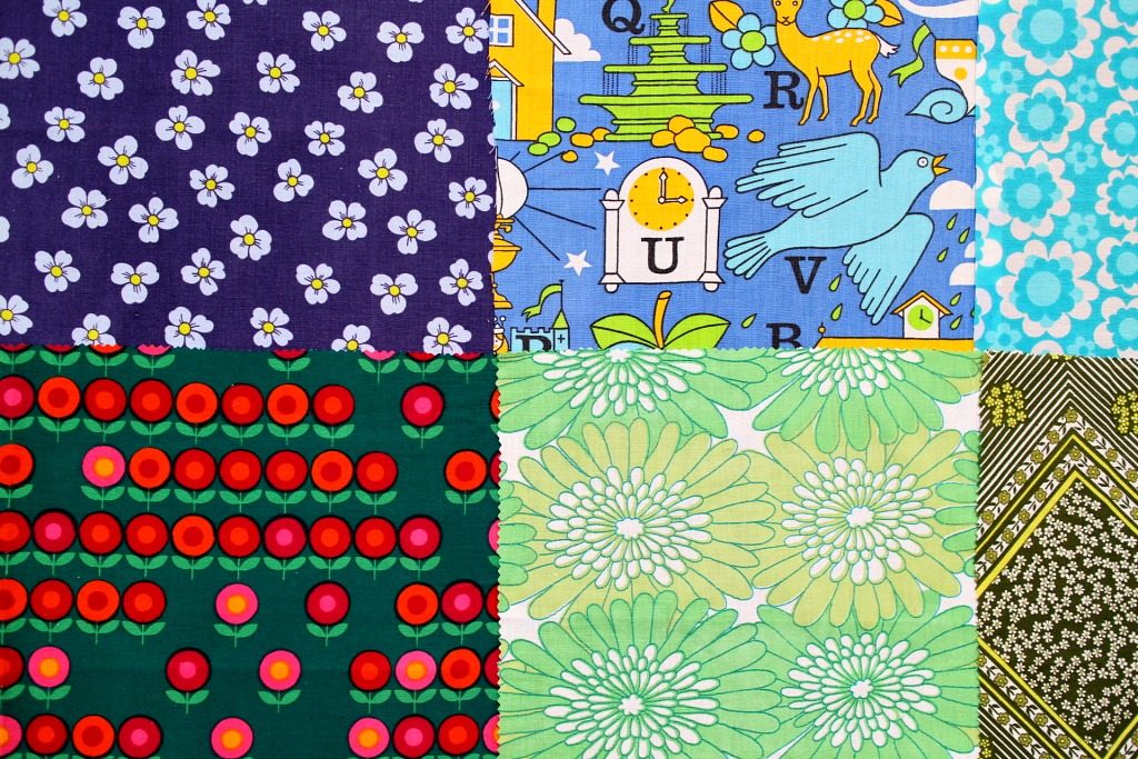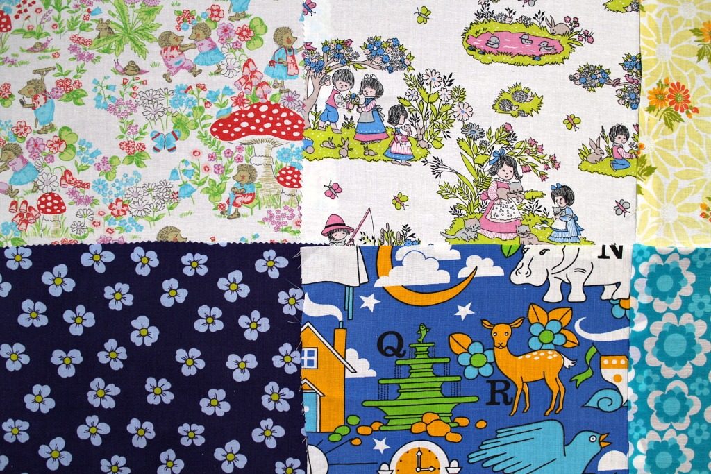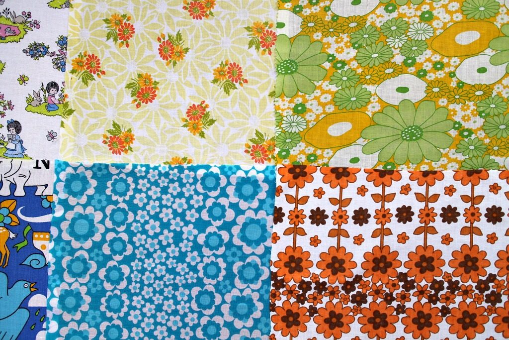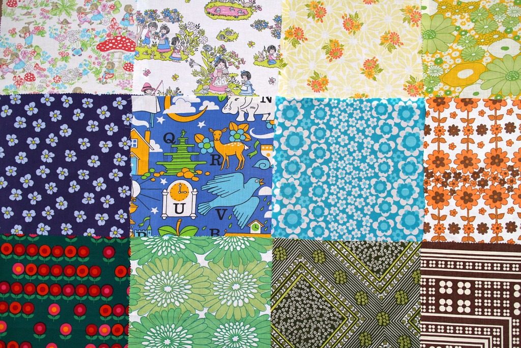 イエロー・ブルー・グリーン系のフローラル柄に動物柄などをミックスした、レトロ生地初心者にも使いやすいヴィンテージカットクロス12枚セット。