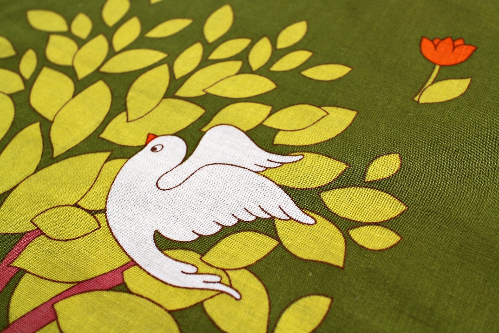 コンテンツにスキップしっとりとしたカーキの木々の間を自在に飛び回る、白い鳥が描かれたレトロな動物柄ヴィンテージファブリック。