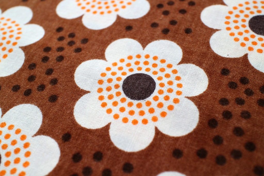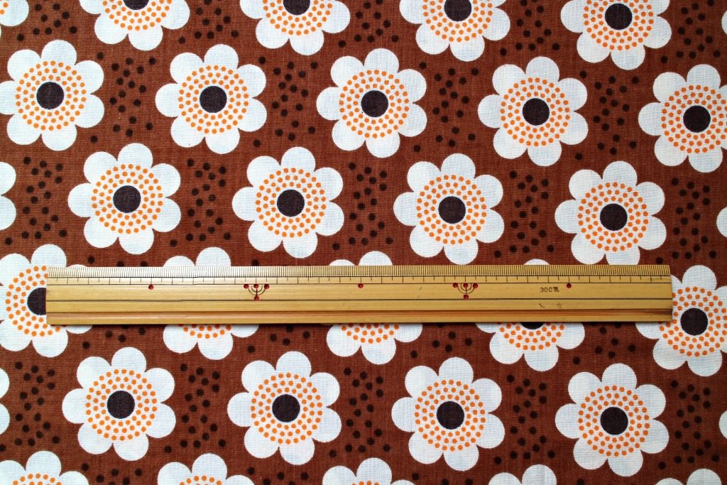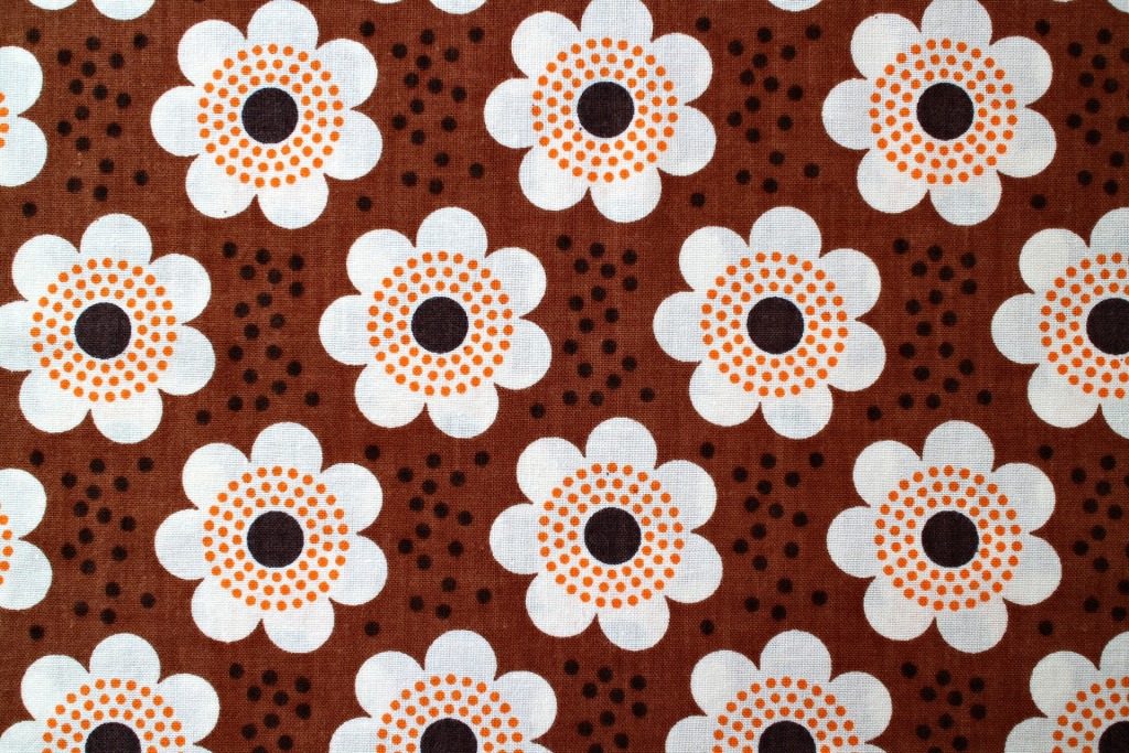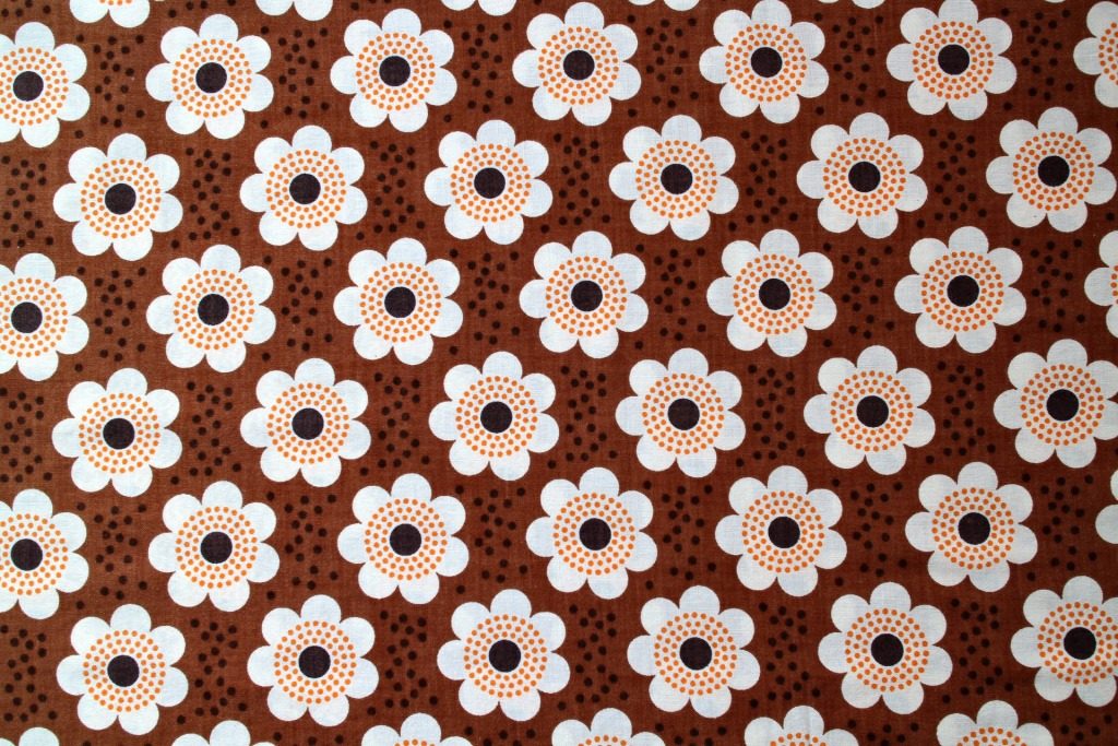 チョコレートのような茶色い生地に白いポップフラワーがプリントされた、キッチュなレトロ柄ヴィンテージファブリック。