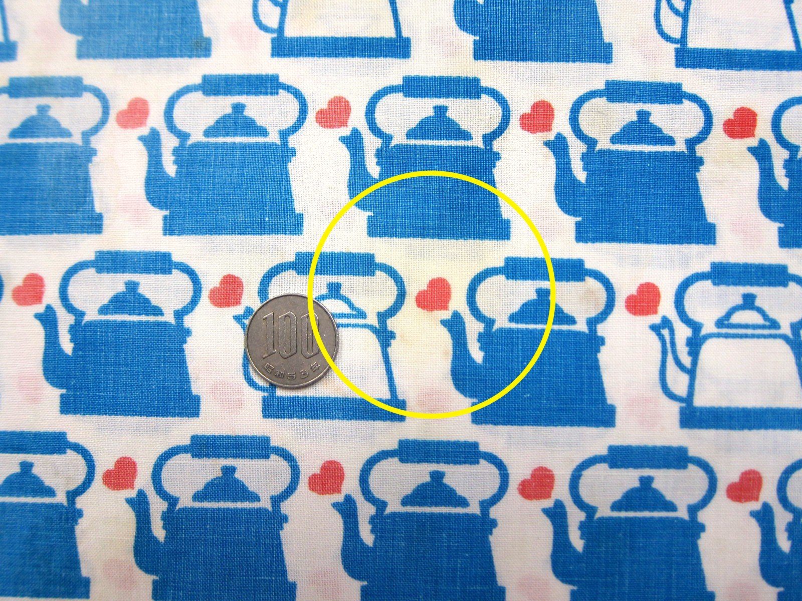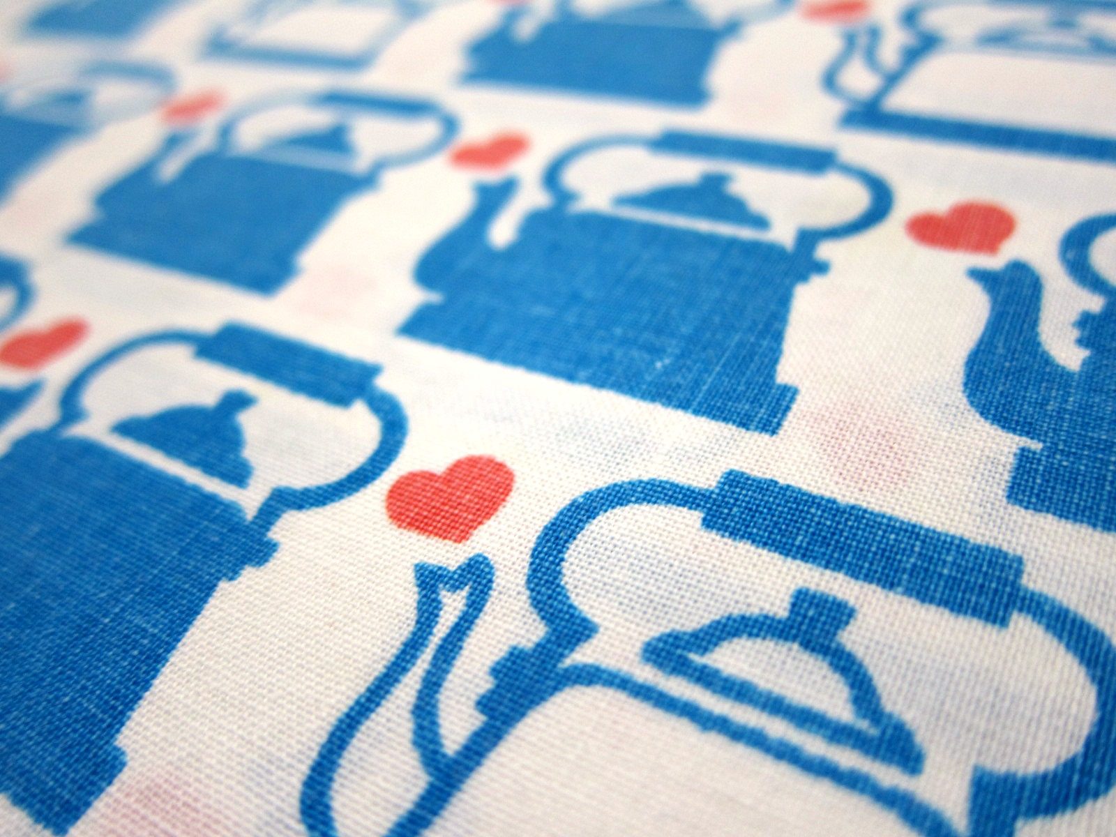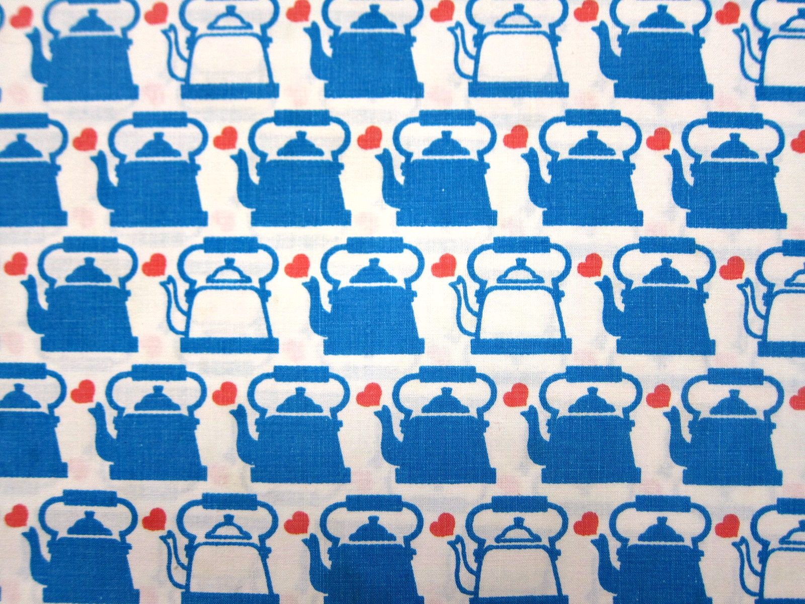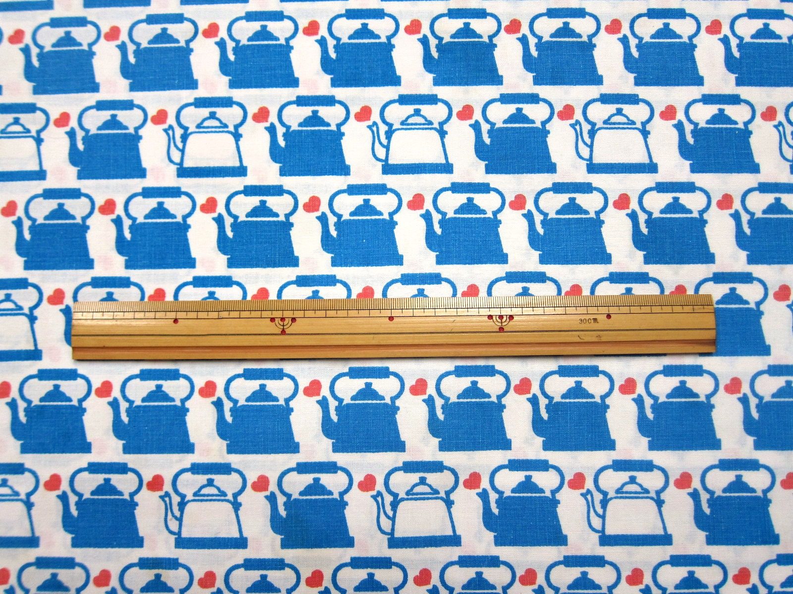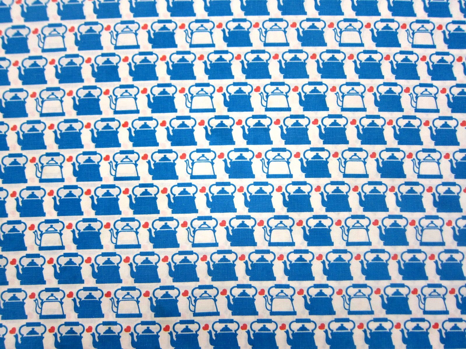 レアなGrazielaのやかんのモチーフが連続で入ったヴィンテージファブリック。 やかんの色はブルーと白。 赤いハートがトレードマークです。