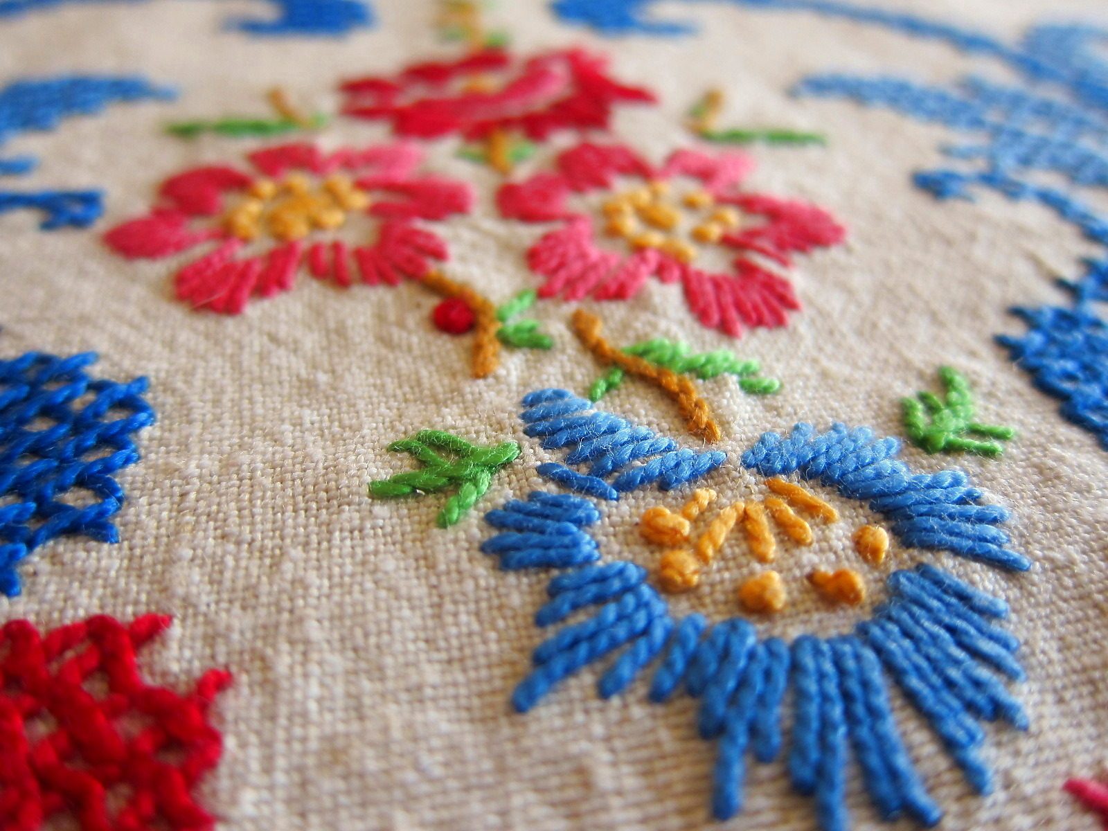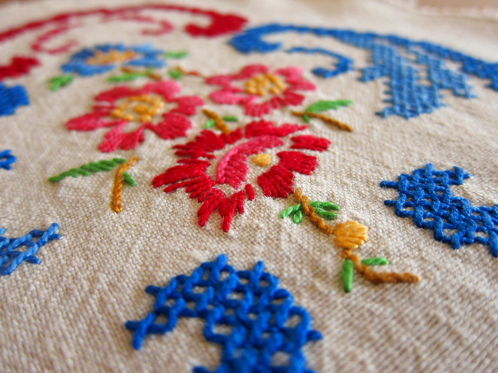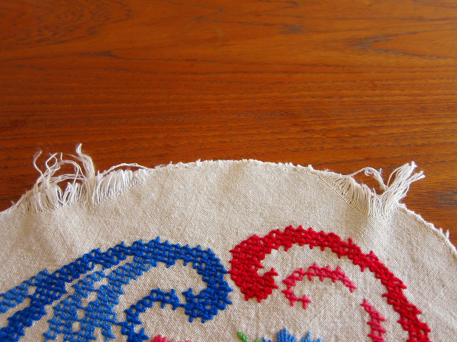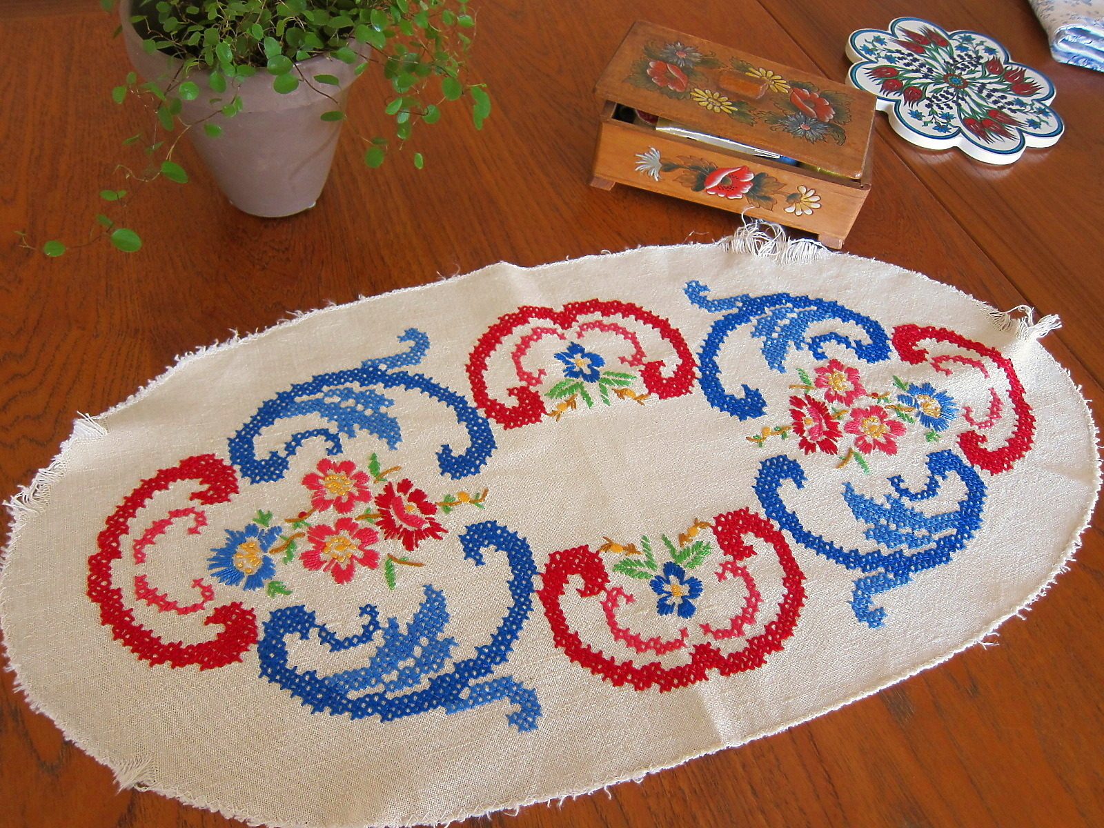 ドイツの蚤の市で見つけたアンティークの刺繍とクロスステッチが施されたプレースマット。 明るい色使いの花模様で、とても可愛らしい雰囲気がたっぷり。 素材はリネンです。