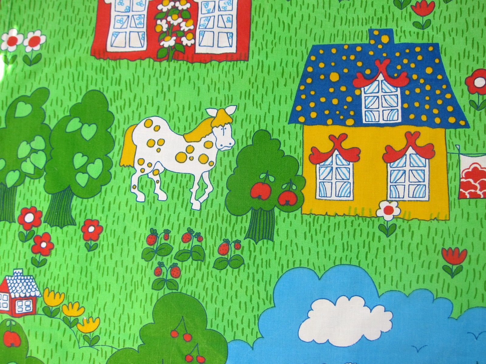 カラフルな家々になぜか汽車など、空想世界に思わず引きこまれてしまうほのぼのとしたデザインです。