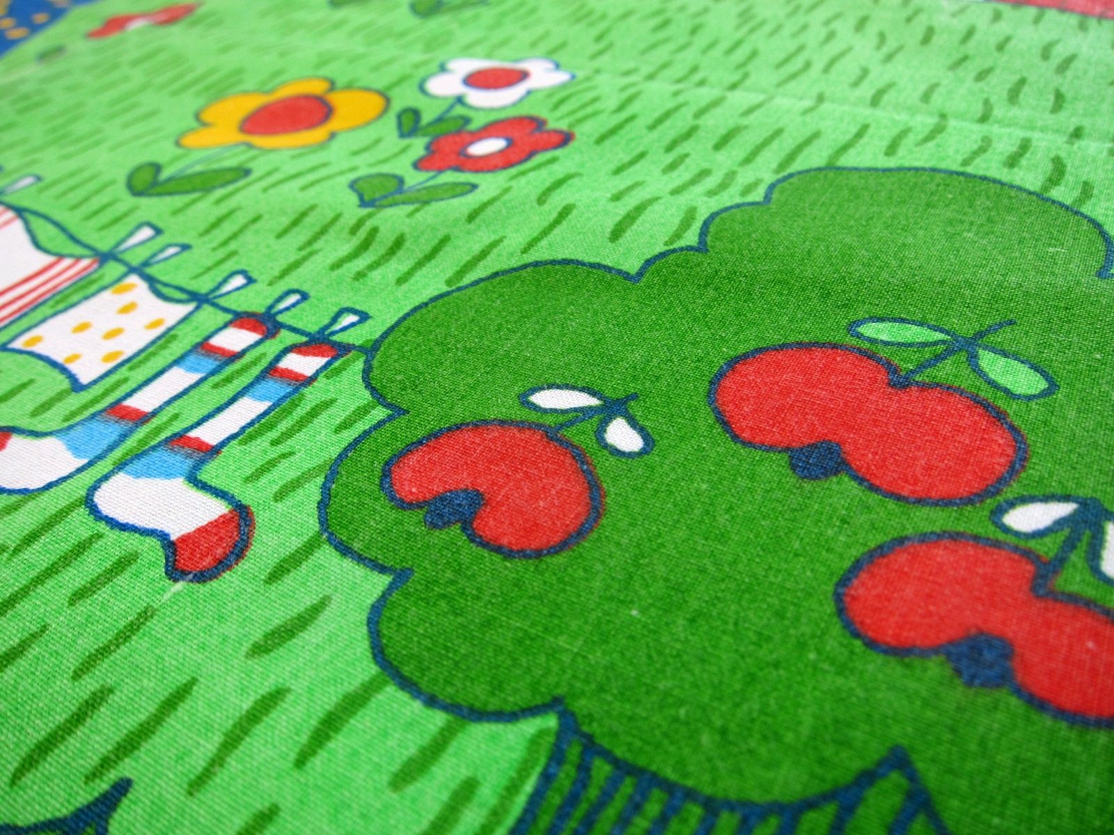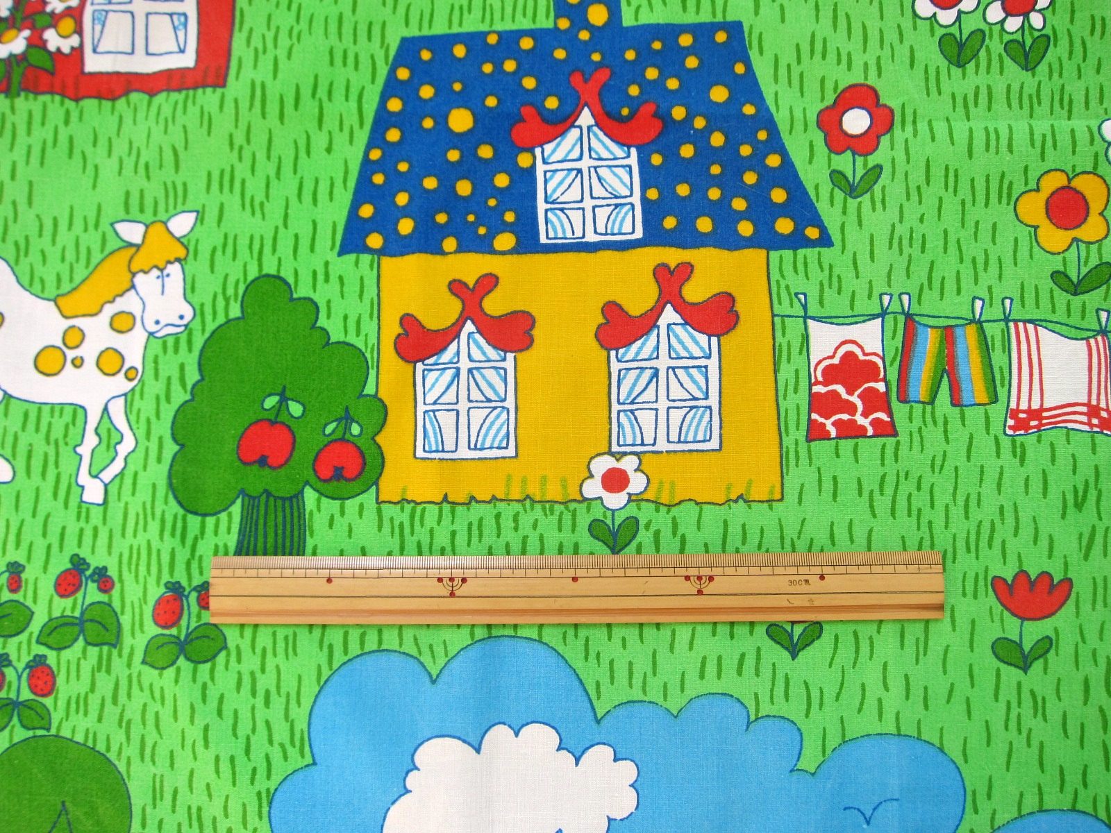 コンテンツにスキップキュートなお花やファームアニマルなど楽しい農場の光景が描かれた、レトロな雰囲気いっぱいのファブリック。