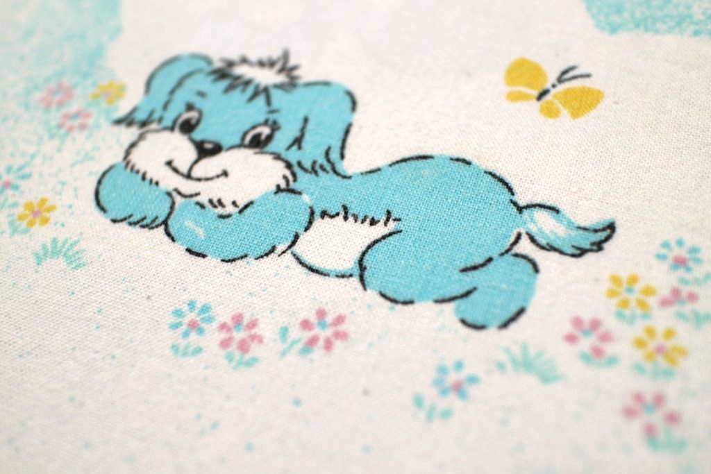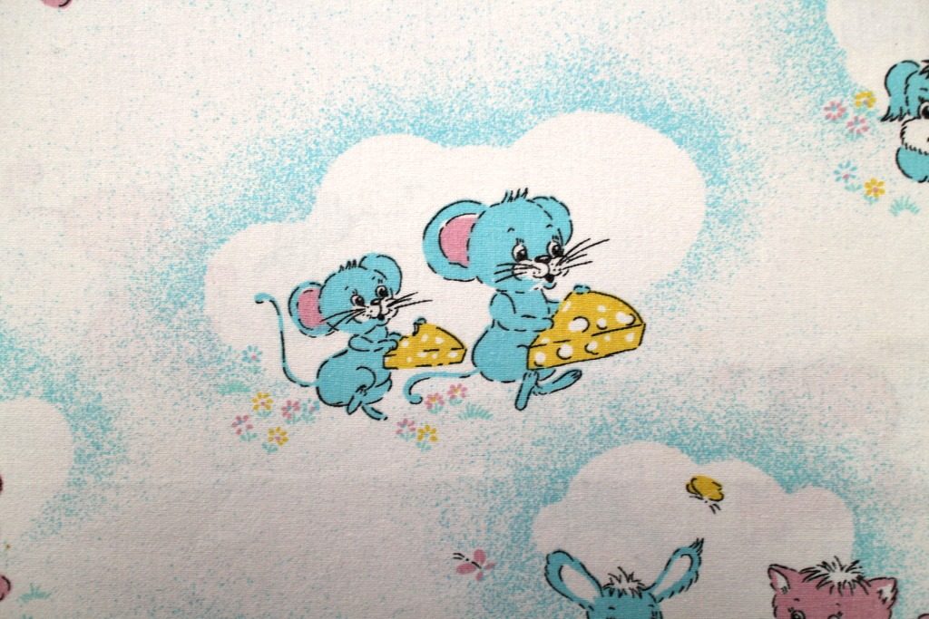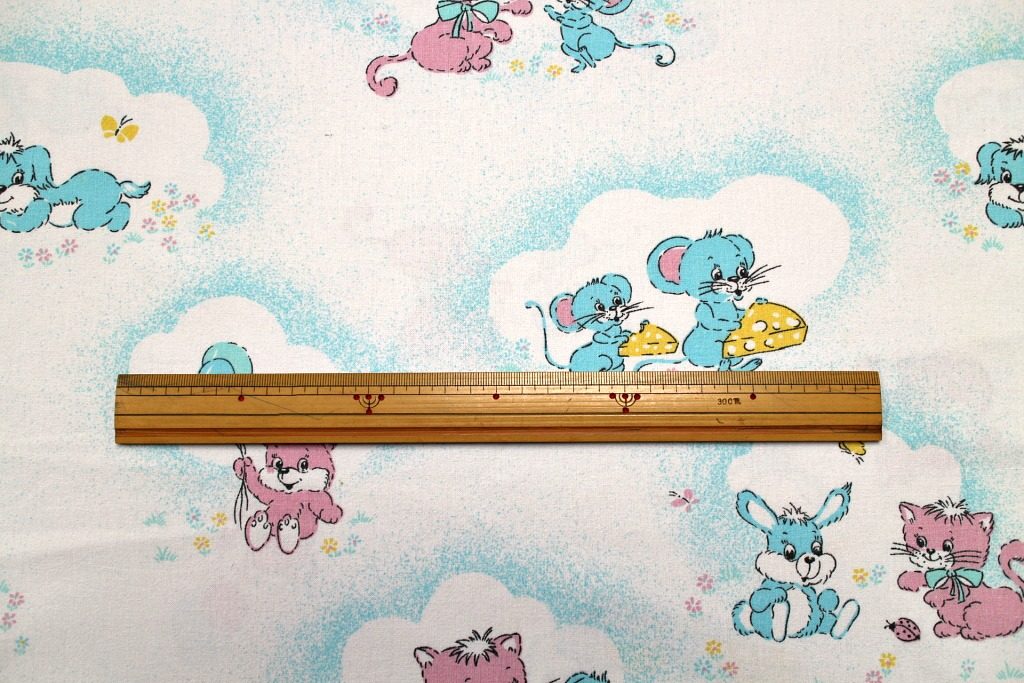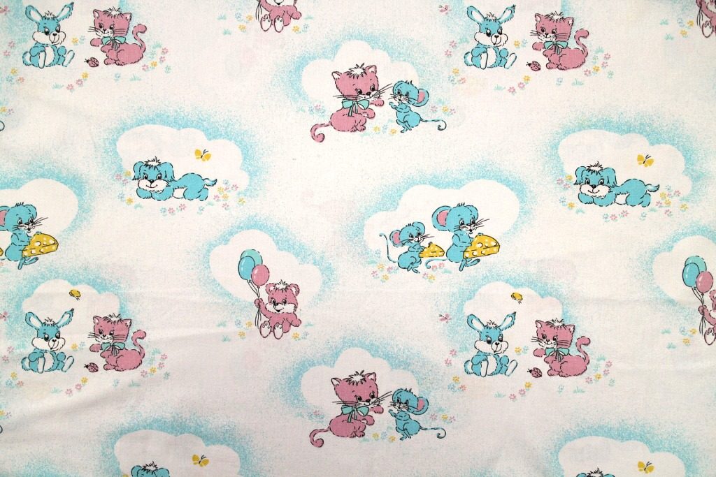 コンテンツにスキップネコやねずみ・うさぎなどがピンクとブルーにアニメ化された、メルヘンちっくなヴィンテージファブリック。