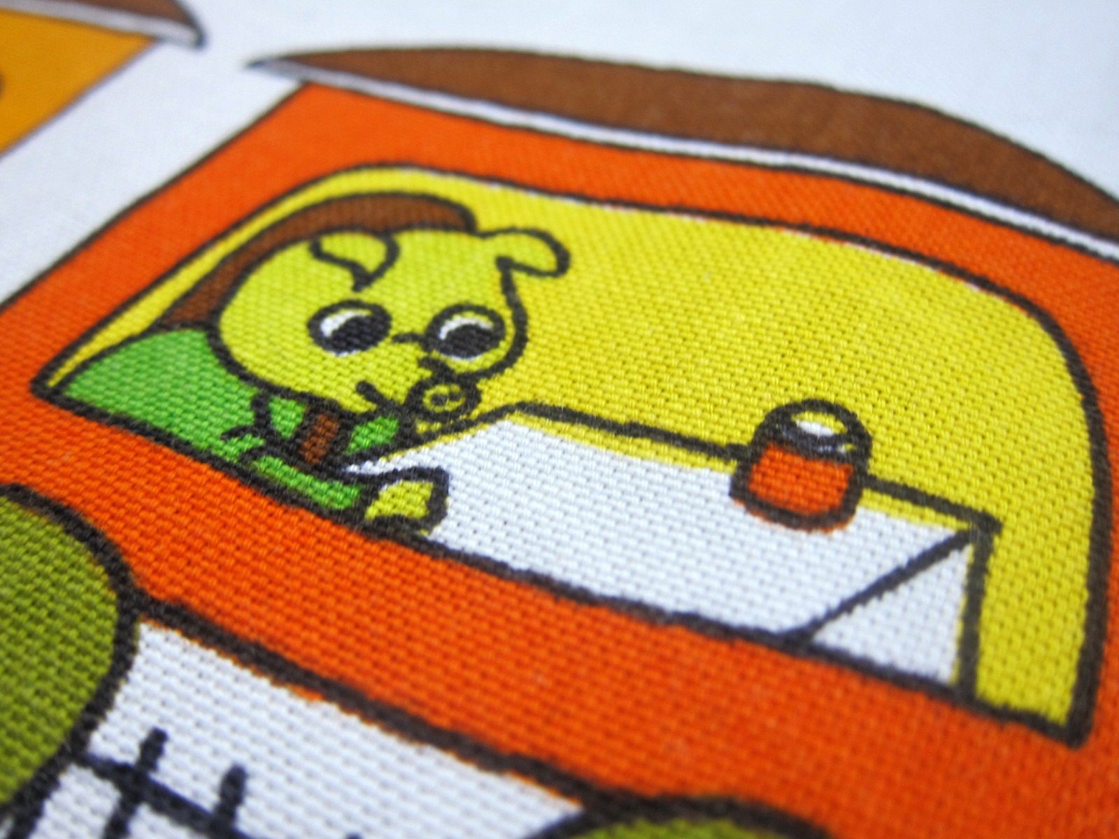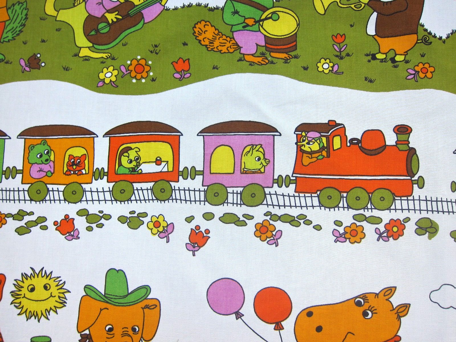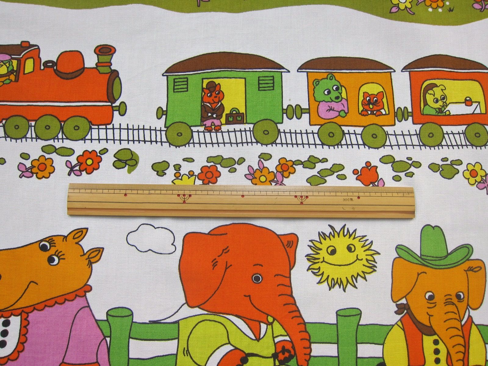 ゾウ、カバ、ブタ、タヌキなど、色んな動物たちが汽車に乗ったり、楽器を弾いたり、楽しいイラストが描かれた70年代の子ども柄ヴィンテージファブリック。 色はグリーン系で、楽しい雰囲気です。 とても人気の高い柄で、入手の難しいものの一つです。