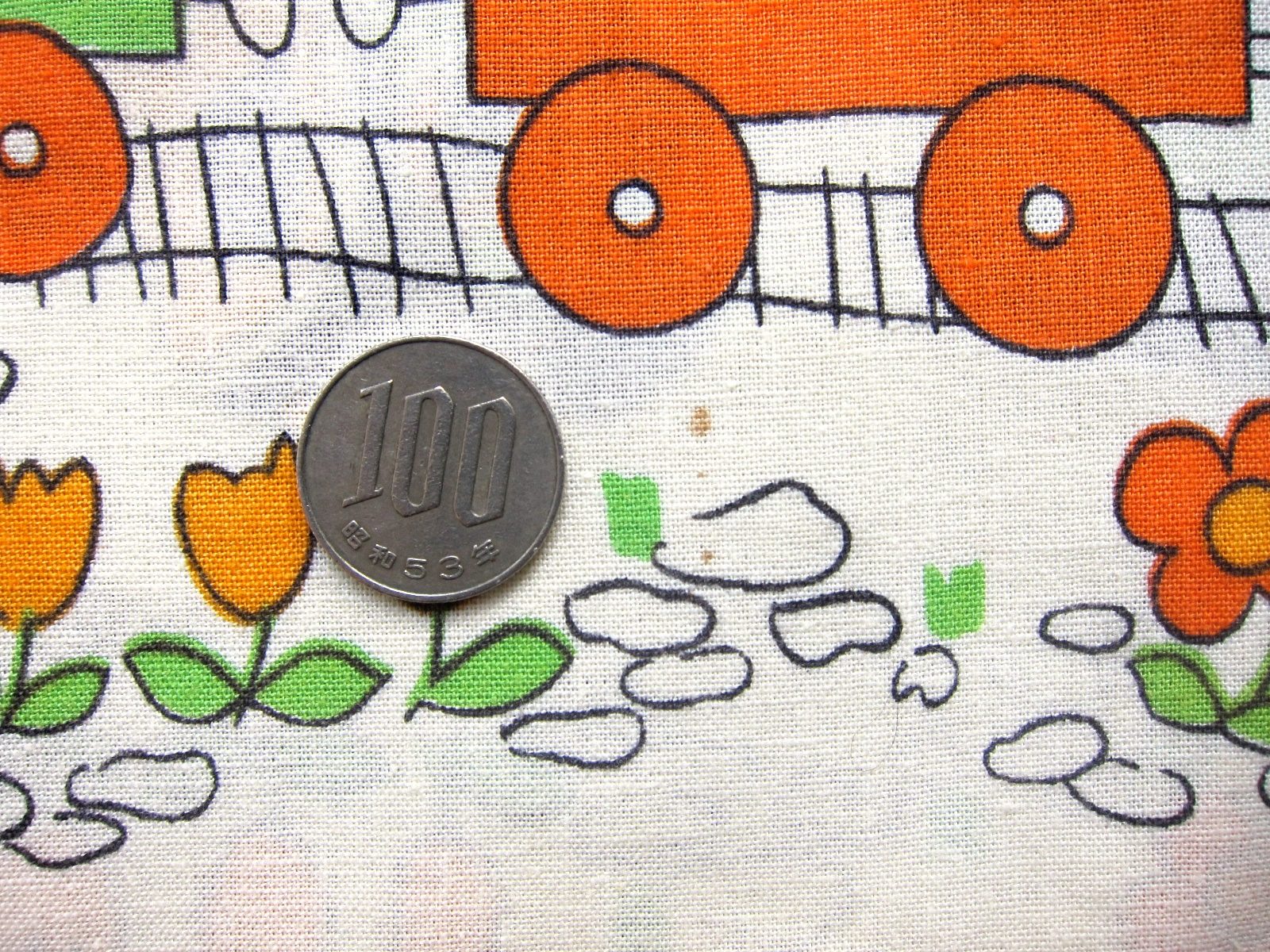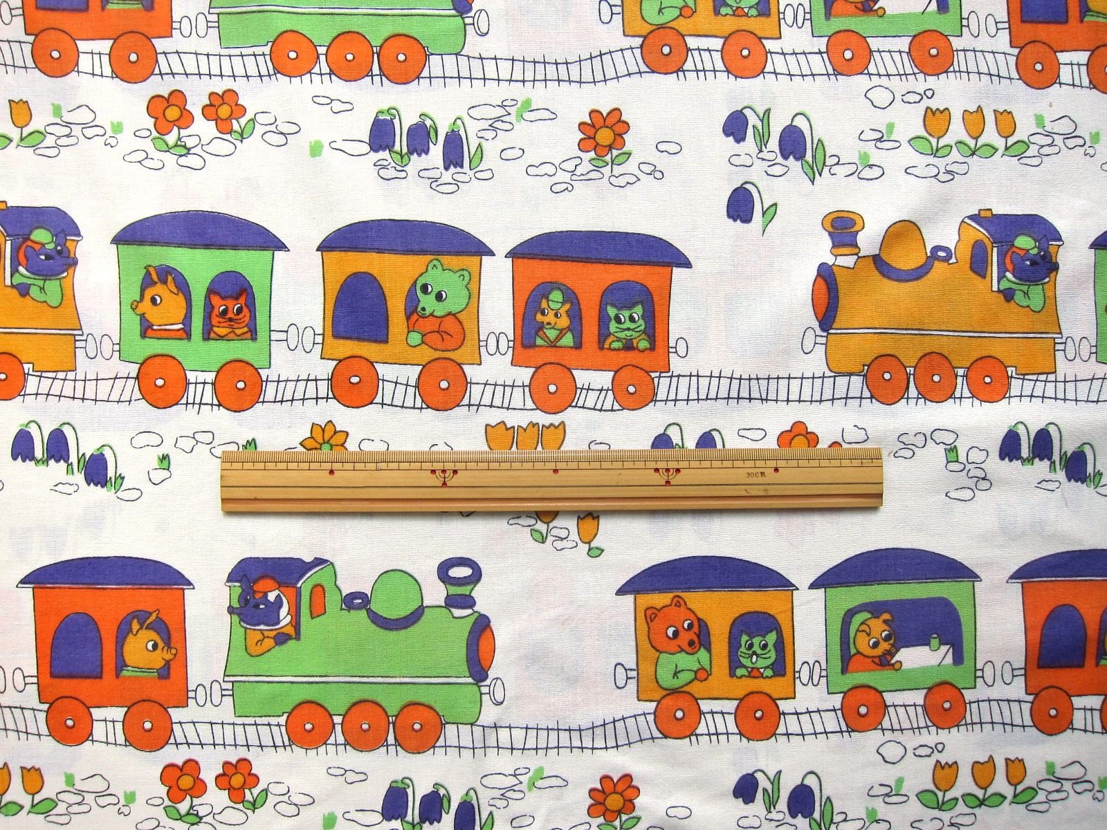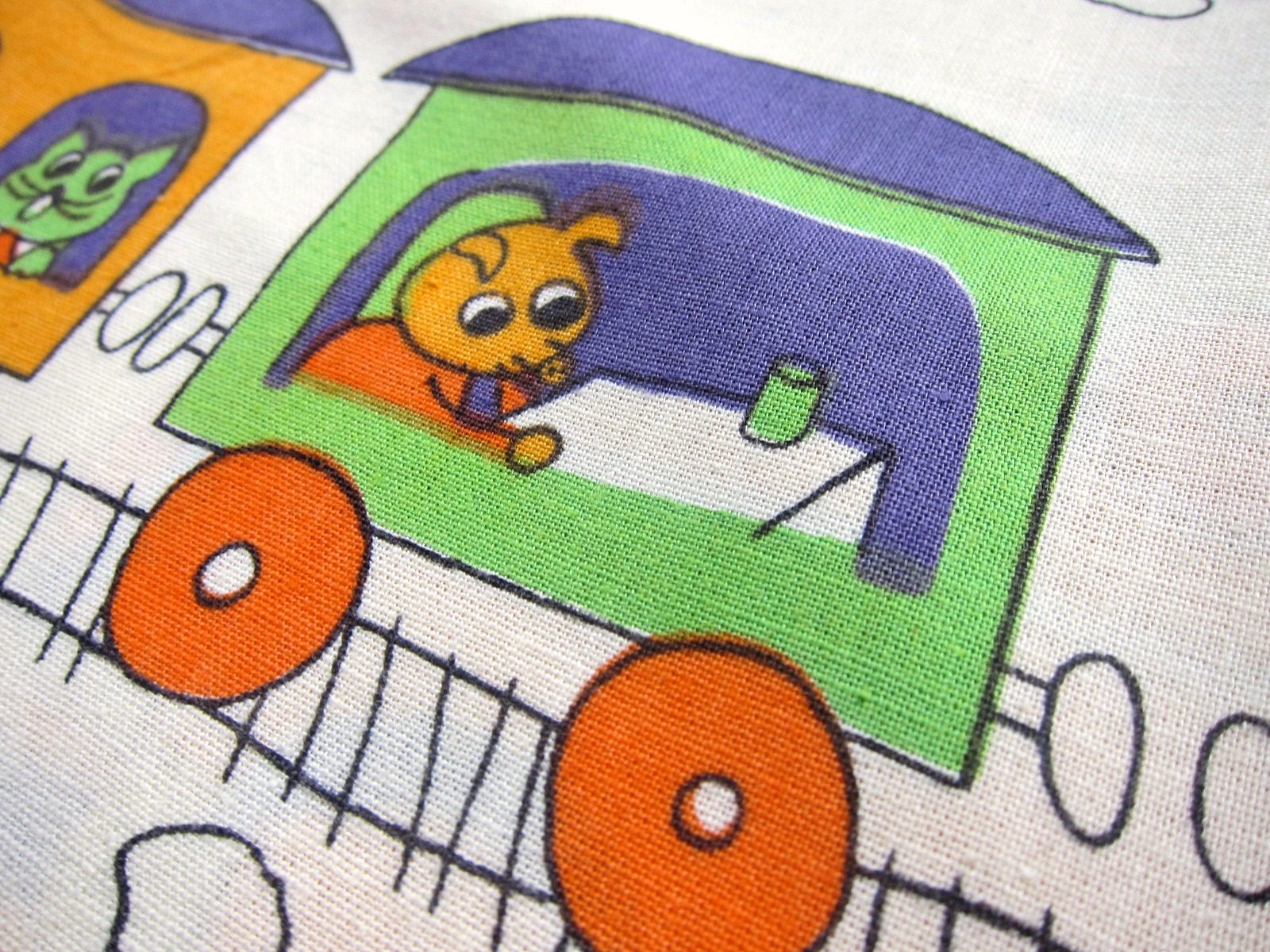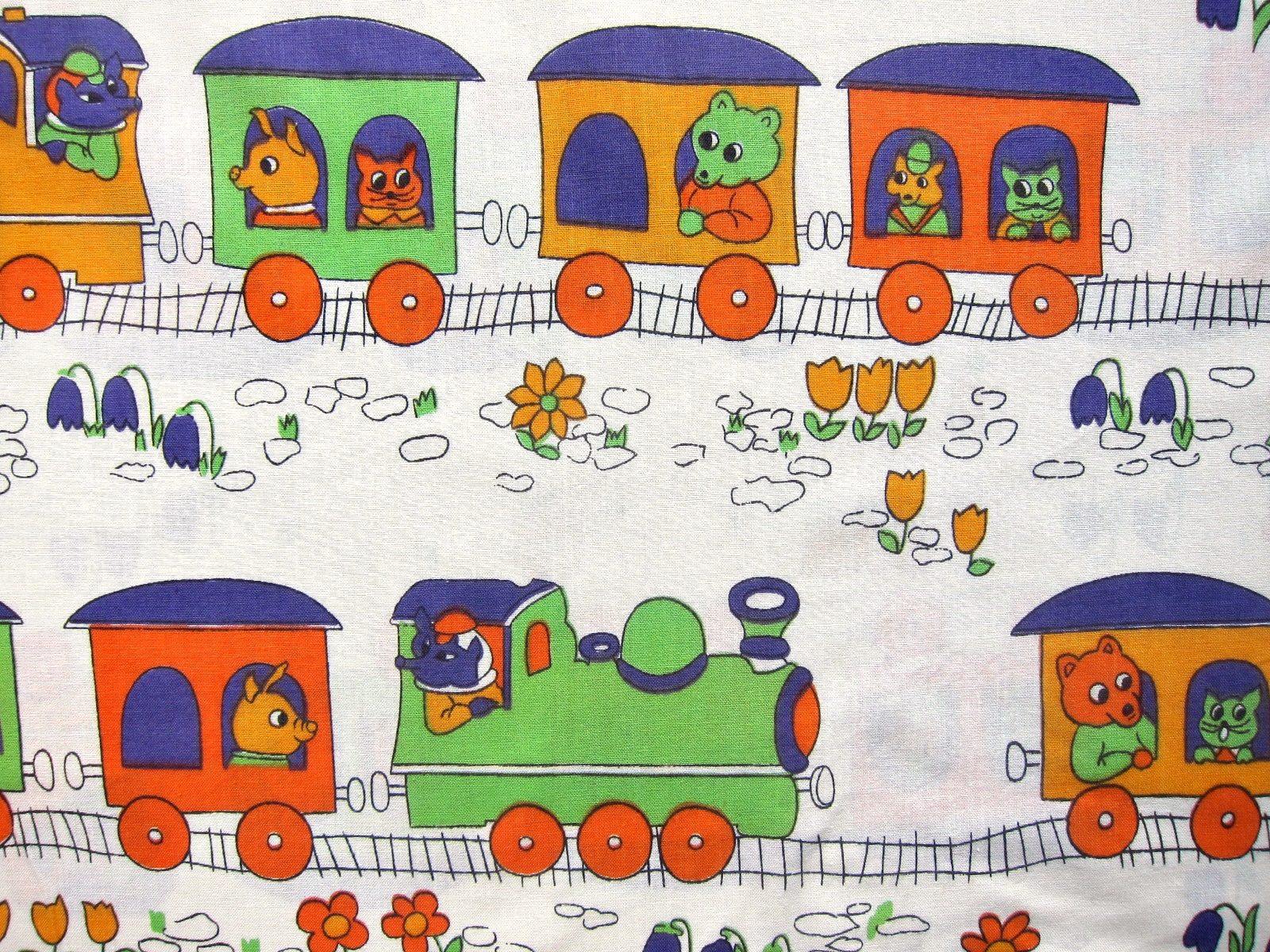 レトロでユーモラスなタッチで描かれた動物達が電車に乗ったイラストが特徴的な、70年代のヴィンテージ布。 ベースのカラーは生成りがかった白です。