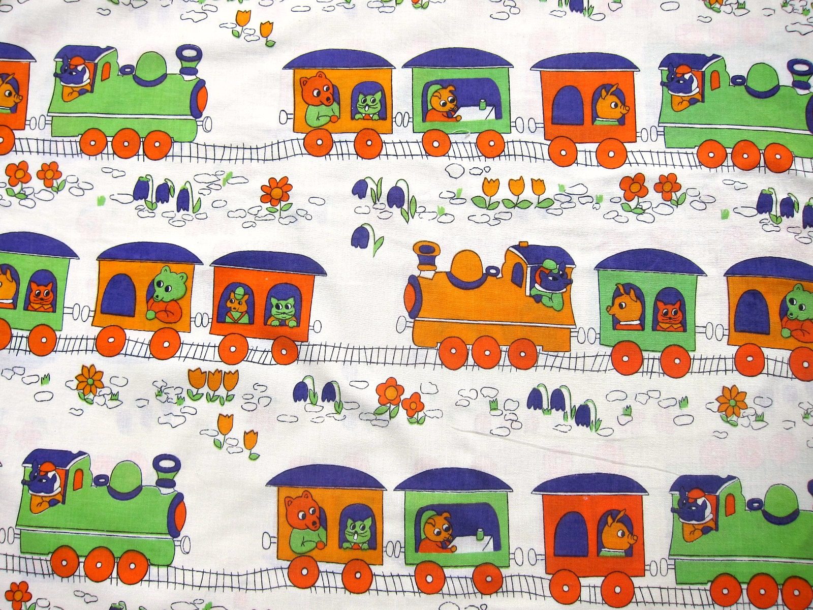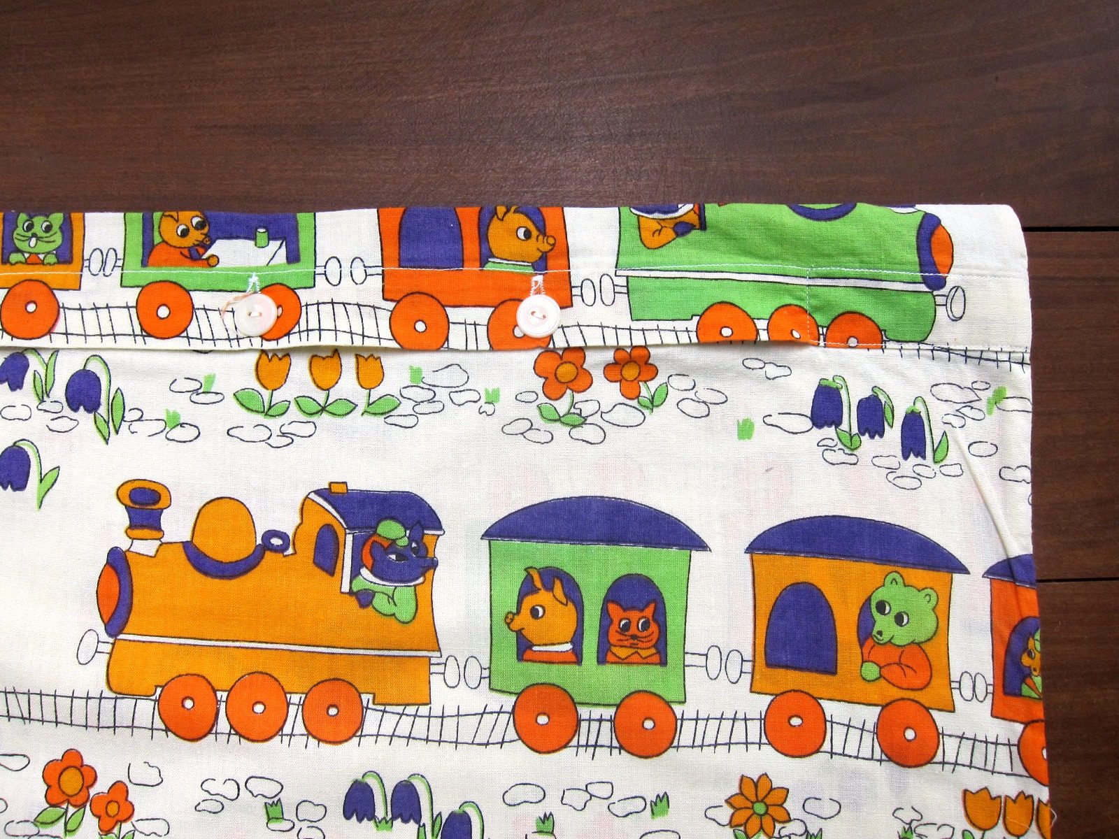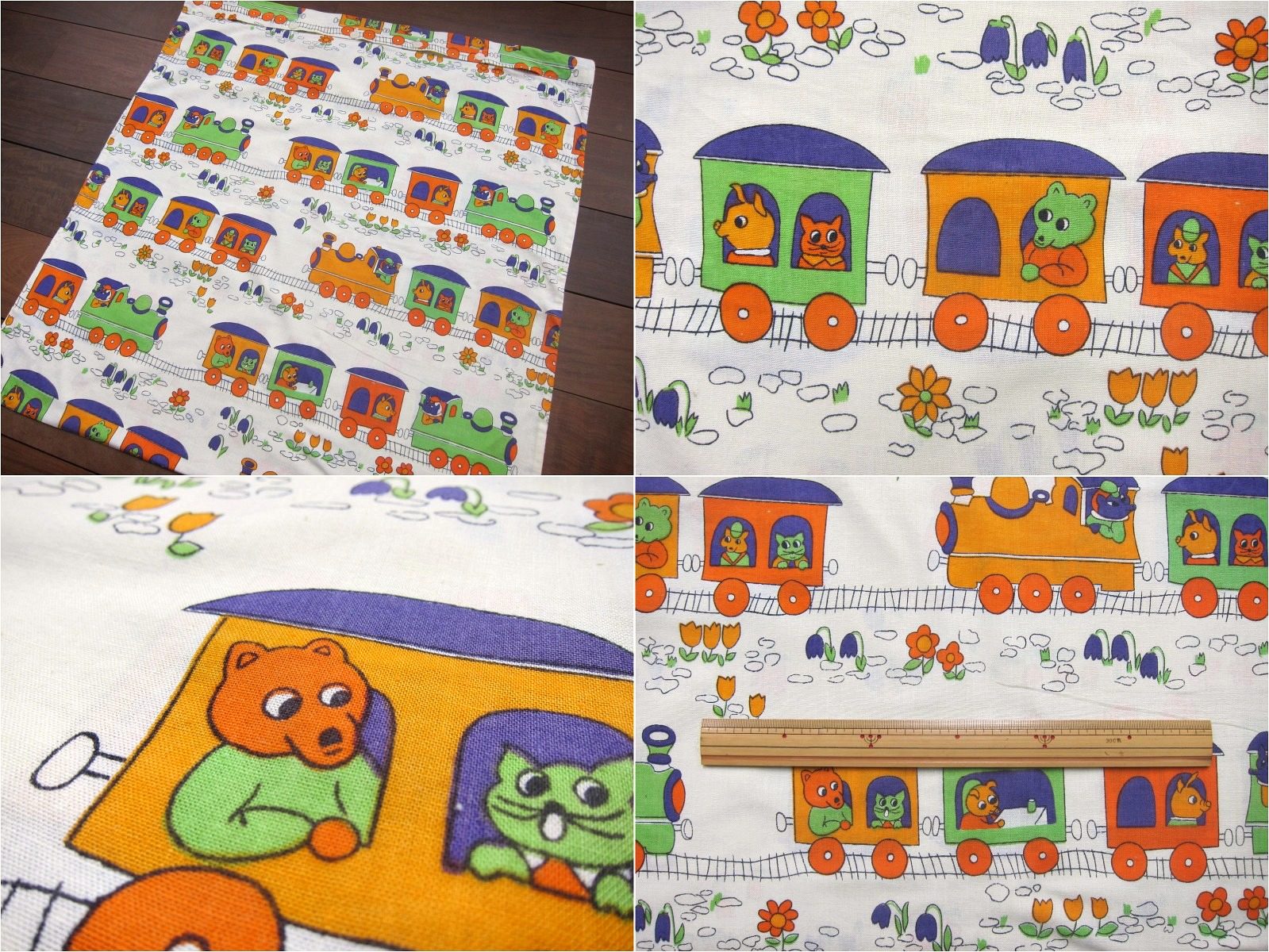 独特なタッチで描かれた動物たちが電車に乗ったイラストがかわいい、ドイツのヴィンテージピローケース。 オレンジや緑、紫など、ちょっと変わった色が使われています。