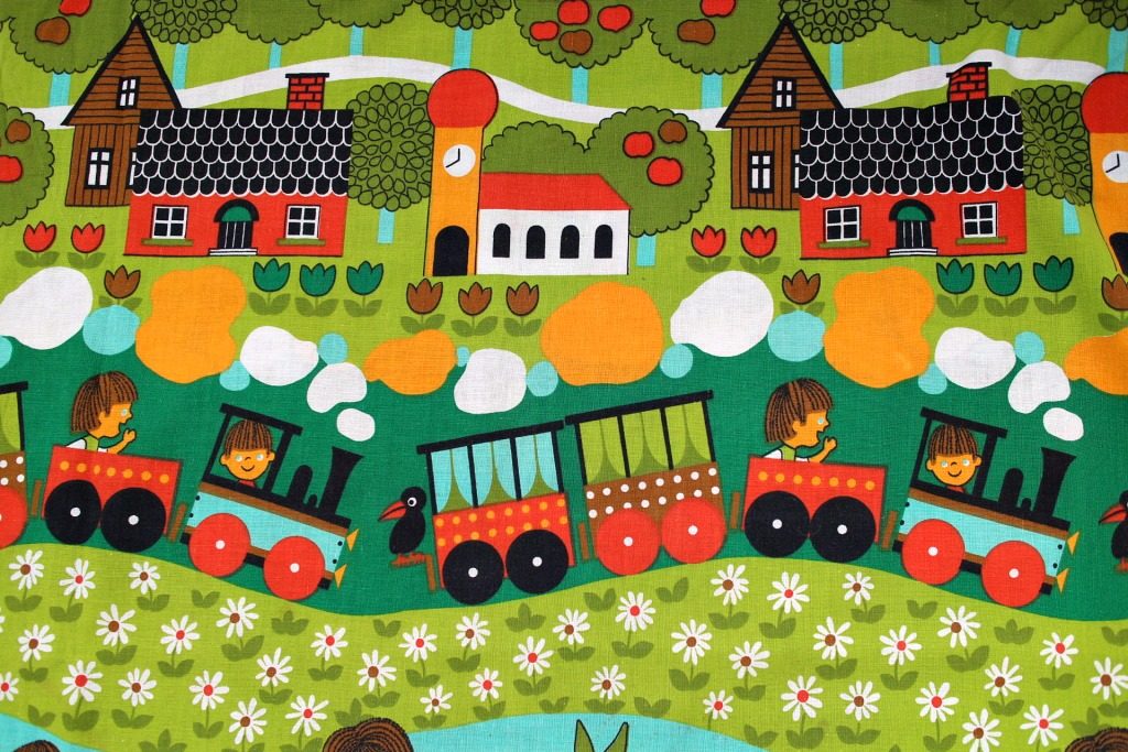 機関車に乗ったりダックにまたがって水遊びを楽しむ愉快な子供たちが描かれた、ノスタルジックなこども柄ヴィンテージファブリック。