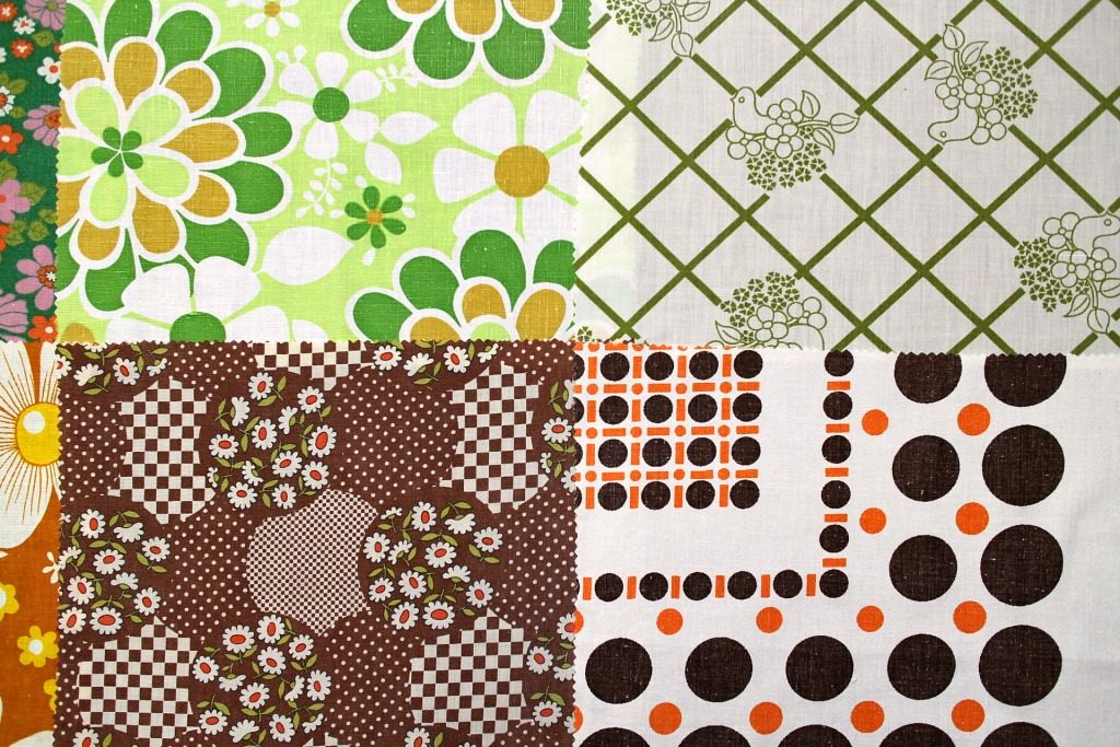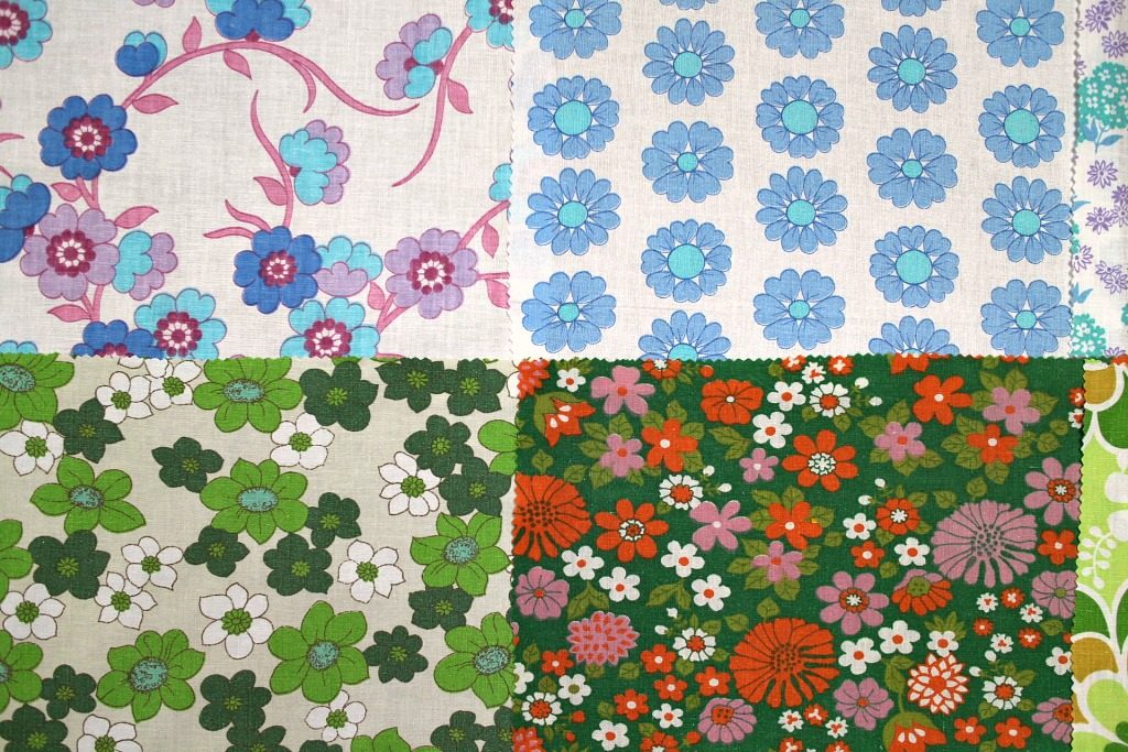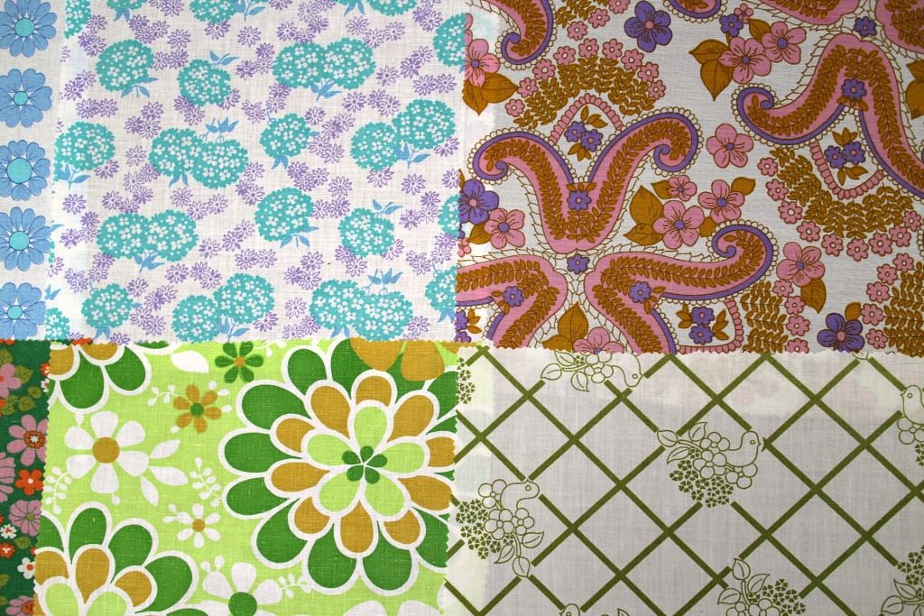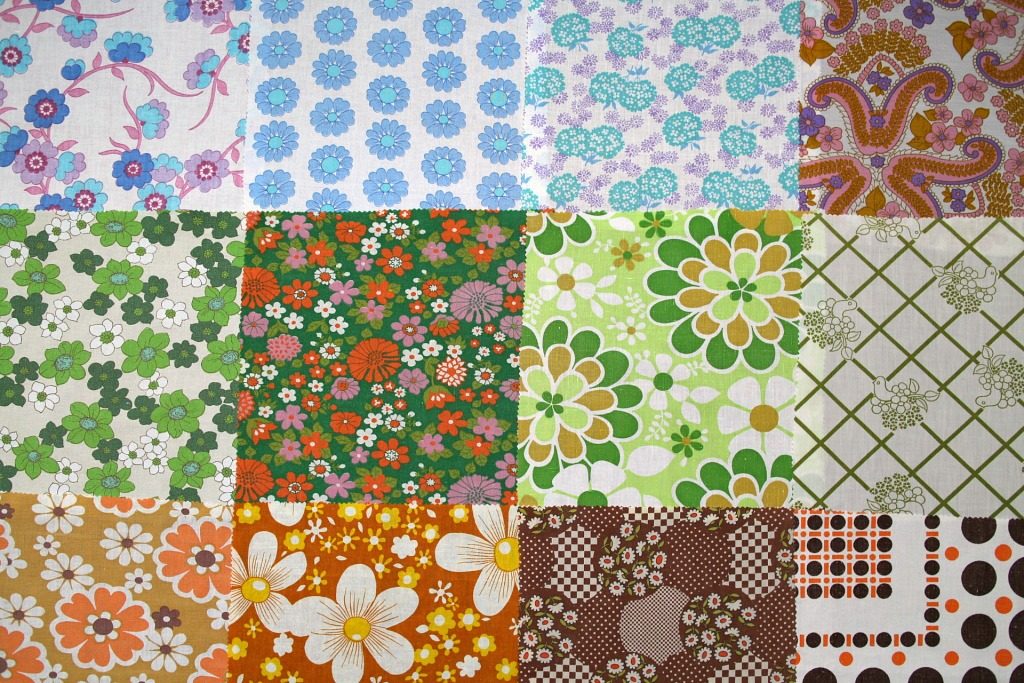 パッチワーク風やサイケ風花柄を含むレトロな風合いたっぷりのヴィンテージカットクロス12枚セット。