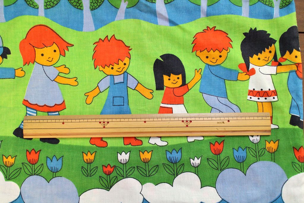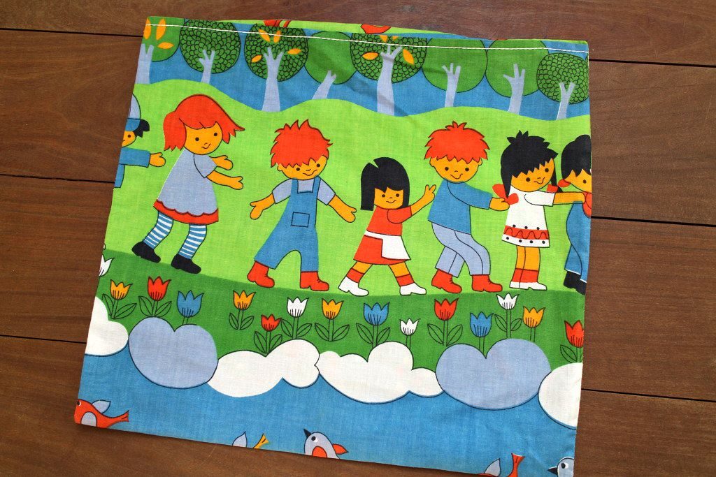子どもたちが仲良く連なる楽しい絵柄の入ったレトロなクッションカバー。