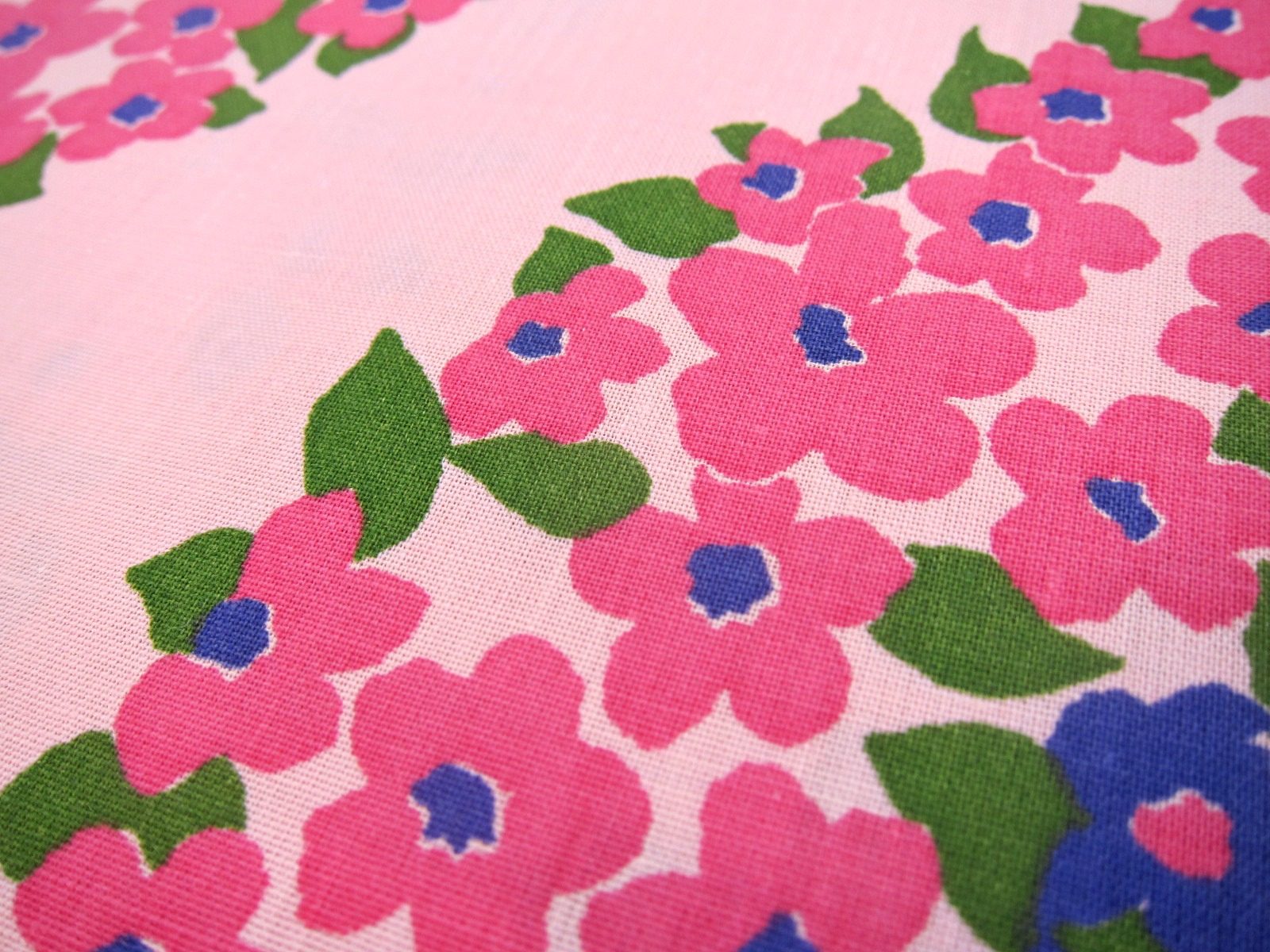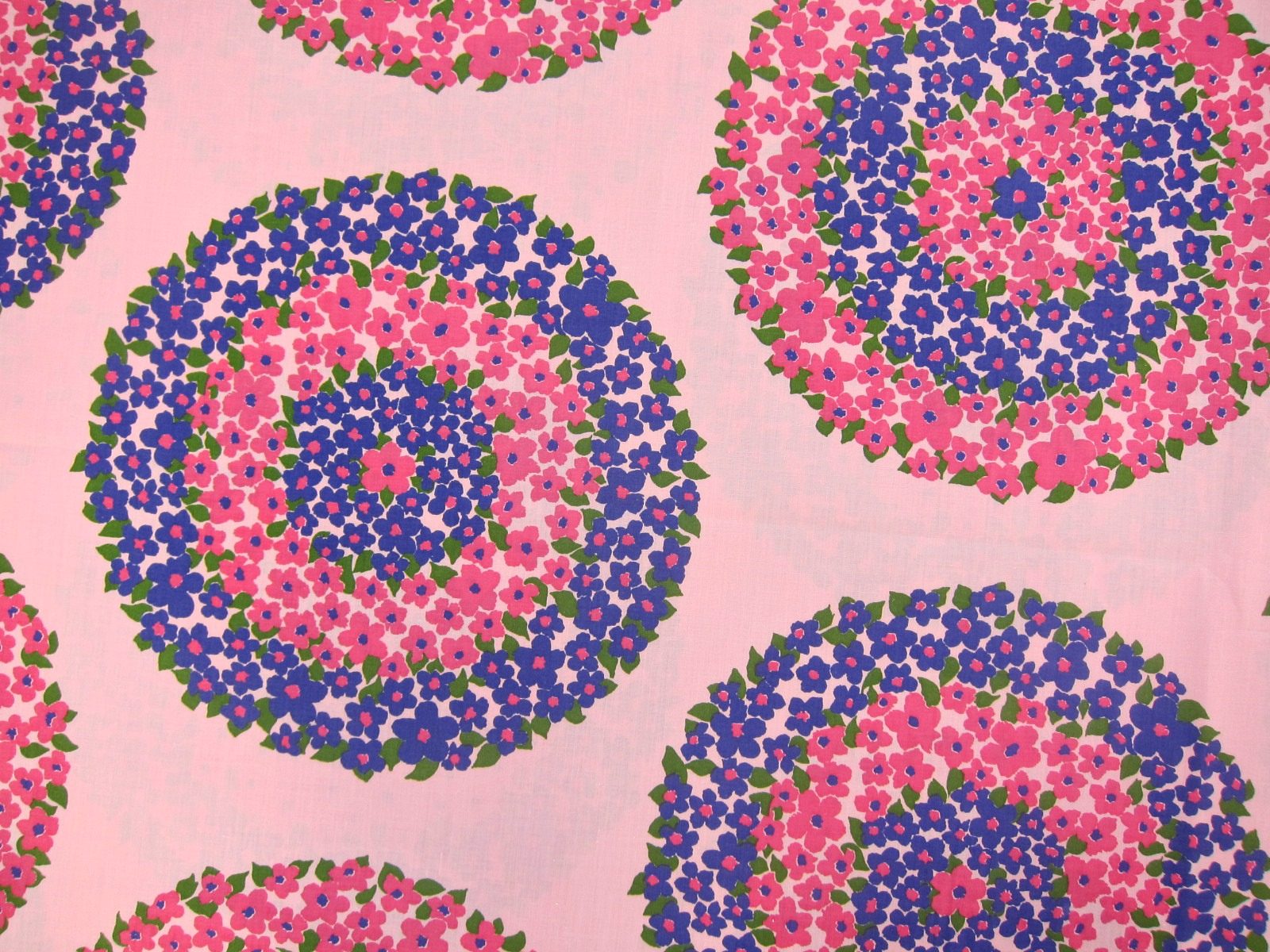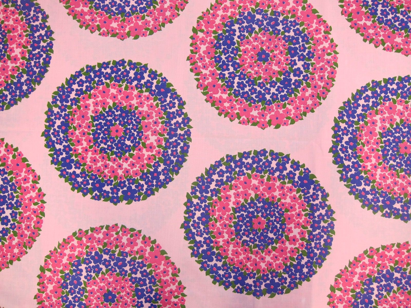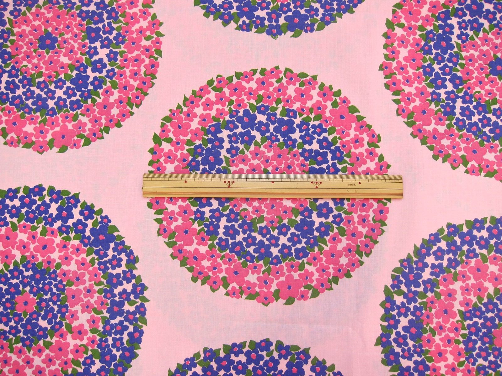 ピンクや紫色で大きなお花の輪が描かれた70年代のヴィンテージ生地。 新品未使用のデッドストック品で、素材はコットン50%、ポリエステル50%です。