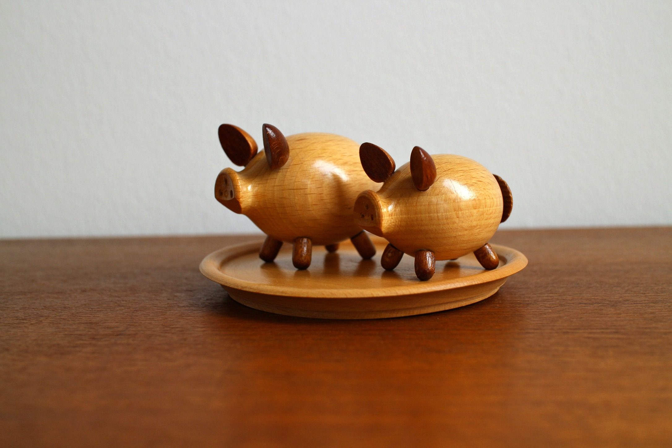 大小2匹のブタがトレーに乗ったレトロな木製塩胡椒入れ。