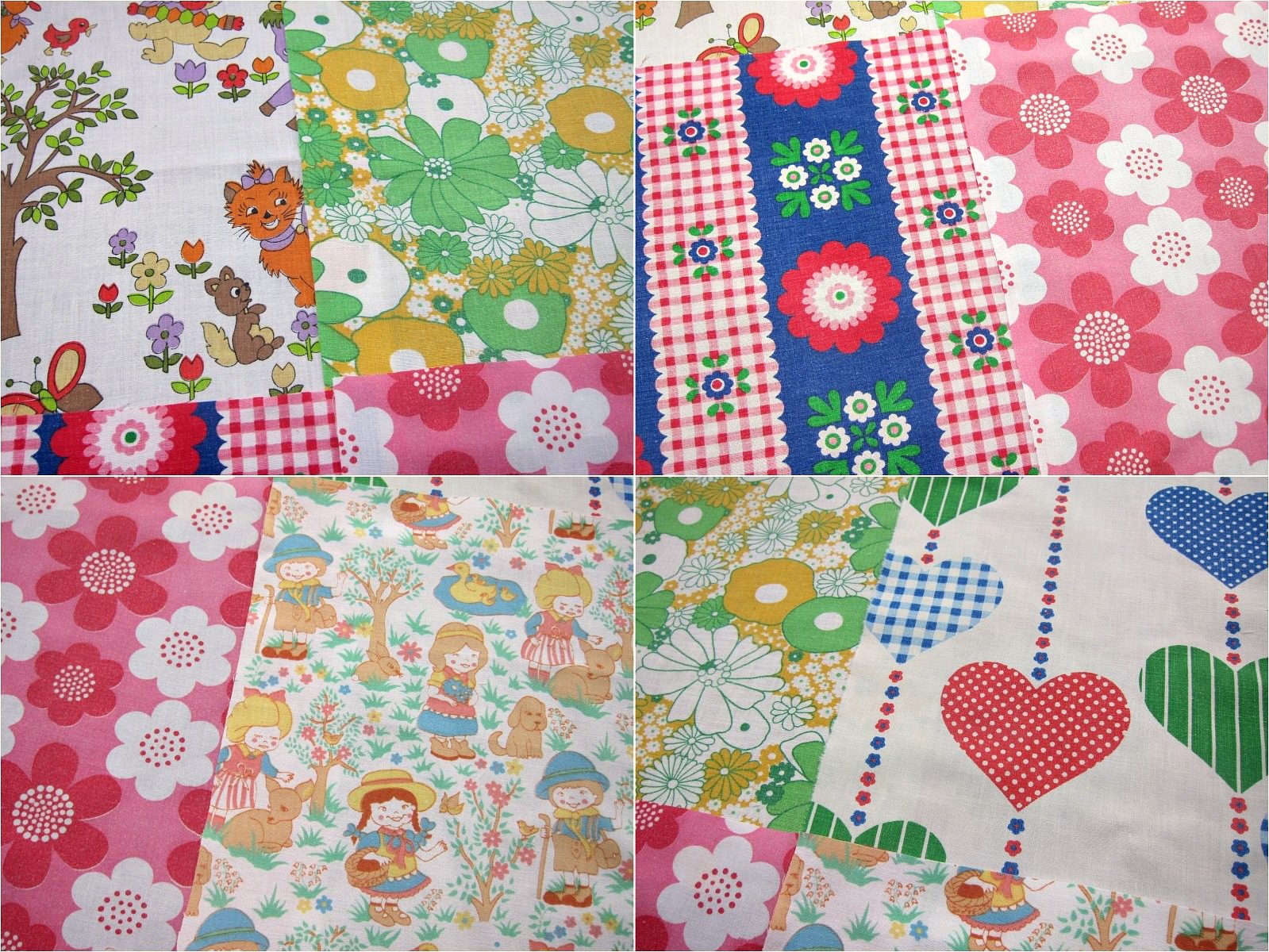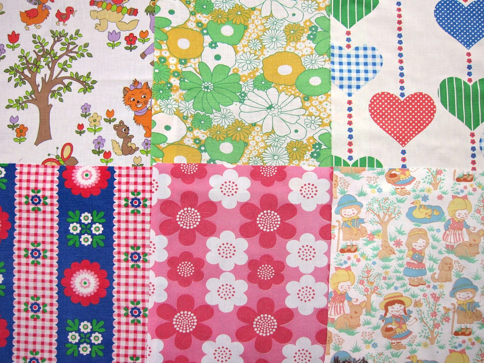 ドイツの子ども柄や、カラフルでレトロな70年代のヴィンテージ生地を6枚セットにしました。 ピンク、グリーン、ブルー系など、楽しい色使いのものばかりです。