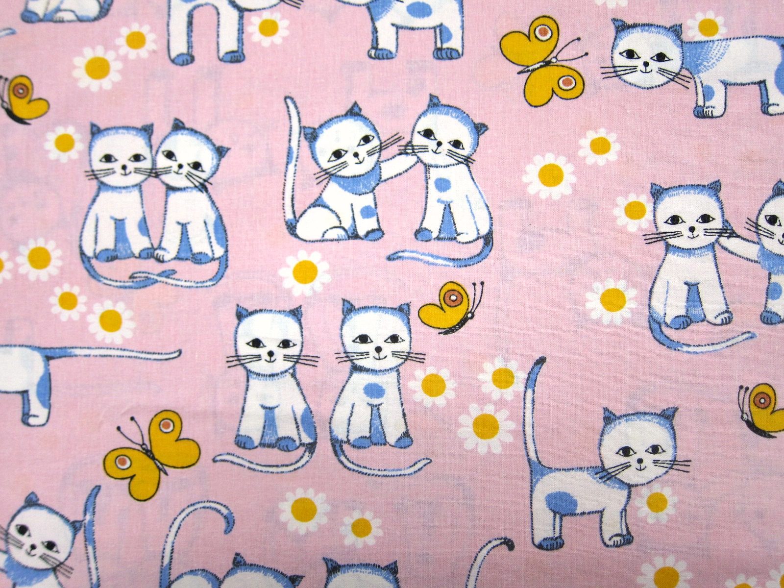 DDR時代のヴィンテージファブリック。 ピンク色のベースに、レトロでかわいい猫のイラストが描かれています。 子ネコの他にもお花や蝶々のモチーフも入っています。