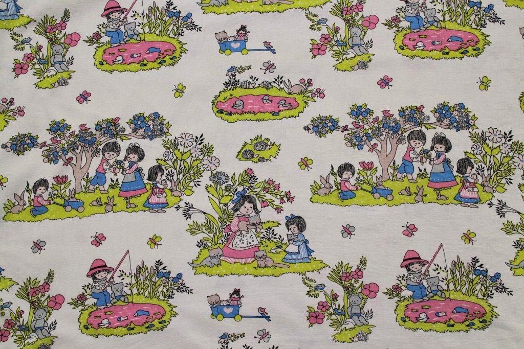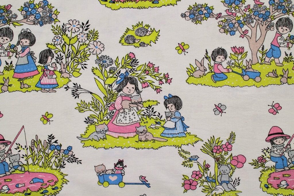 お人形やおもちゃなどを思い思いに抱えた男の子と女の子が楽しく遊ぶ様子が描かれたヴィンテージファブリック。お洋服やドレスがレトロな雰囲気いっぱい。