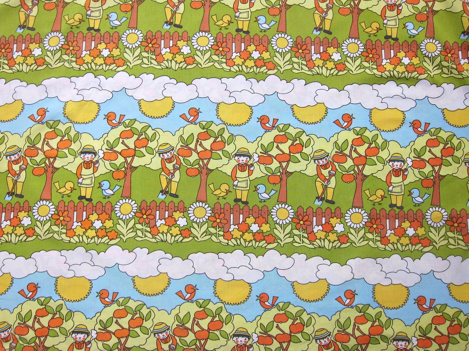 コンテンツにスキップリンゴ畑や男の子、小鳥に太陽など、かわいいイラストが連続で描かれた子ども柄ヴィンテージ生地。