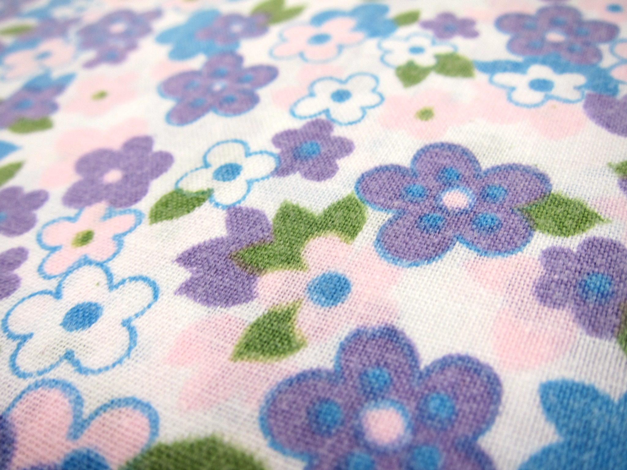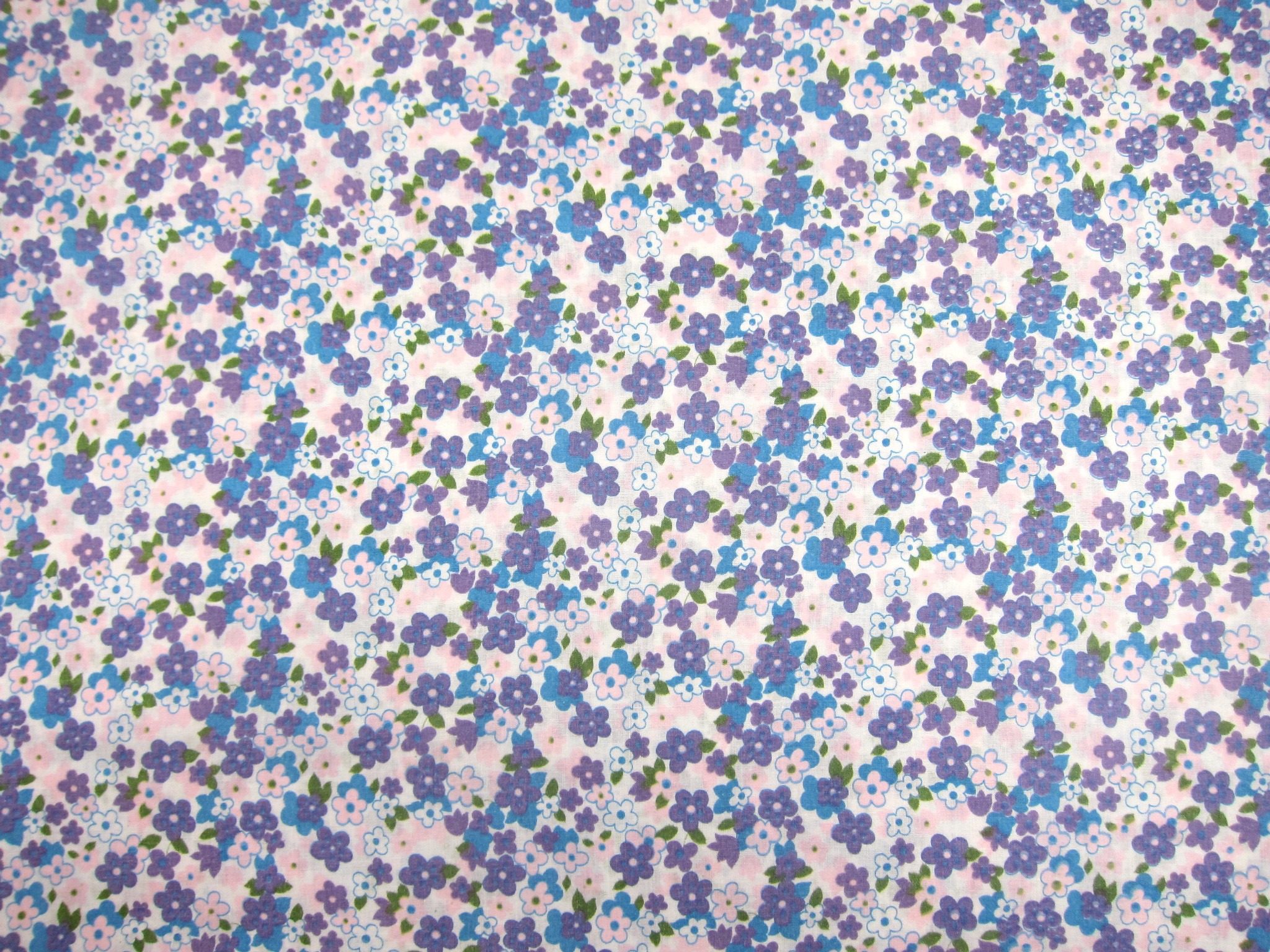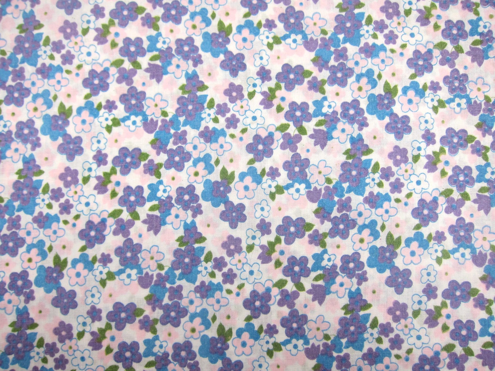 青、紫、ピンク、白の小柄な花柄が散りばめられたファブリックです。