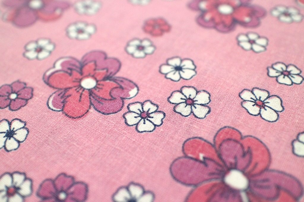 大小のキュートなお花が真っピンクの生地に散らばった、スウィートさ満点のデザイン。