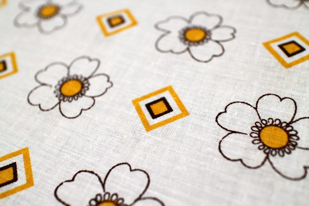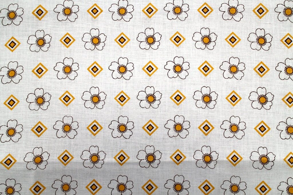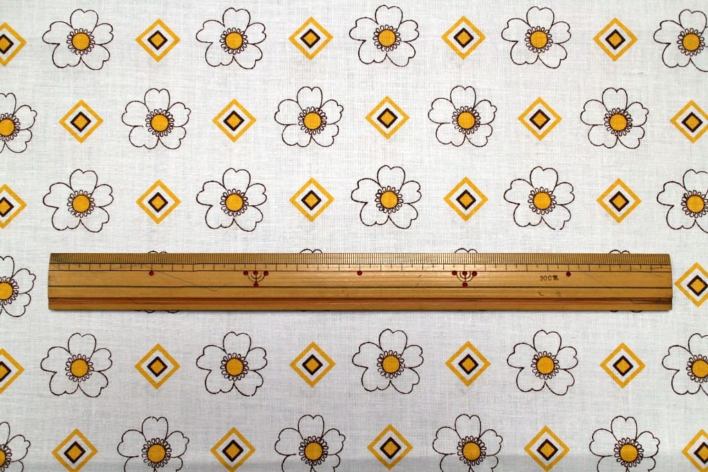 コンテンツにスキップおしとやかな花モチーフとジオメトリックな四角が並んだ真っ白なデッドストックヴィンテージファブリック。
