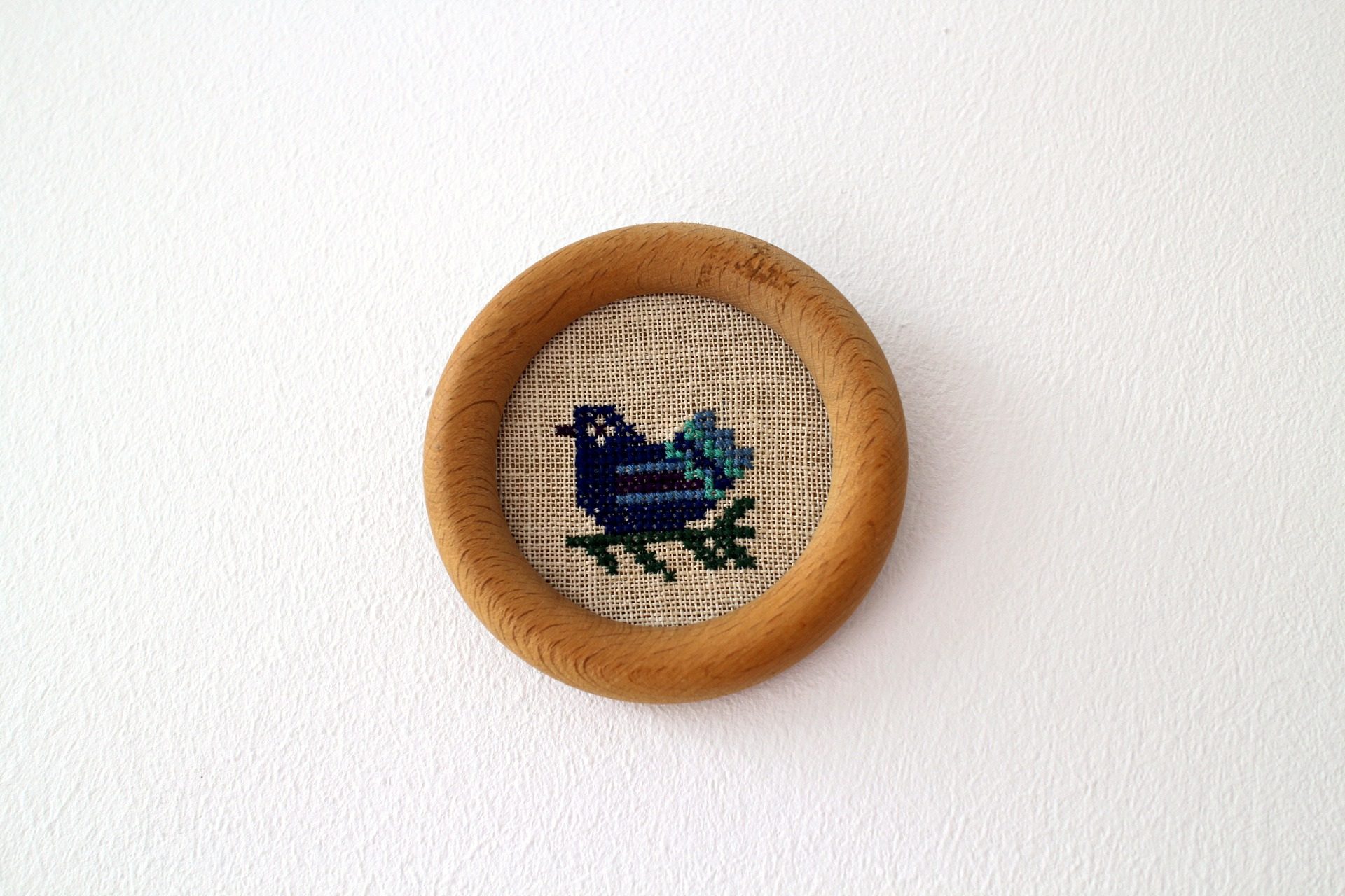 青い小鳥の刺繍が入った壁掛けタイプのヴィンテージクロスステッチ。 ガラス無しの木製フレームに入っています。 コロンとした丸いフォルムが温かみのあるレトロな味わい。 ナチュラル系インテリアにぴったりです。