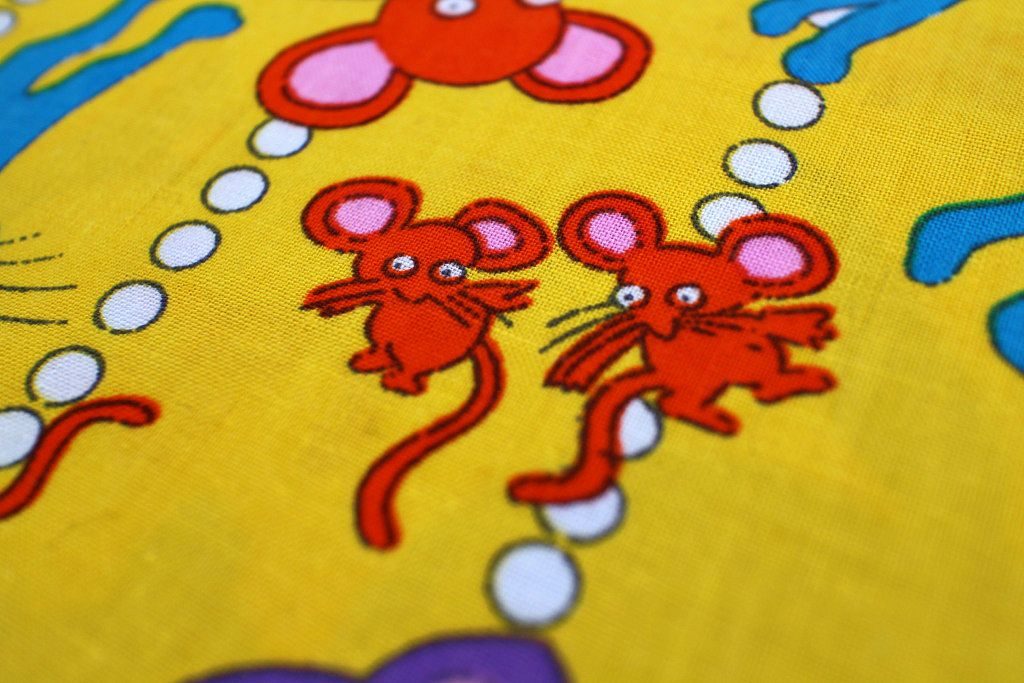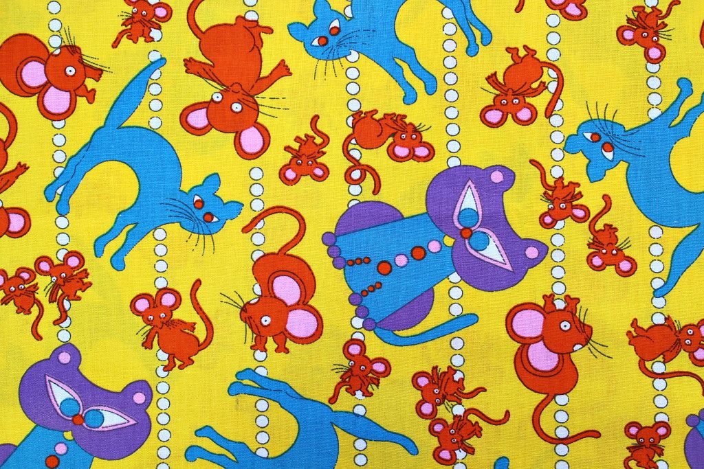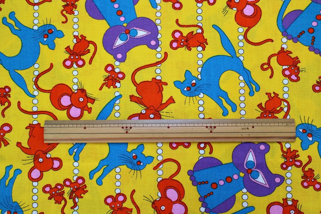 青猫&ねずみたちがコミカルなタッチで描かれたマスタード色レトロファブリック。