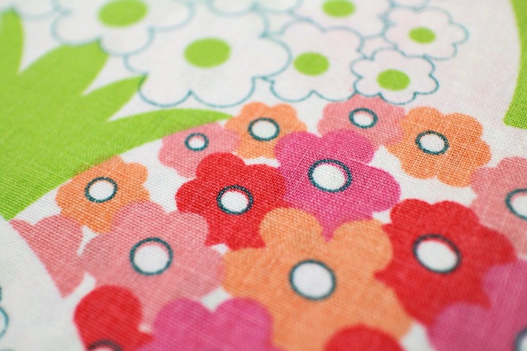 ピンクや赤のキュートなお花とホワイト&グリーンのシンプルなお花がモチーフとなった色合せの楽しいノスタルジックなデザイン。