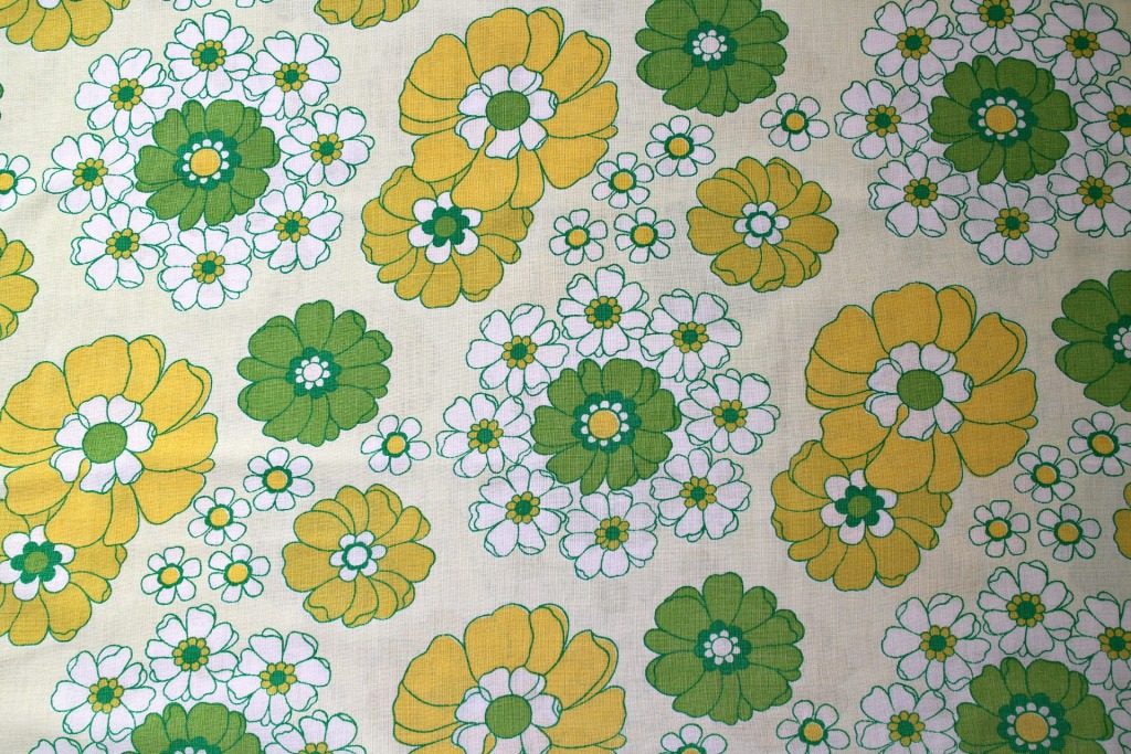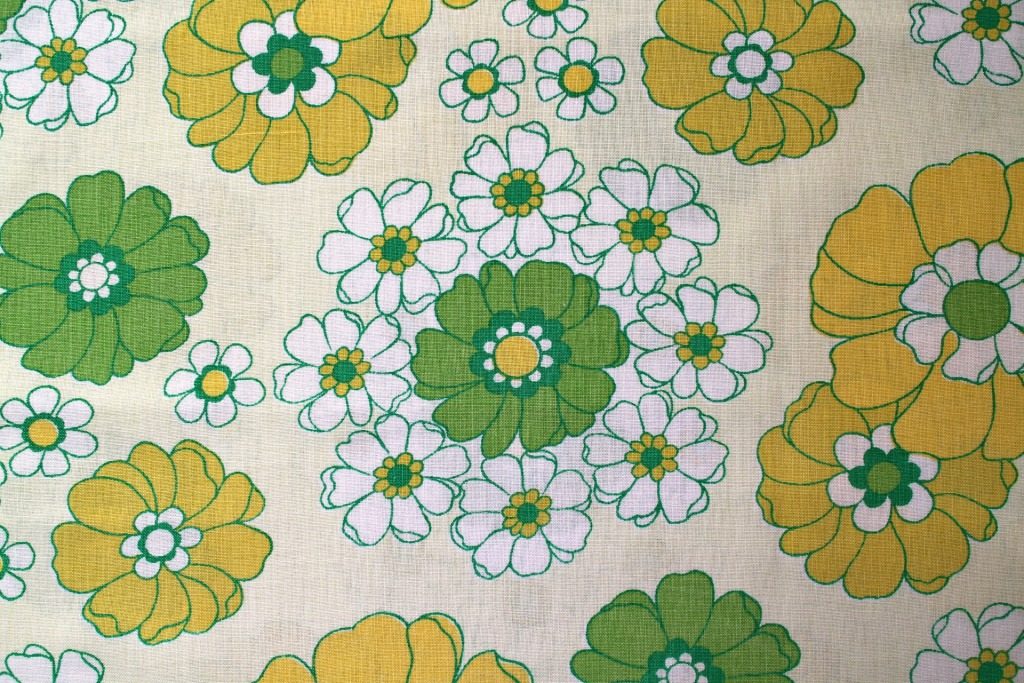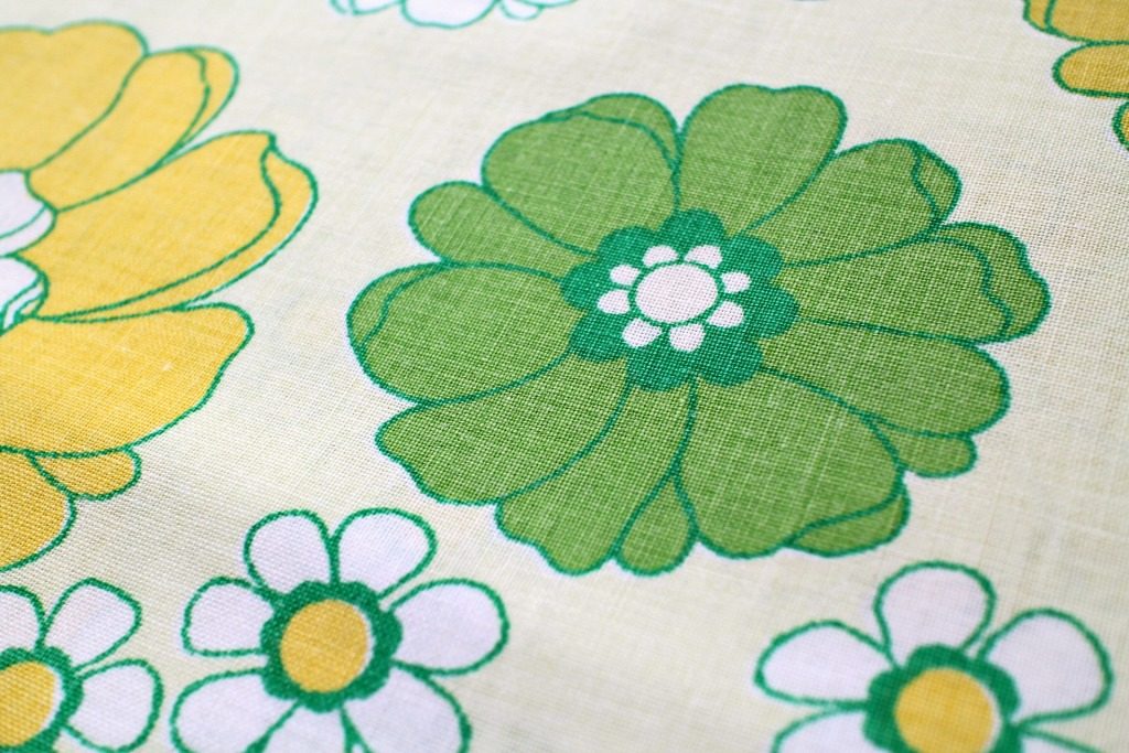 イエロー&グリーンのぬくもりカラーがレトロ生地ならでは。