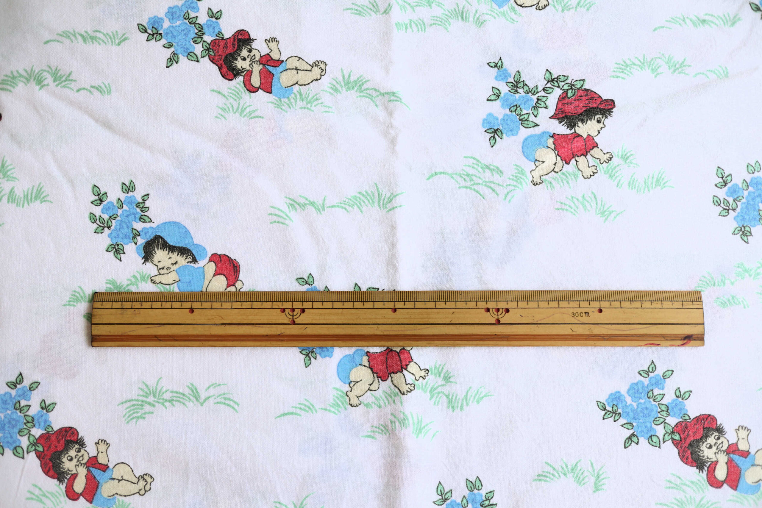 おむつ姿が可愛らしい、ほのぼのとした赤ちゃん柄DDRヴィンテージ生地。