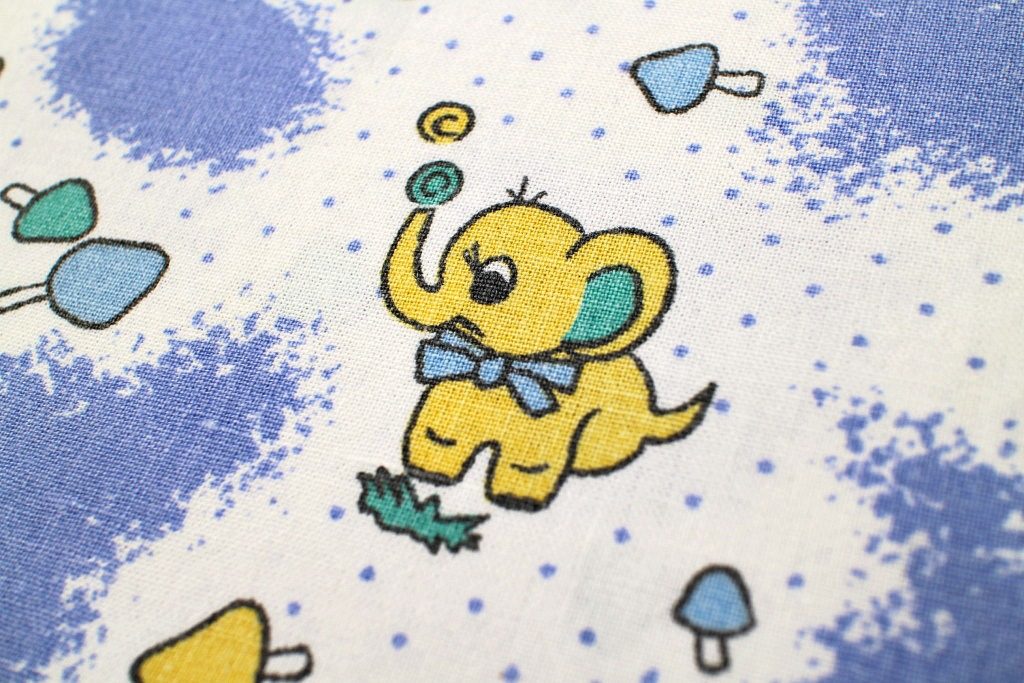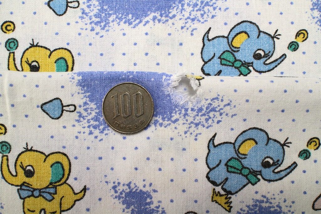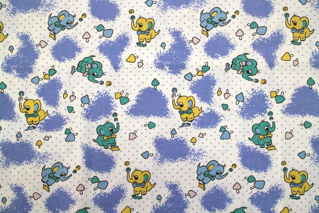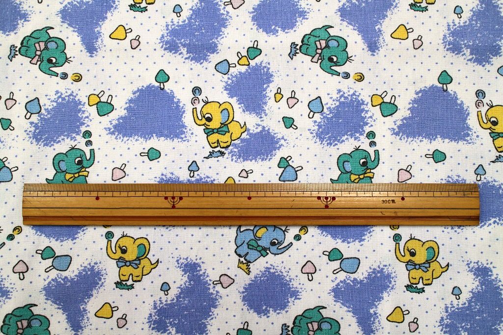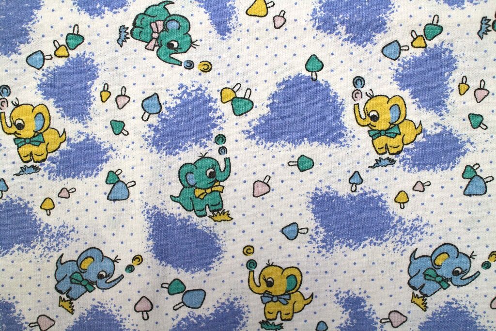 青・緑・黄色のゾウと三角きのこが描かれたレトロポップなコットン製ヴィンテージファブリック。
