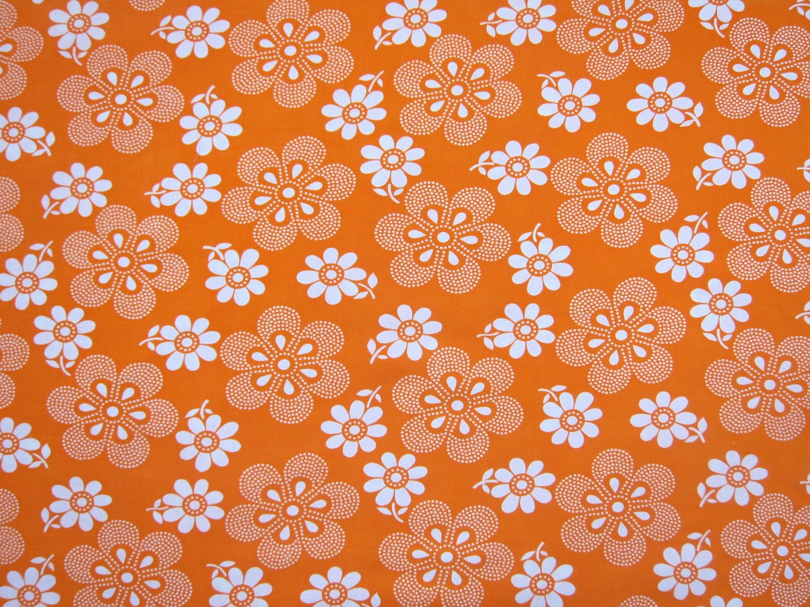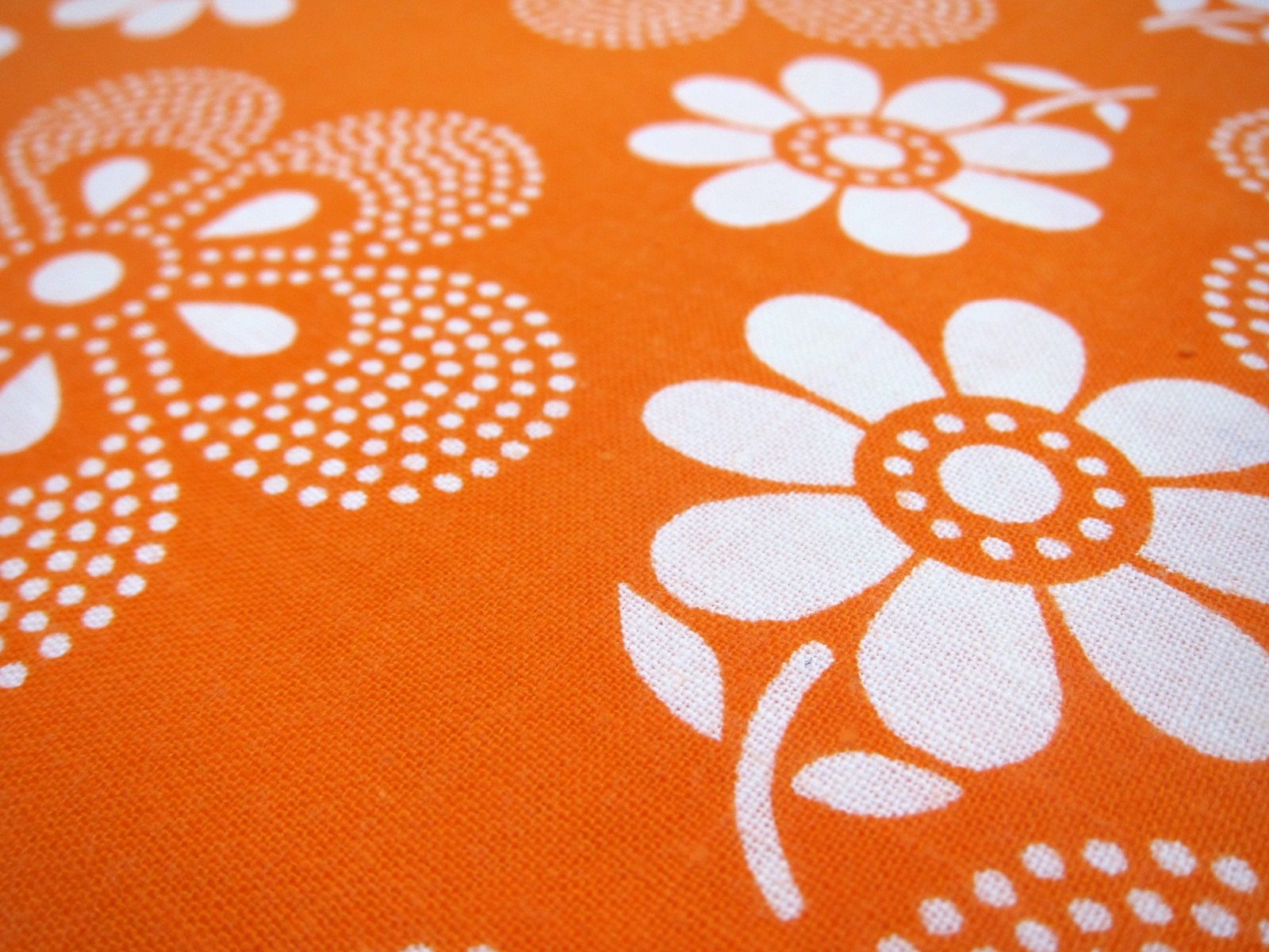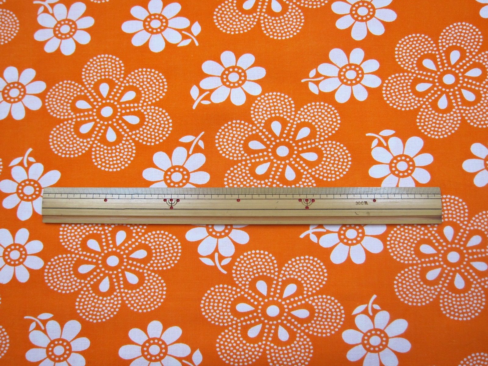明るいオレンジ色をした70年代のレトロファブリック。 かわいらしいお花のパターンが描かれています。 とても良いコンディションです。 ハンドメイドの材料などにお役立て下さい。