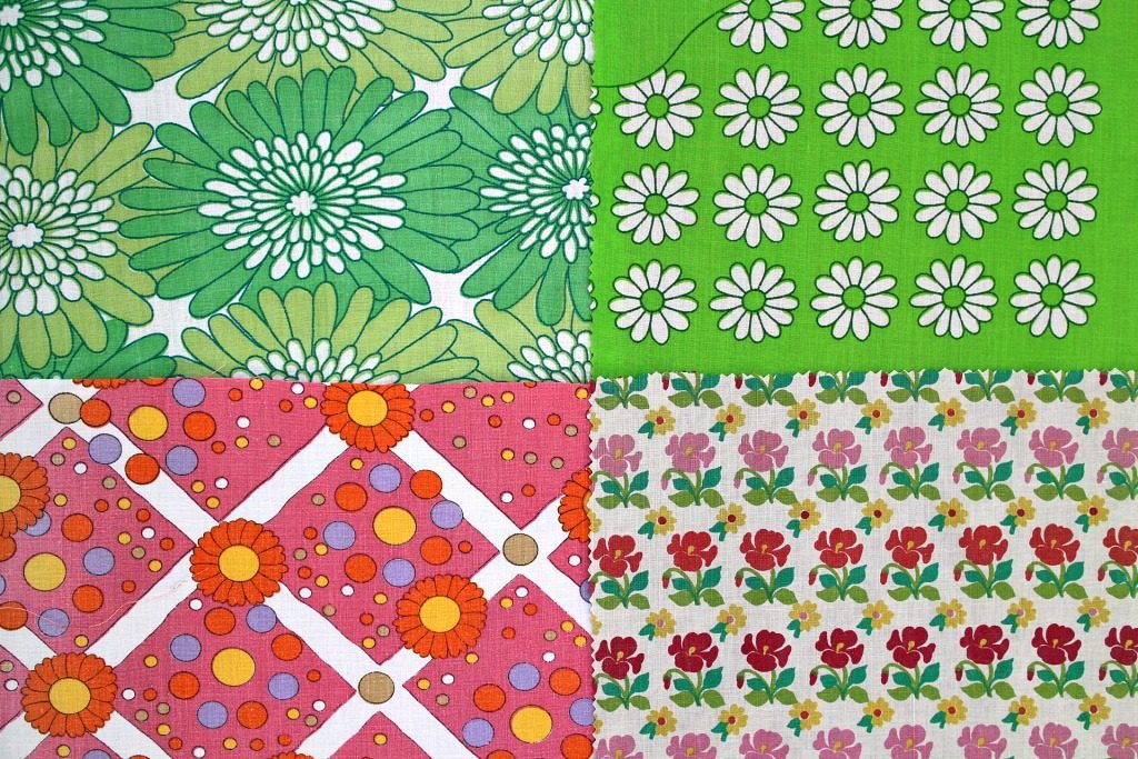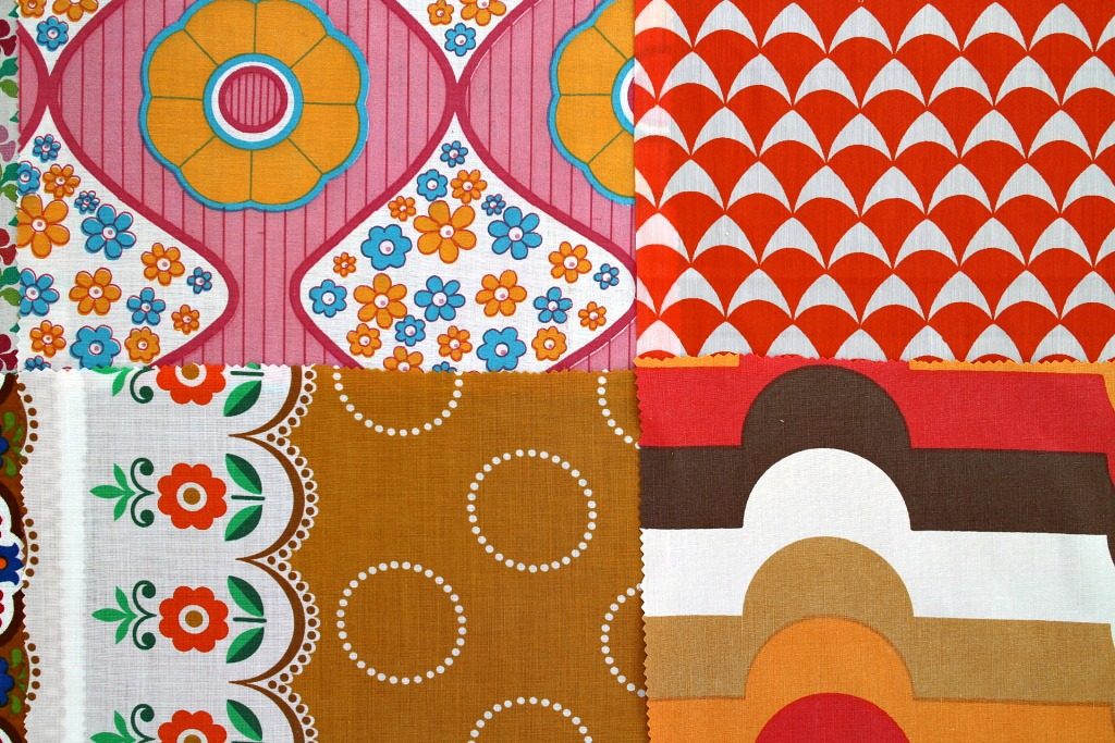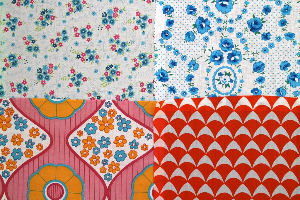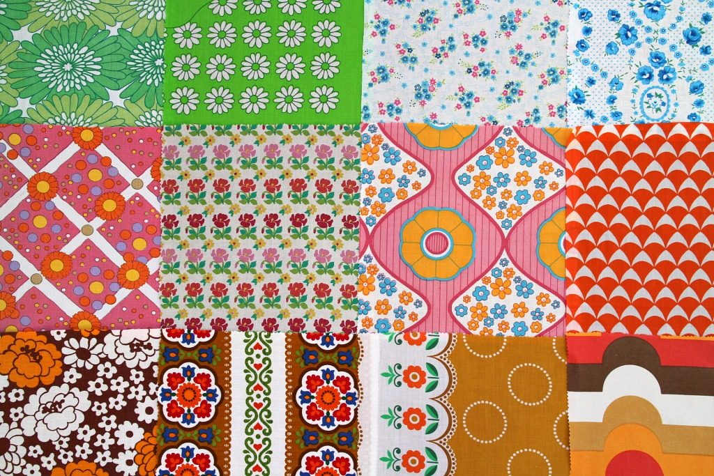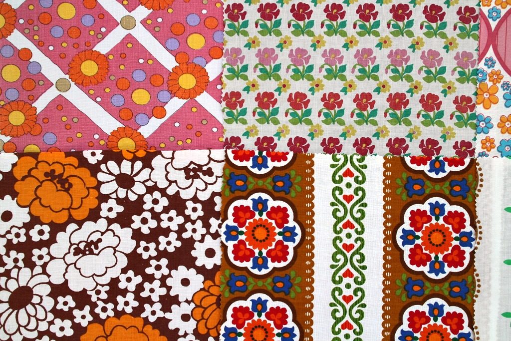 明るいカラー満載 レトロな花柄&幾何学模様ヴィンテージはぎれ12枚セット