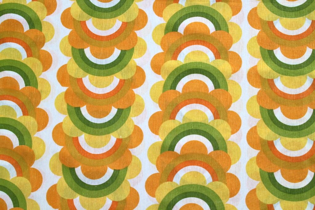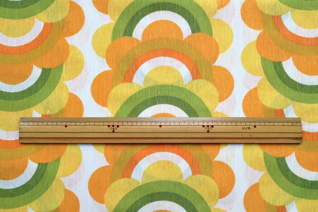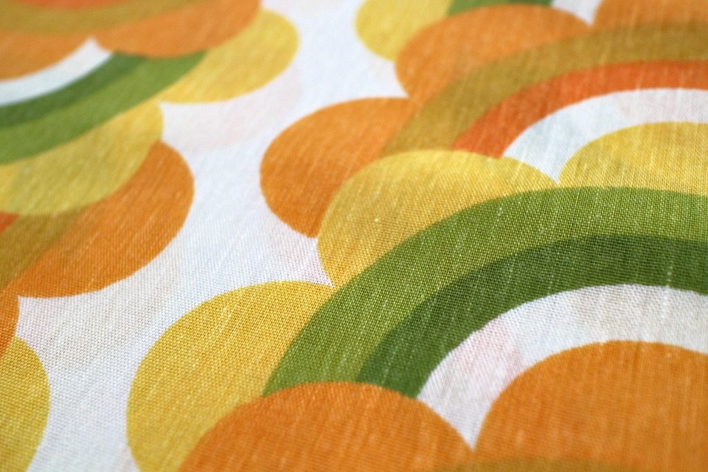 オレンジや黄色などウォームカラーの花モチーフが幾重にも重なったユニーク幾何学模様のヴィンテージファブリック。