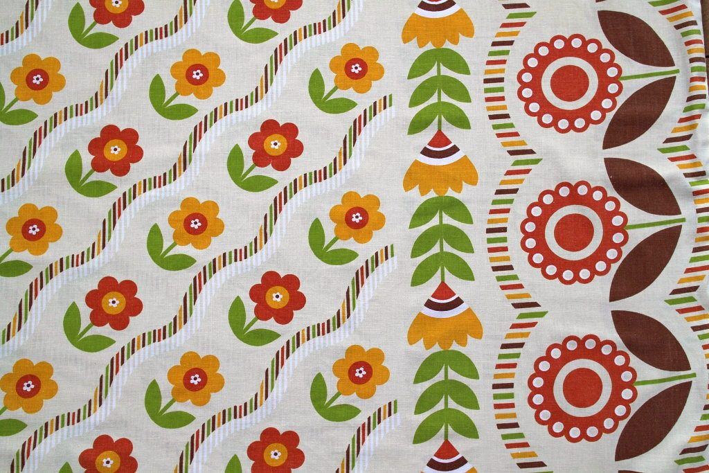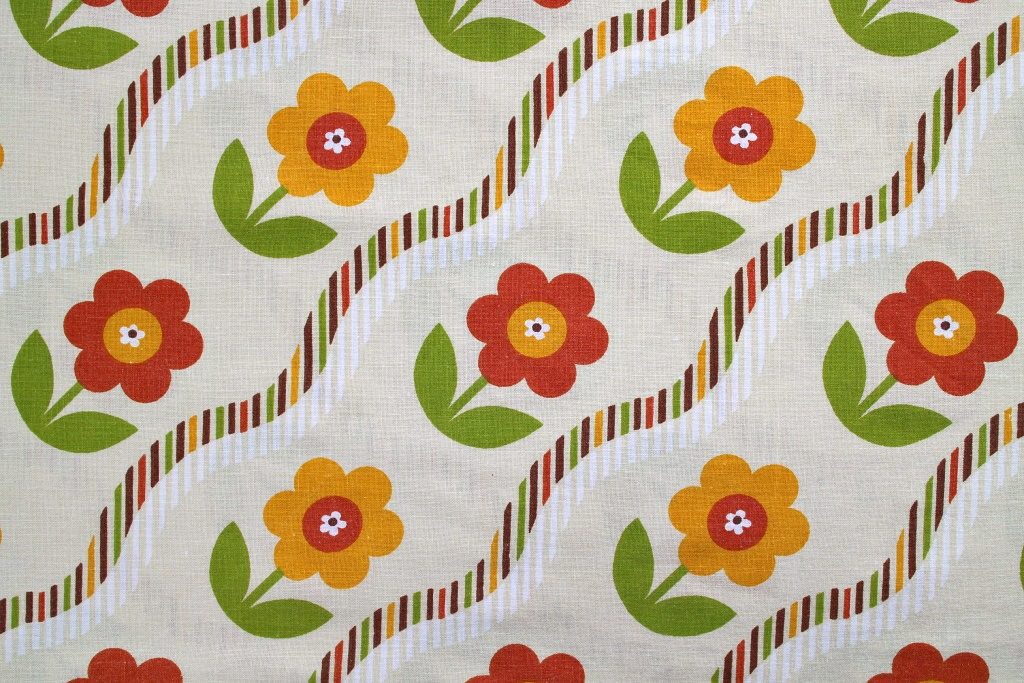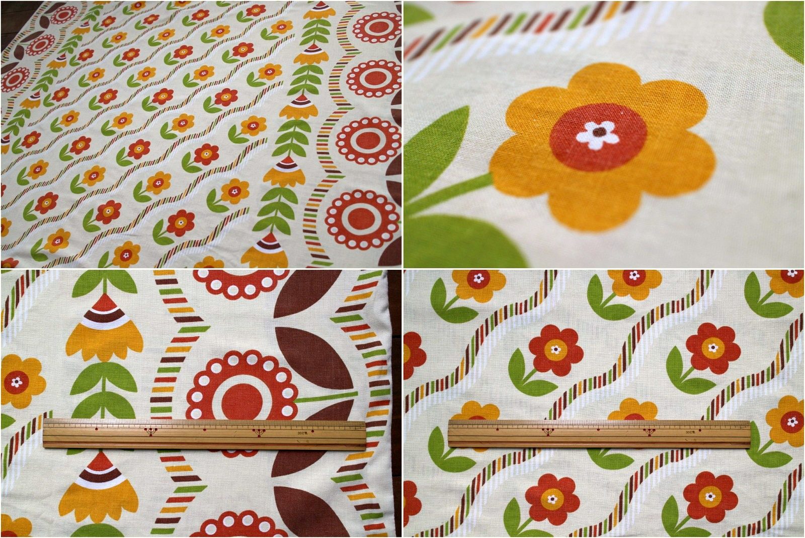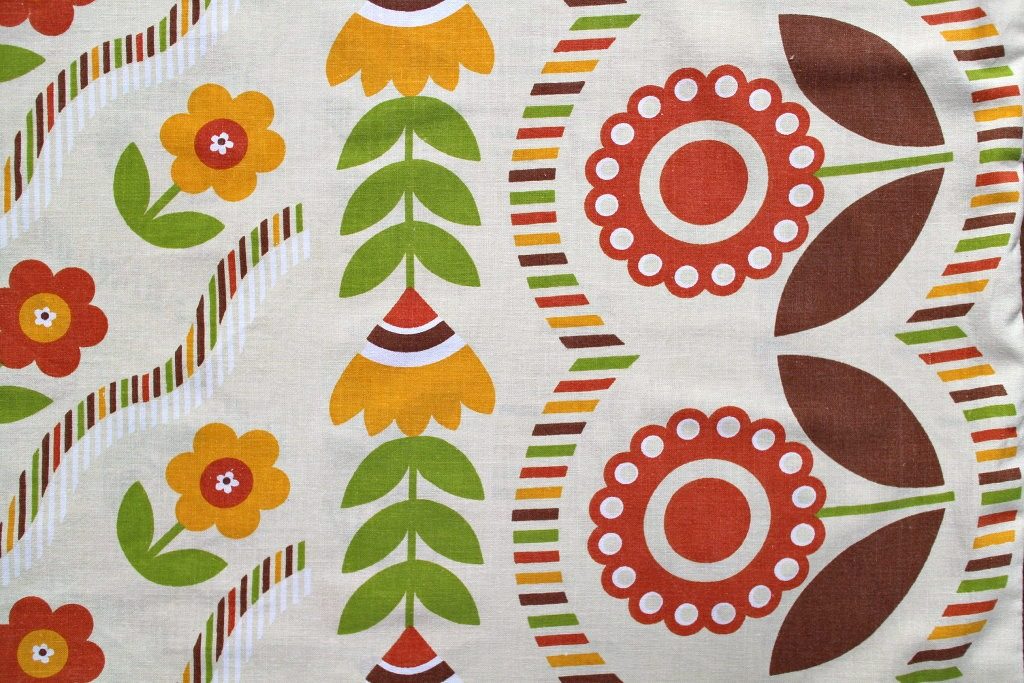 コンテンツにスキップオレンジ・イエロー・ブラウンなど温かみのある色合いがレトロ感いっぱいのコットン製ヴィンテージファブリック。