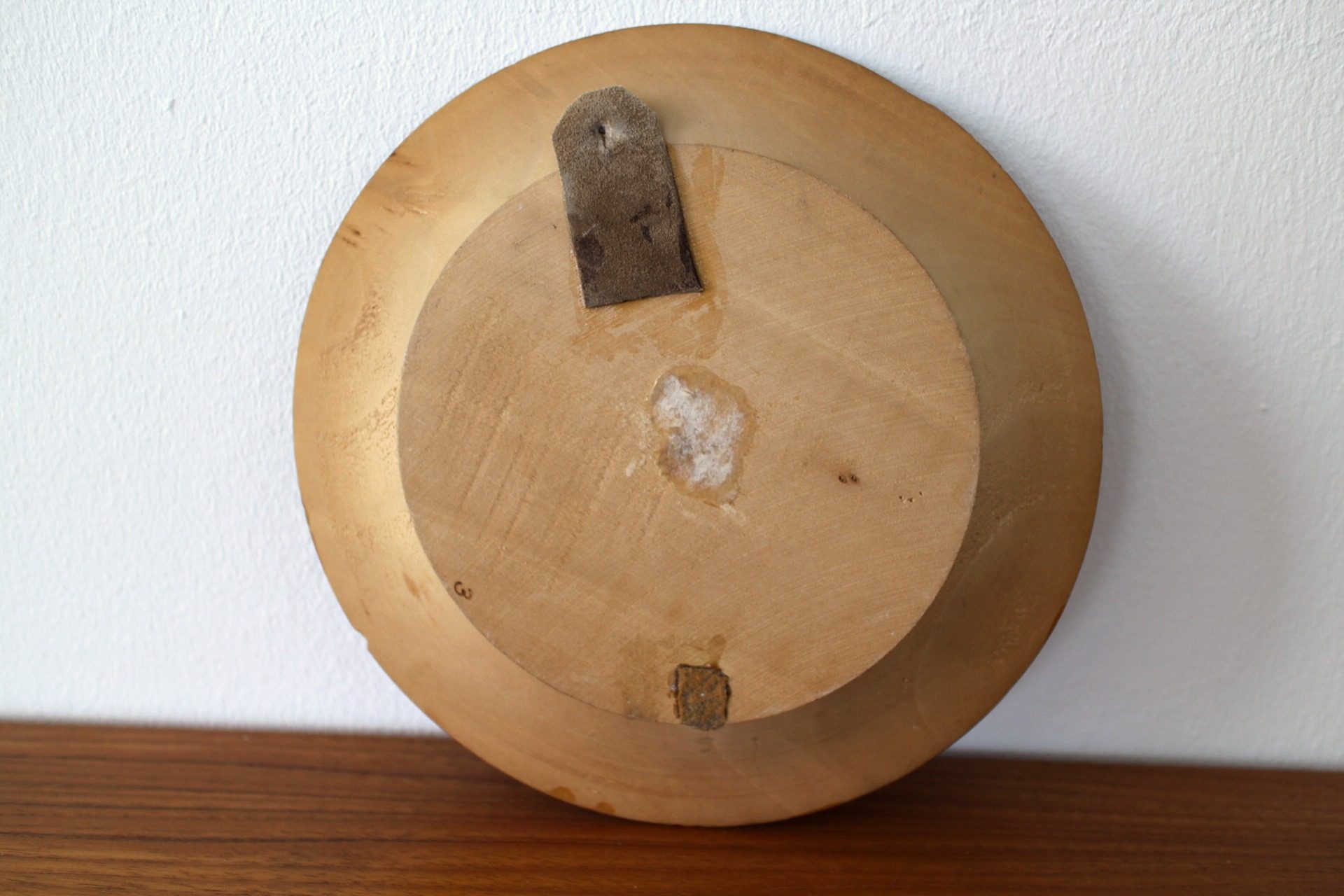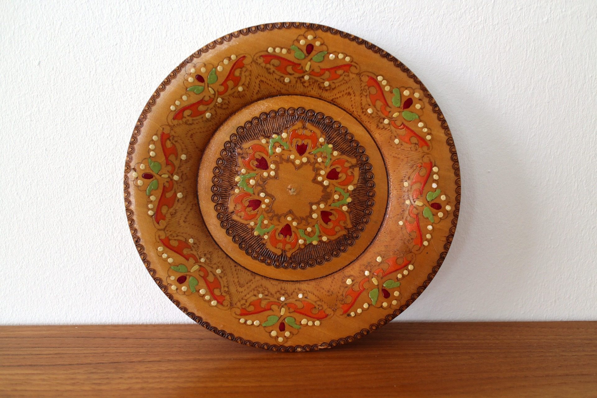 シンボル化された花模様や細やかなトリミングなど、ディテイルの凝った木彫のデザイン絵皿。 彩色された朱色やグリーンが東欧ならでは。 壁に掛けられるよう裏面にはフックがついています。 フォークロアなお部屋のアクセントに。