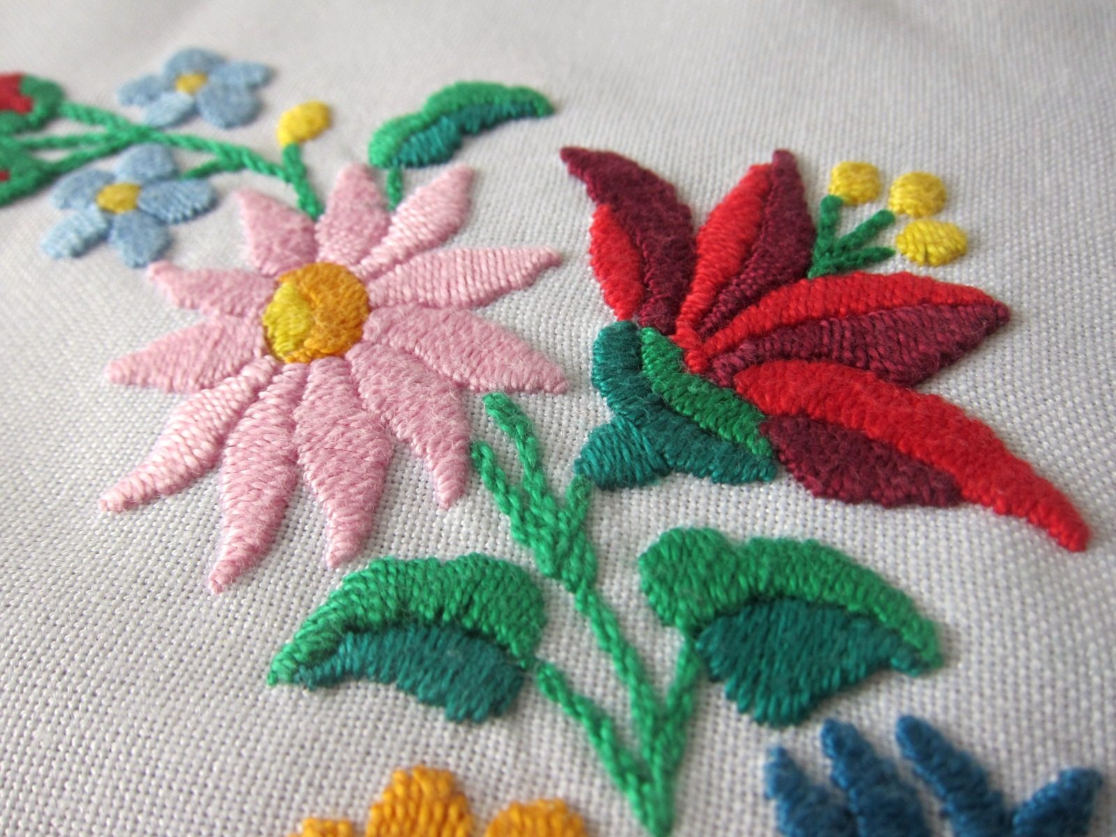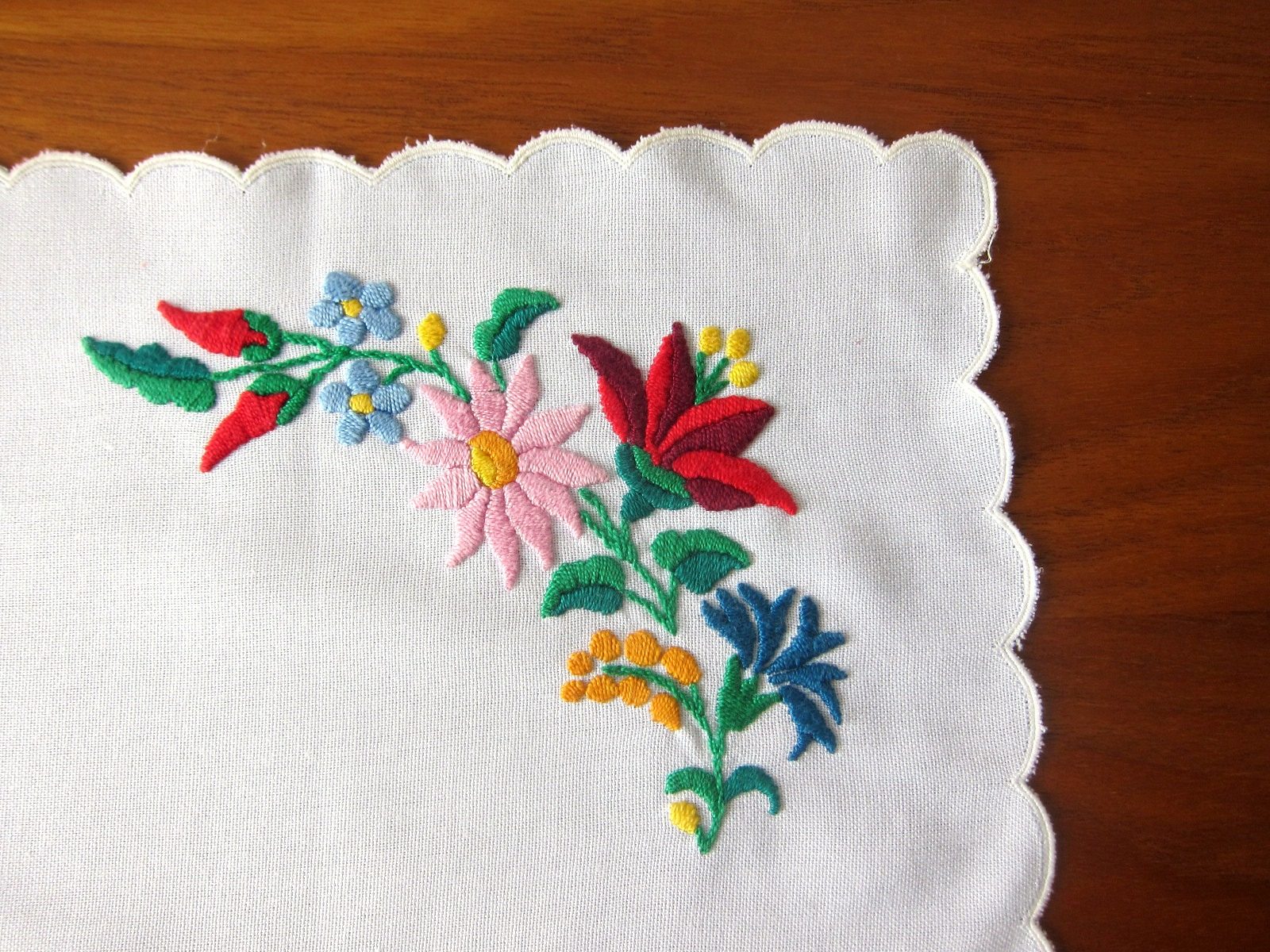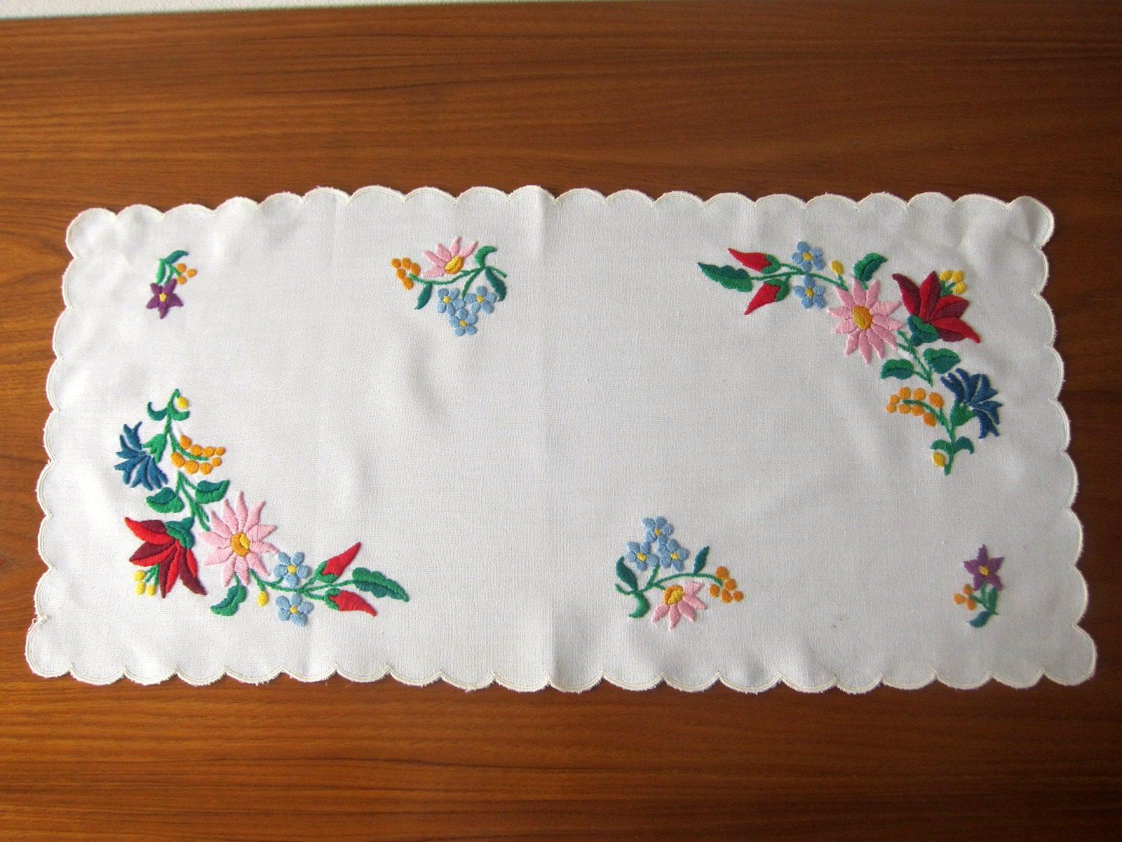 ウェーブ形の縁取りとバランス良く配置された美しいフラワー刺繍の、いかにも東欧らしいデザインが特徴の白いクロス。 食器棚の中やチェストの上などの上に敷いたり、タペストリーとして飾るのにオススメ。