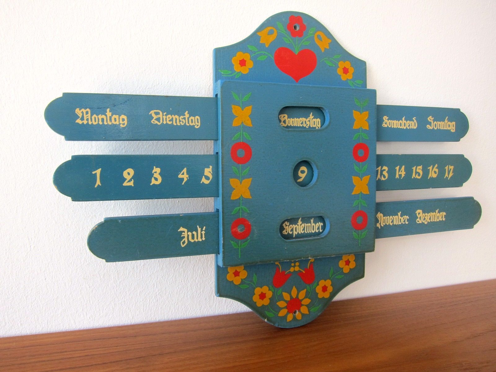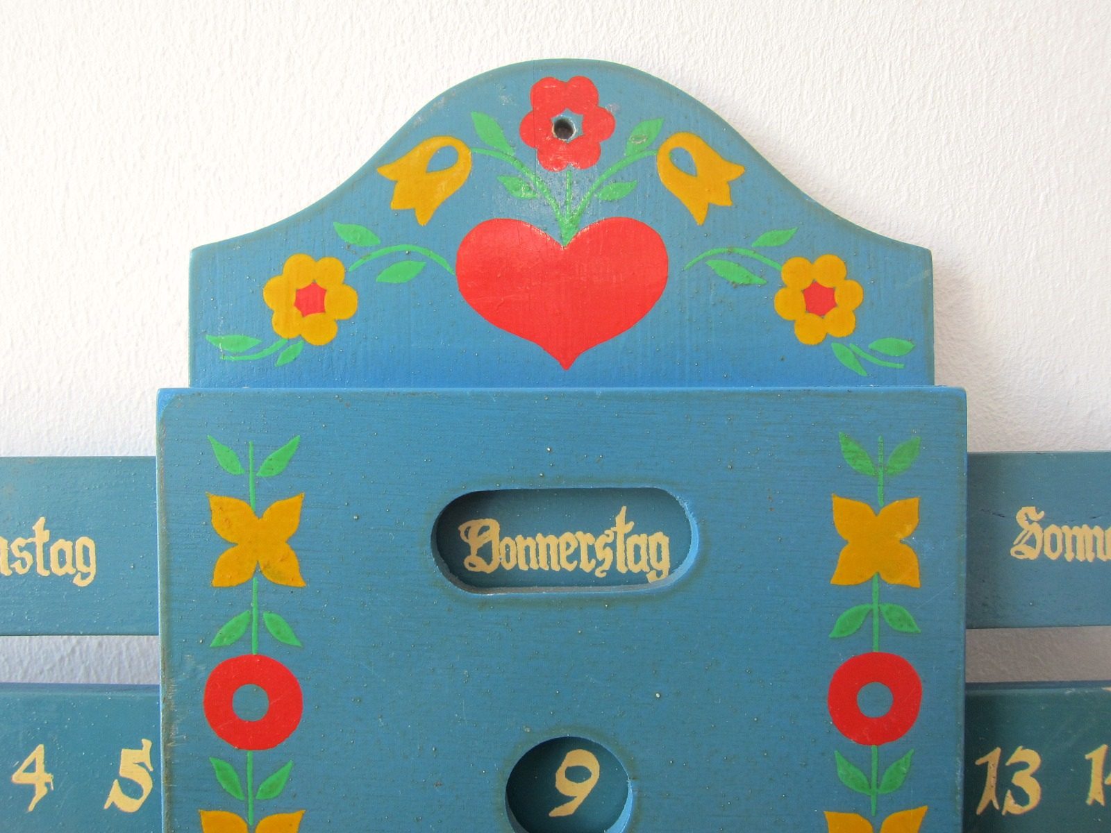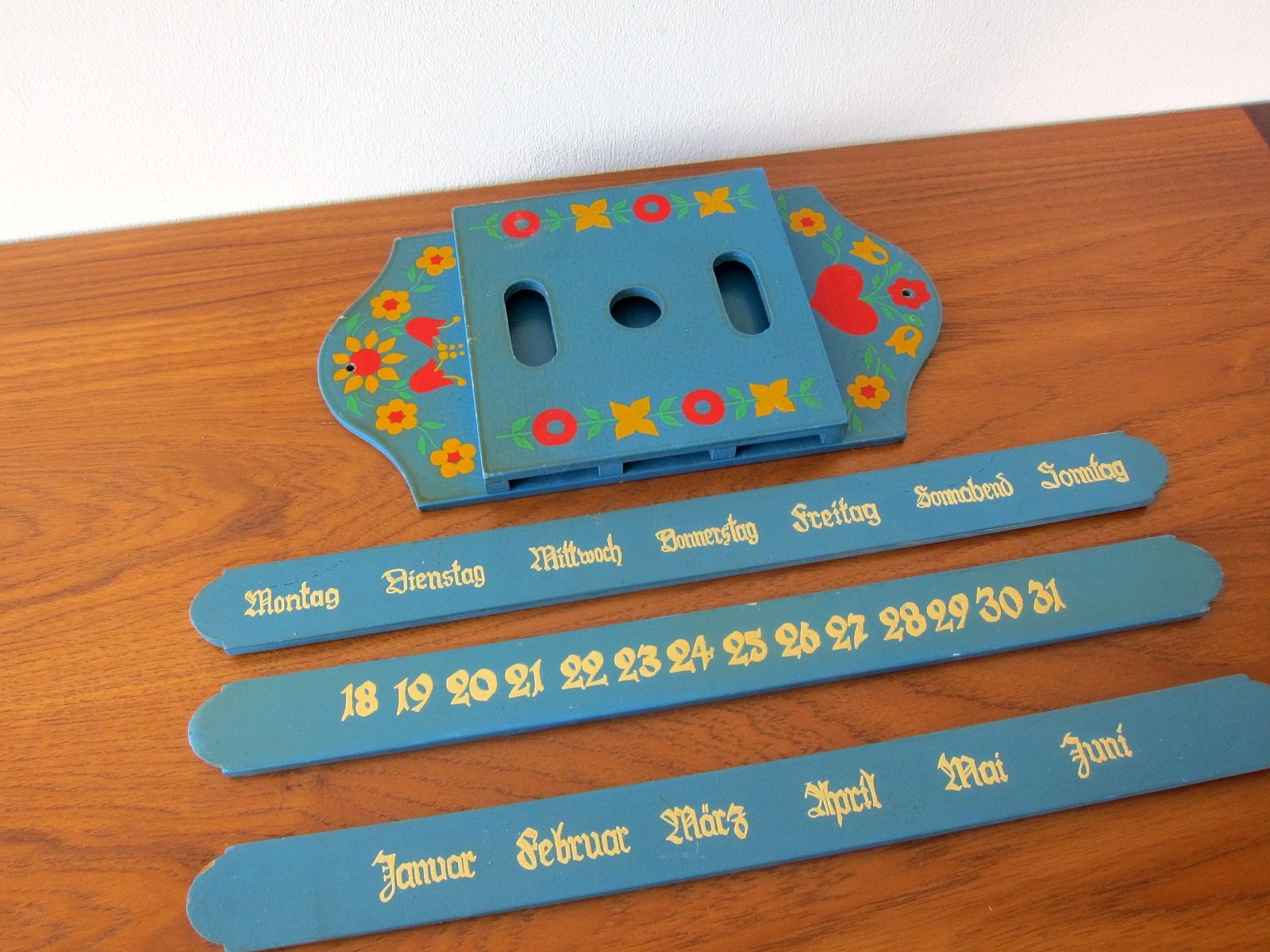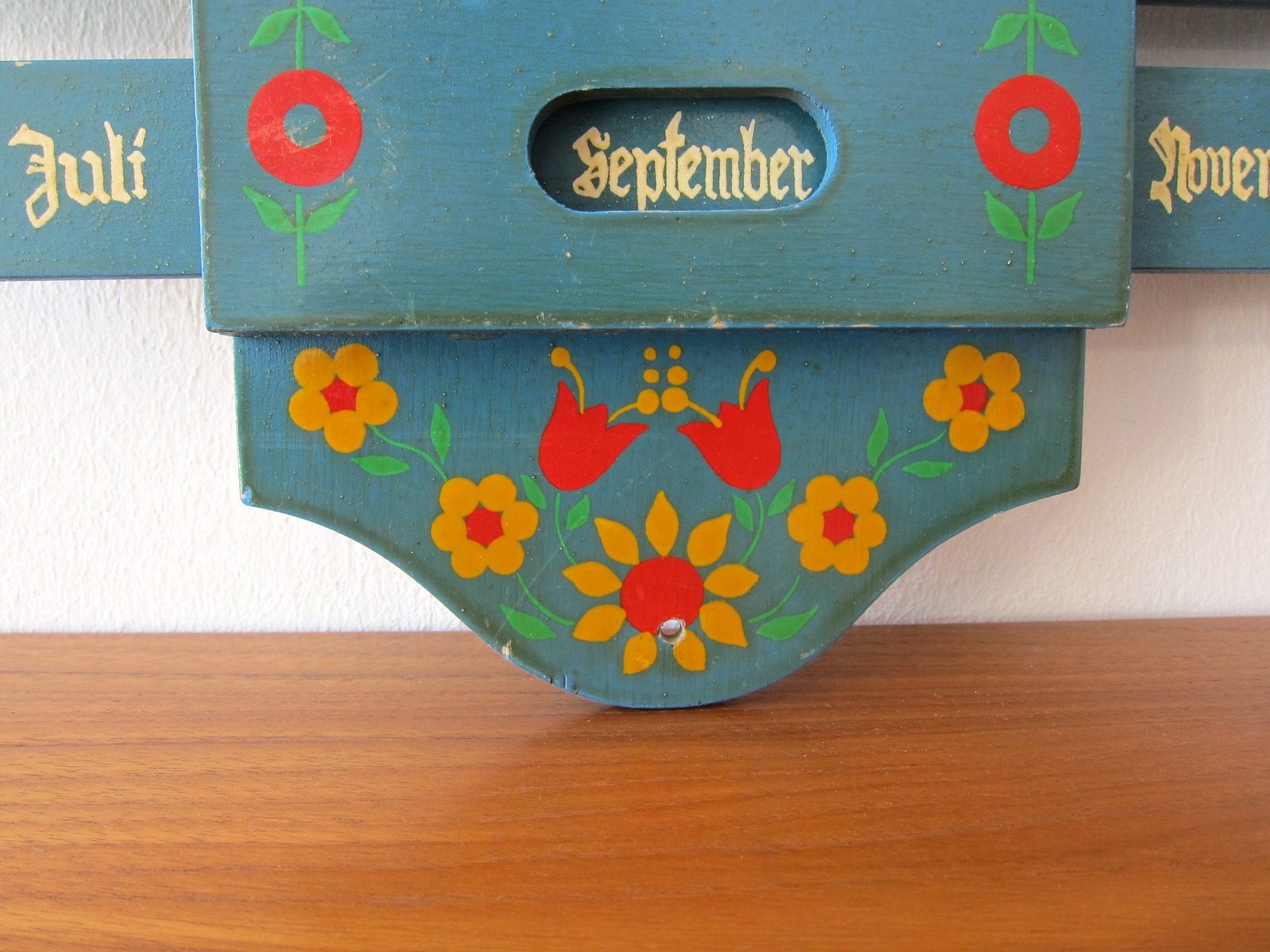 リューベックの蚤の市で見つけた木製の壁掛けカレンダー。 変わった作りをしており、手作り感とフォークロアな雰囲気が溢れるヴィンテージ雑貨です。 東欧チックなお花のモチーフが描かれています。