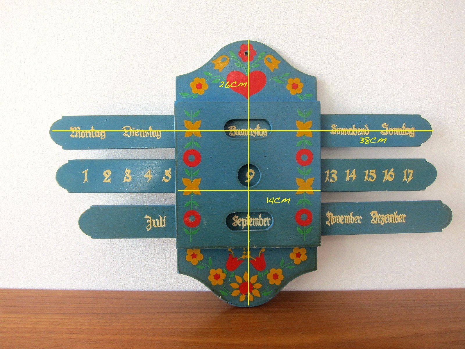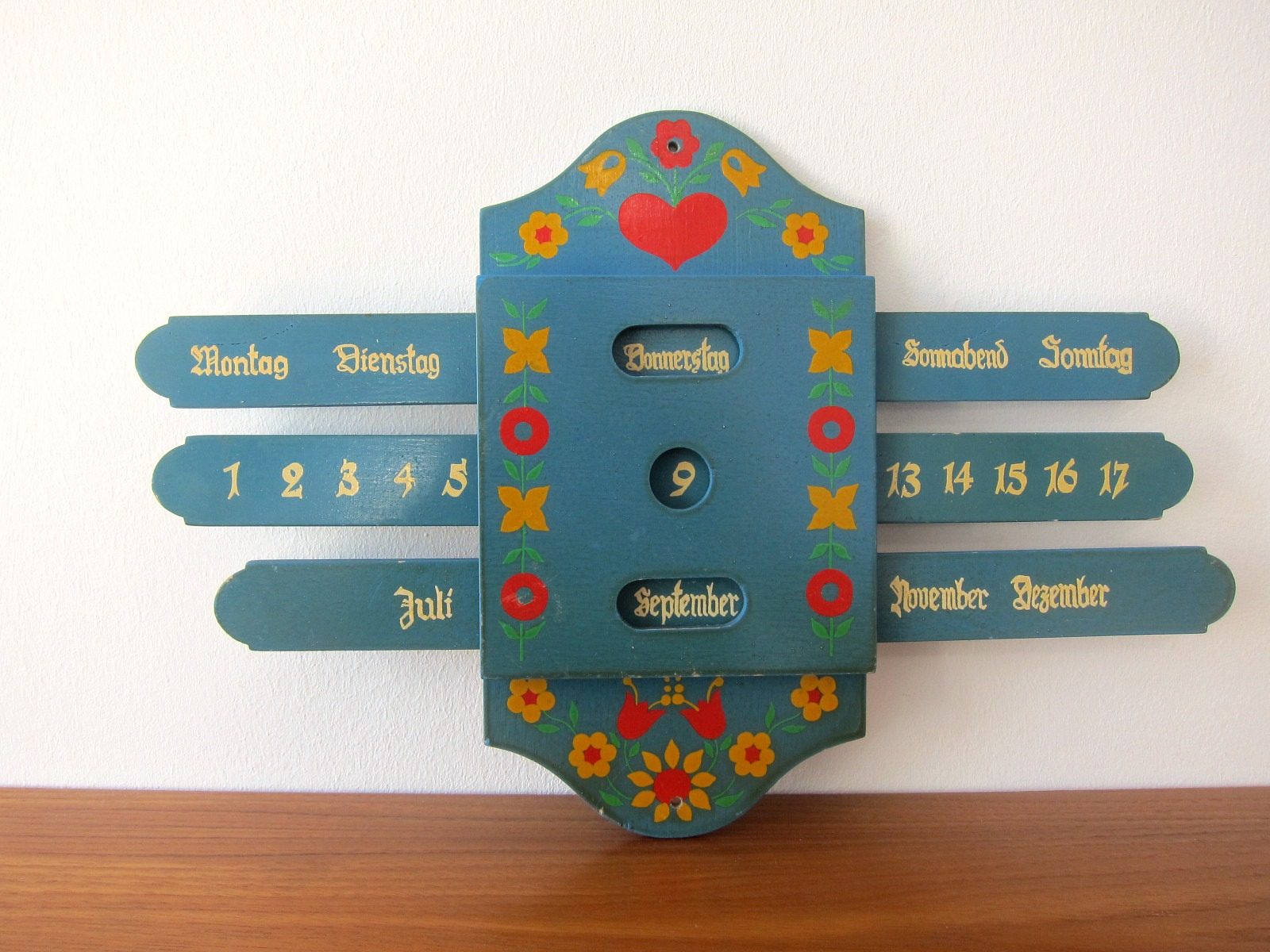 ドイツ語で曜日と月が書かれており、手動で日付を変えるタイプのカレンダーです。 壁に掛けられるように二つ穴が開いています。