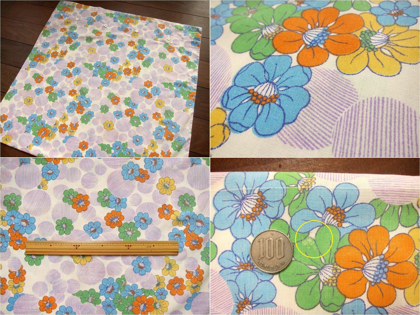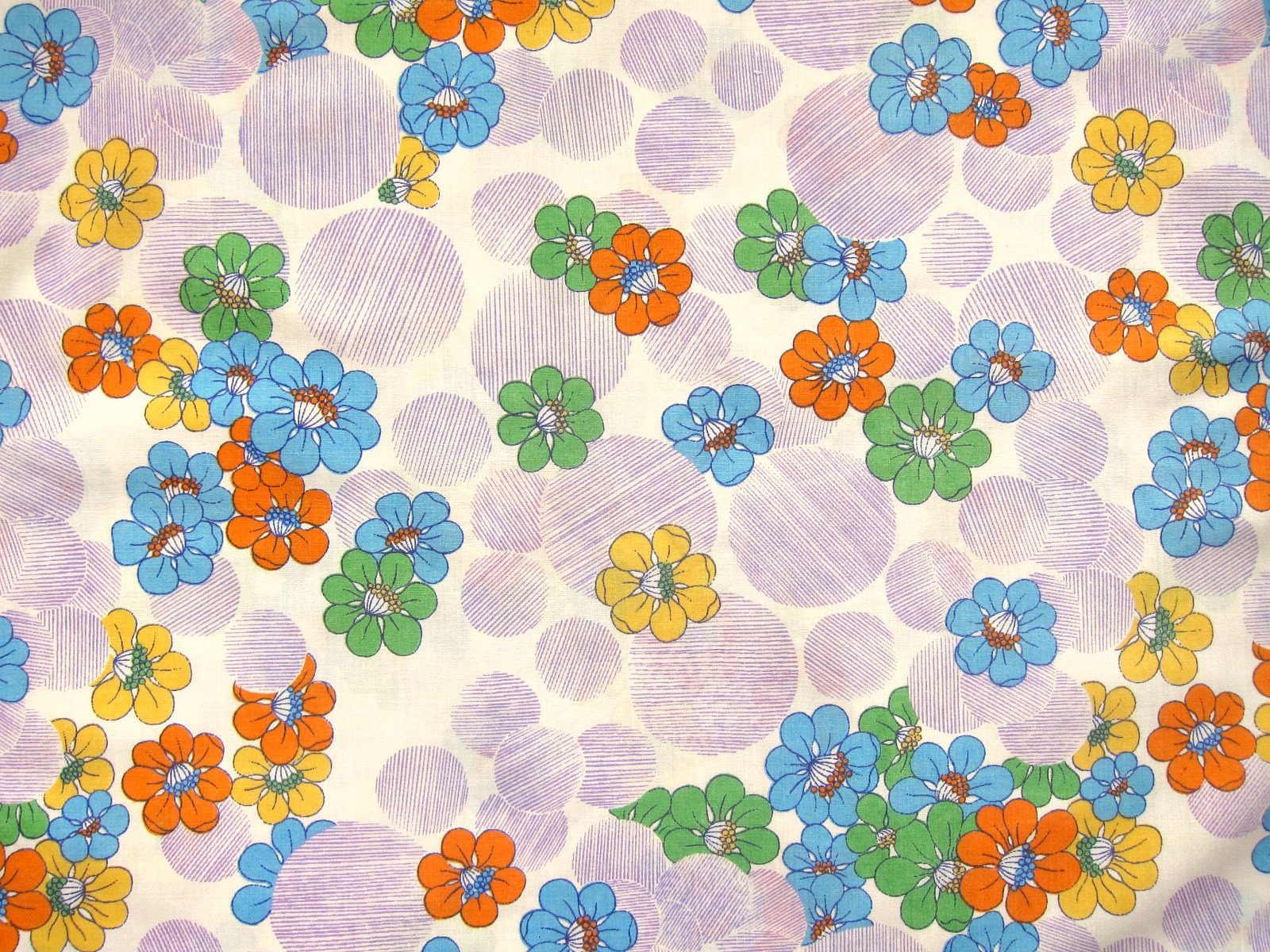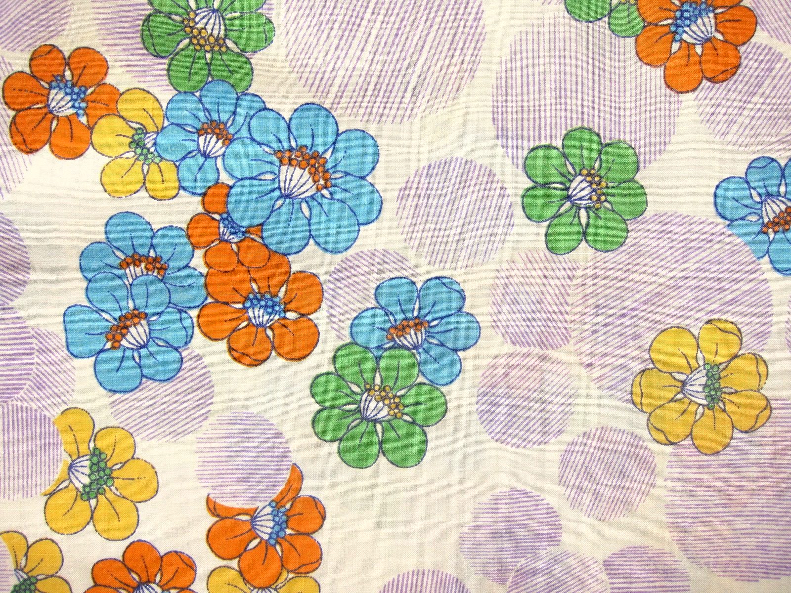 紫色の丸いモチーフに、青や緑、黄色などの原色のお花のパターン。