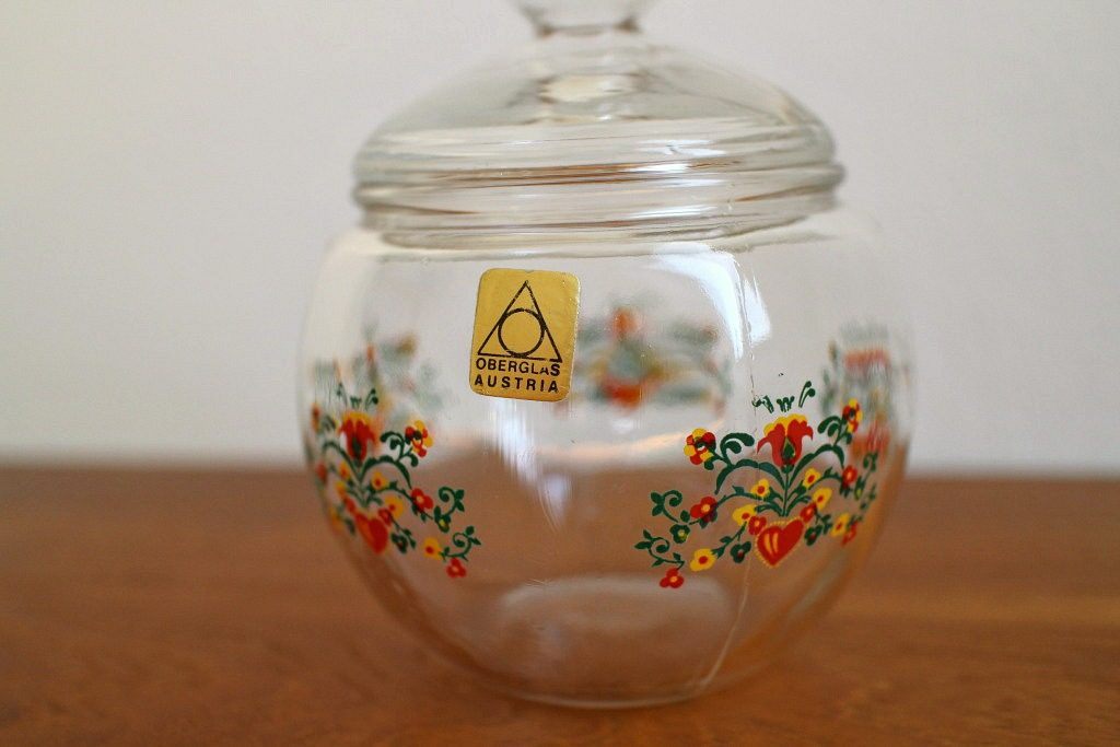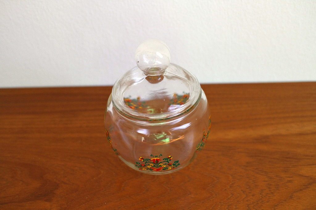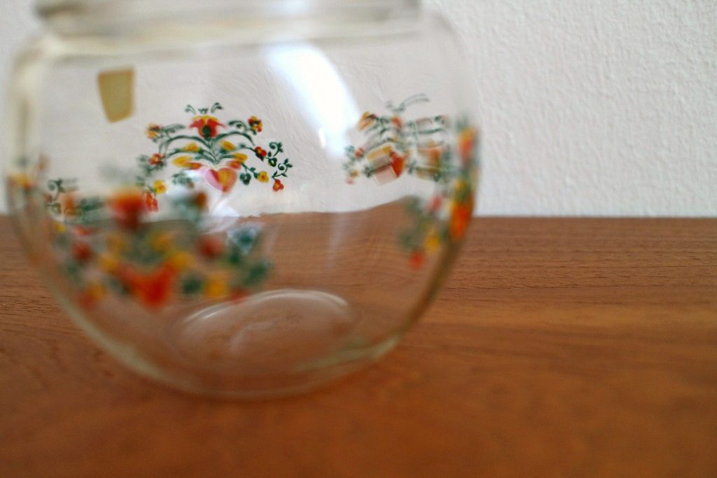 いかにも東欧的な抽象的な花模様がペイントされたころんと丸いヴィンテージガラスコンテナー。 まん丸キュートなつまみの蓋も同じくガラスでできた透明感あふれるデザインです。 インテリア飾りとしてそのまま、もしくはカラフルなミシン糸を入れるなど見せる収納にもうってつけ。