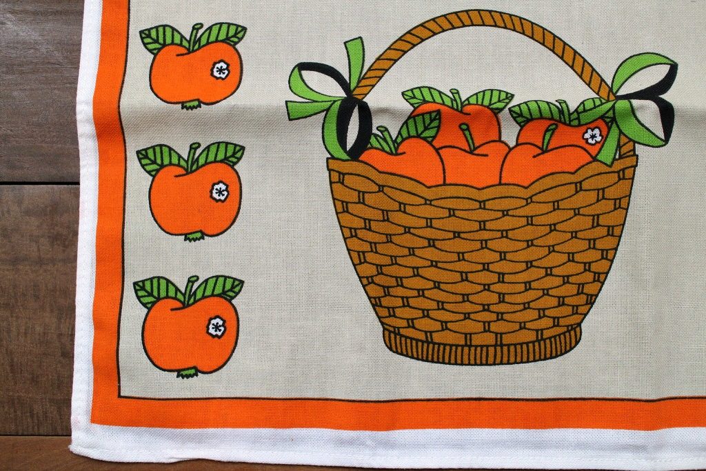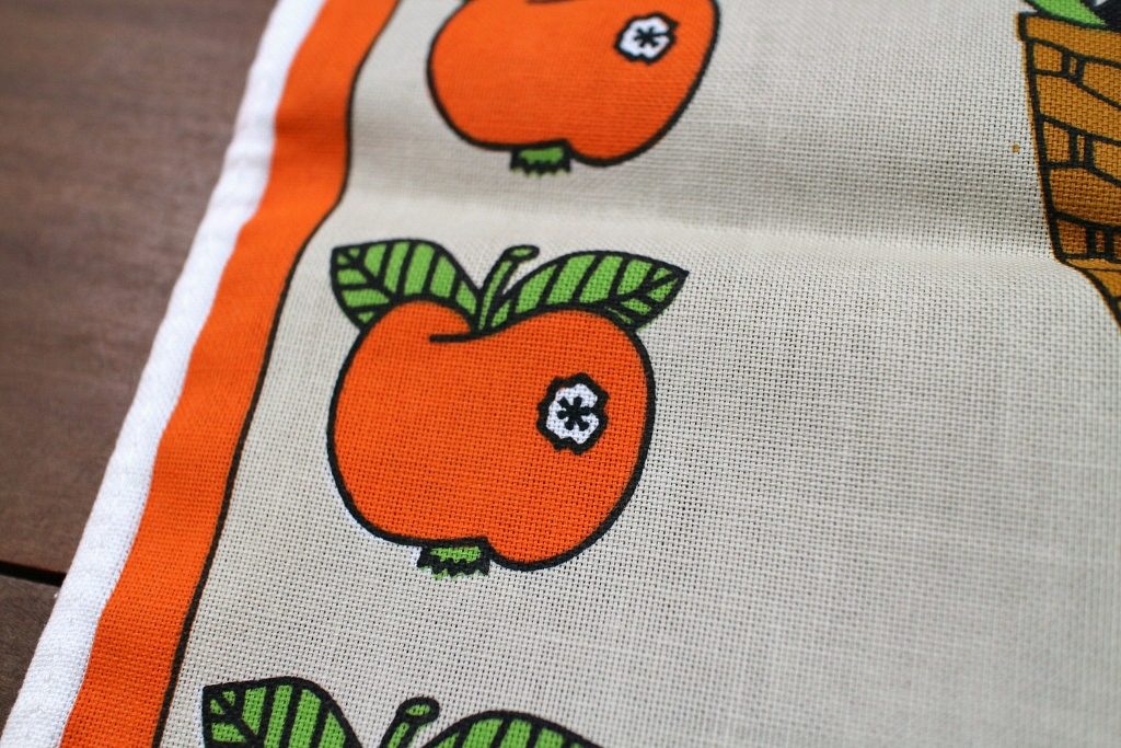 ころんと美味しそうなりんごが詰まった籐カゴが3つ並んだ、ノスタルジー感あふれるカントリー柄コットンティータオルを蚤の市で見つけました。 70年代のものと思われます。 お行儀よく並んだキュートなリンゴたちがレトロ感いっぱい。 キッチンが楽しくなること間違いなし!