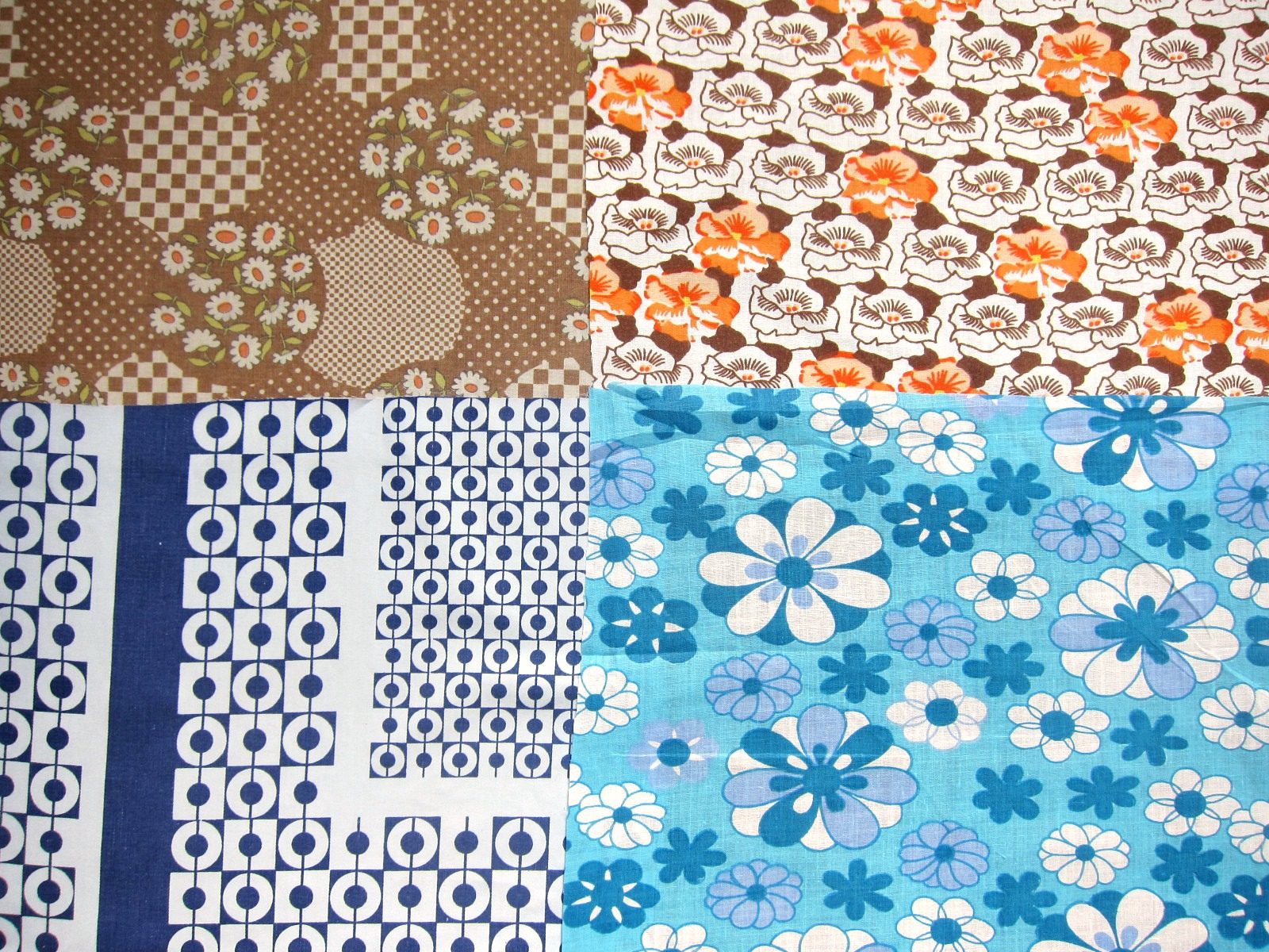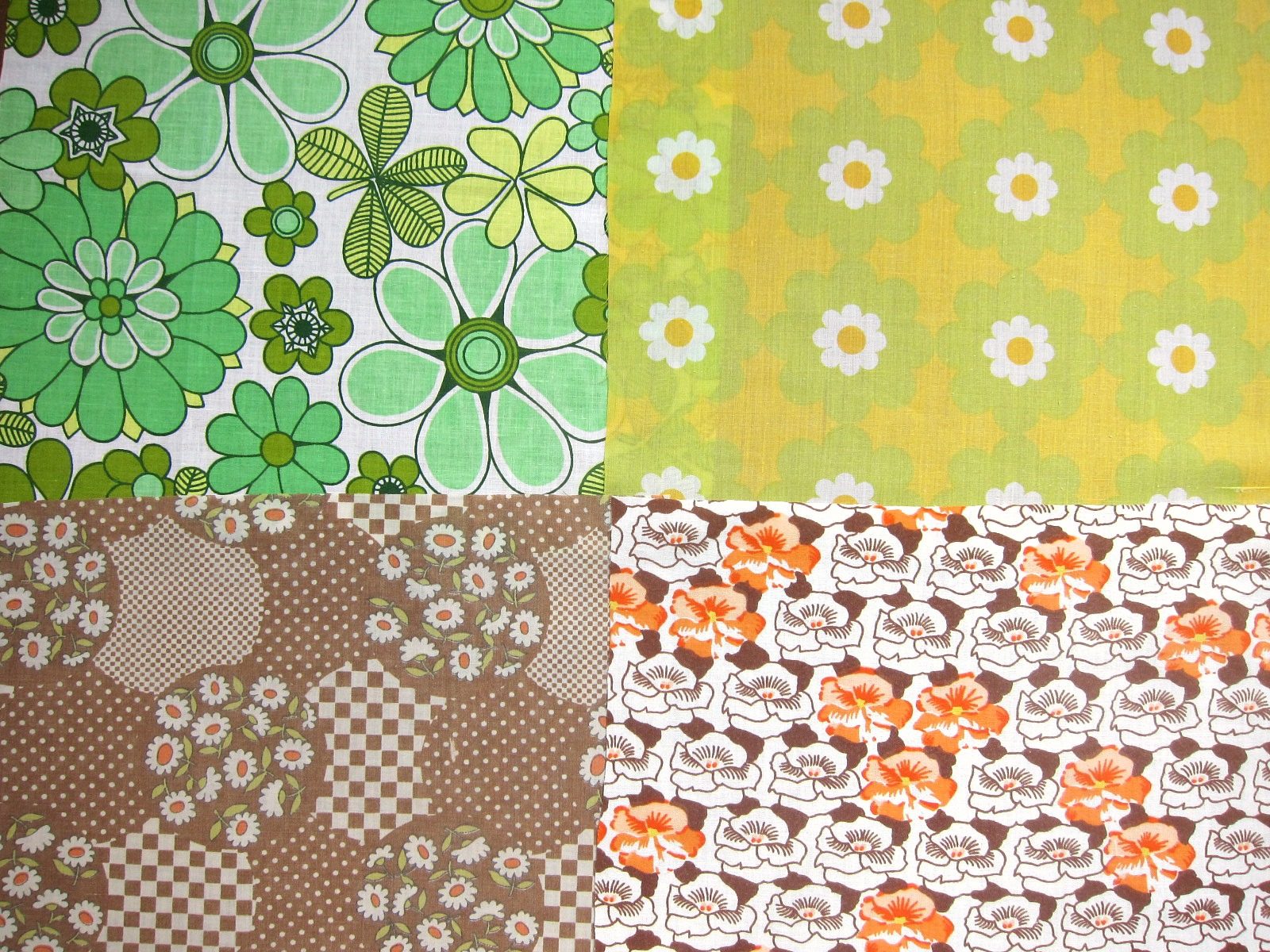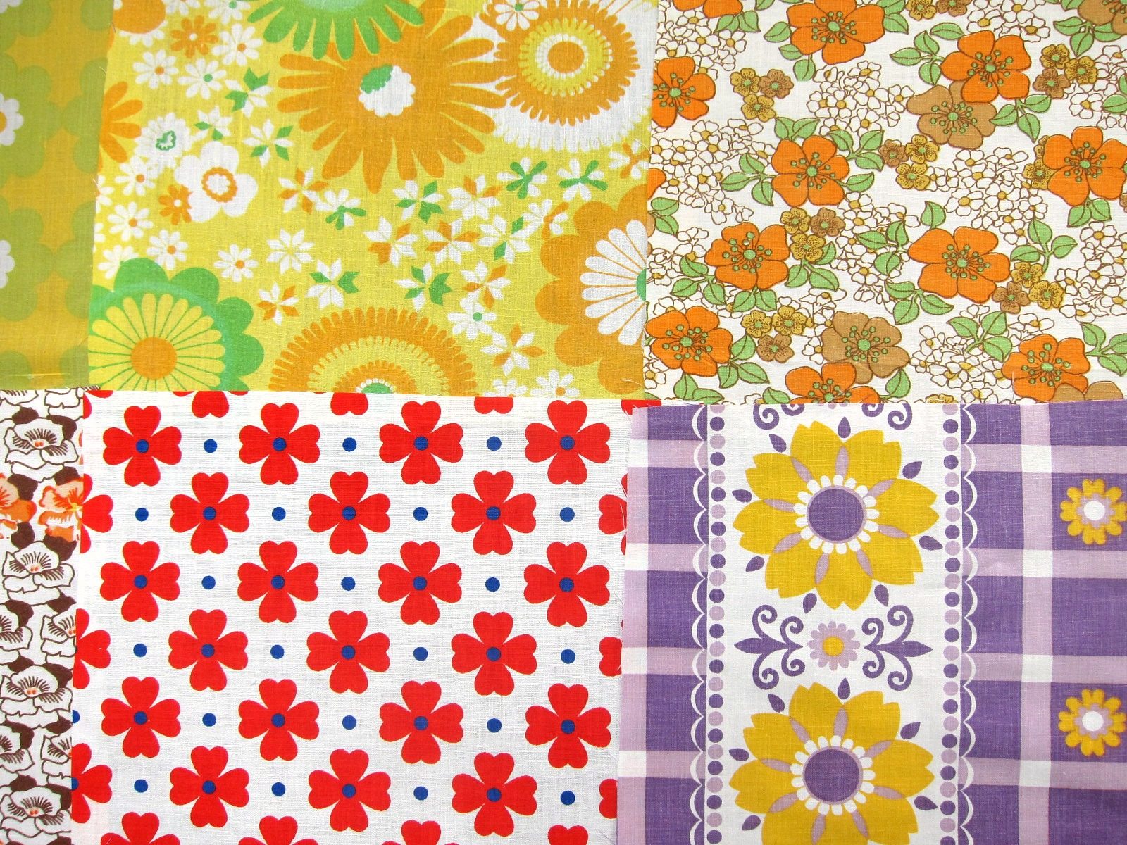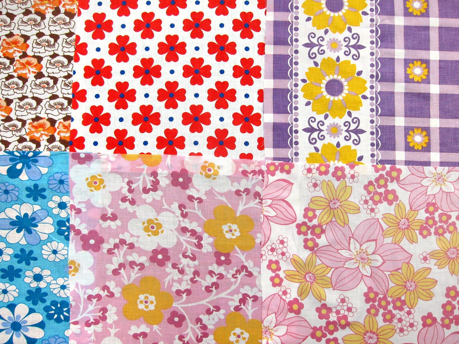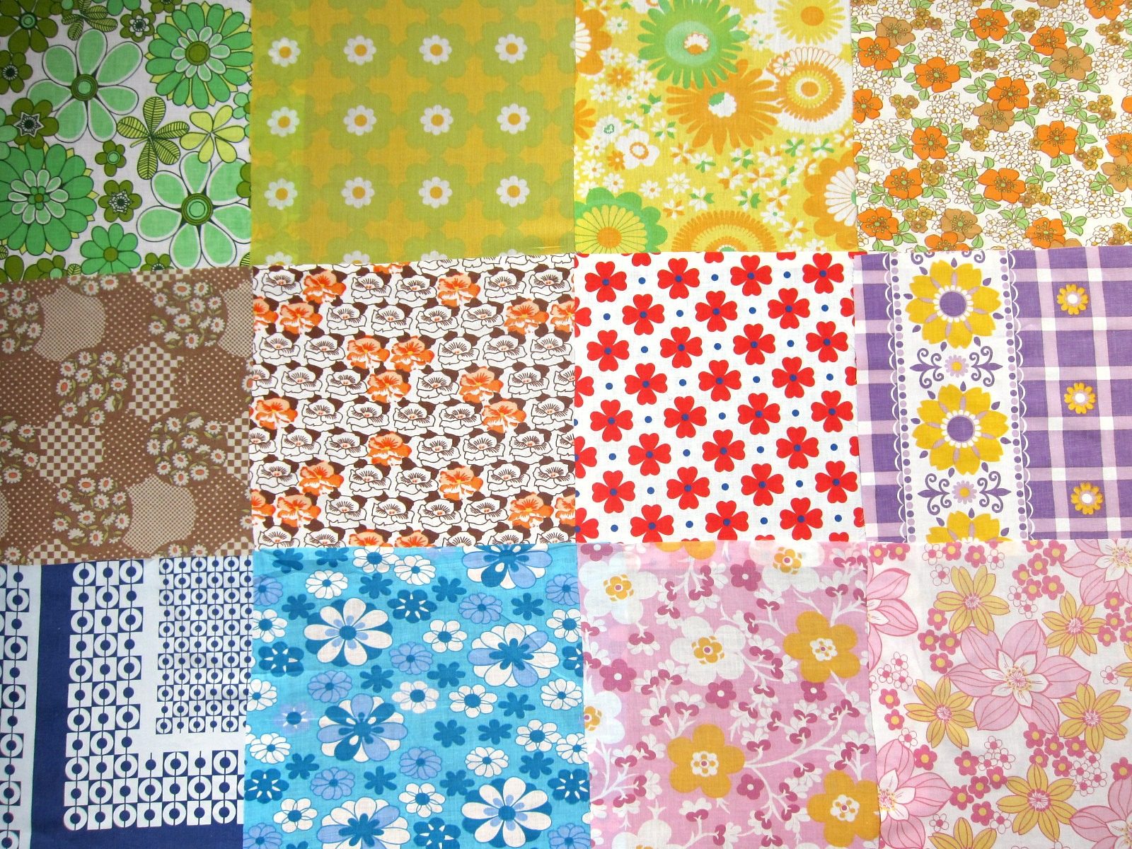 ドイツ70年代のオレンジ、ピンク、赤、黄色、茶色、緑、青の花柄を中心に12枚のはぎれをセットにしました。