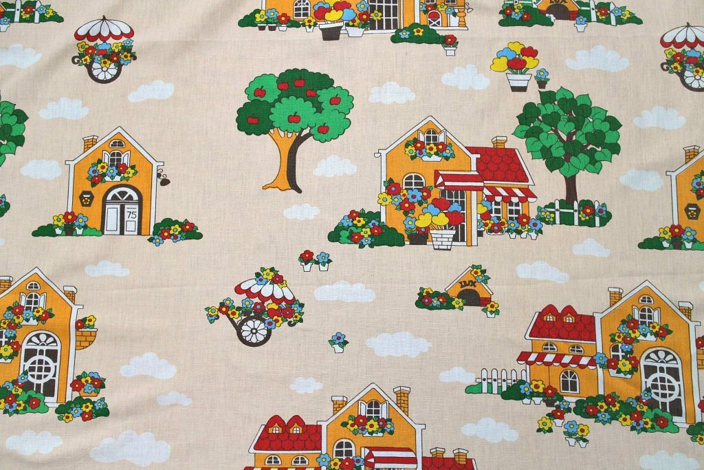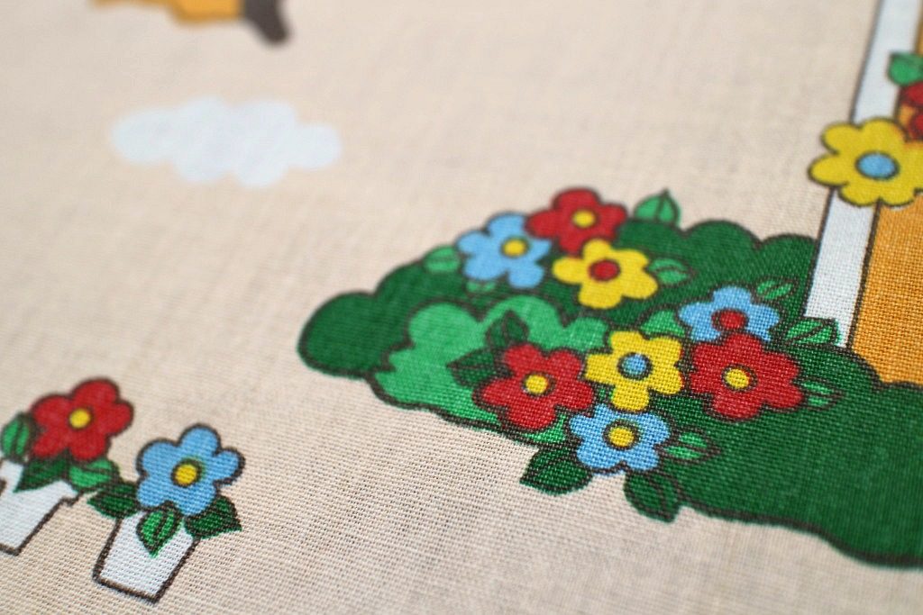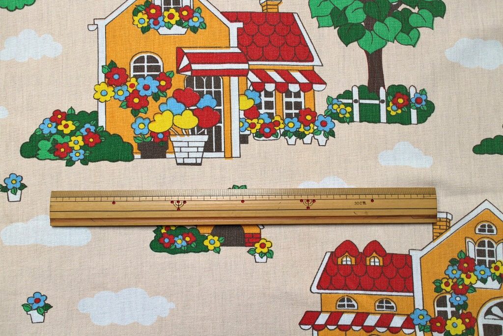 コンテンツにスキップ赤青黄の華やかなお花に囲まれた欧風ハウスが並ぶ、楽しさいっぱいキッズ柄レトロファブリック。