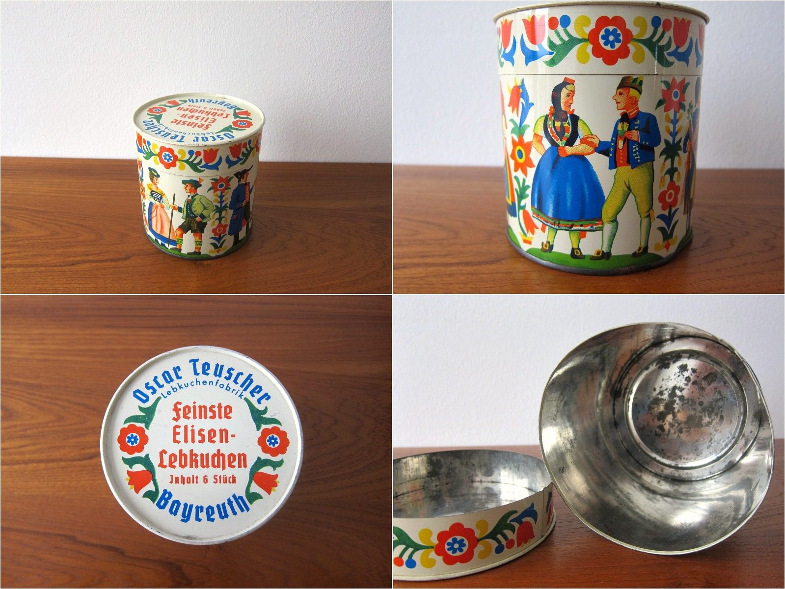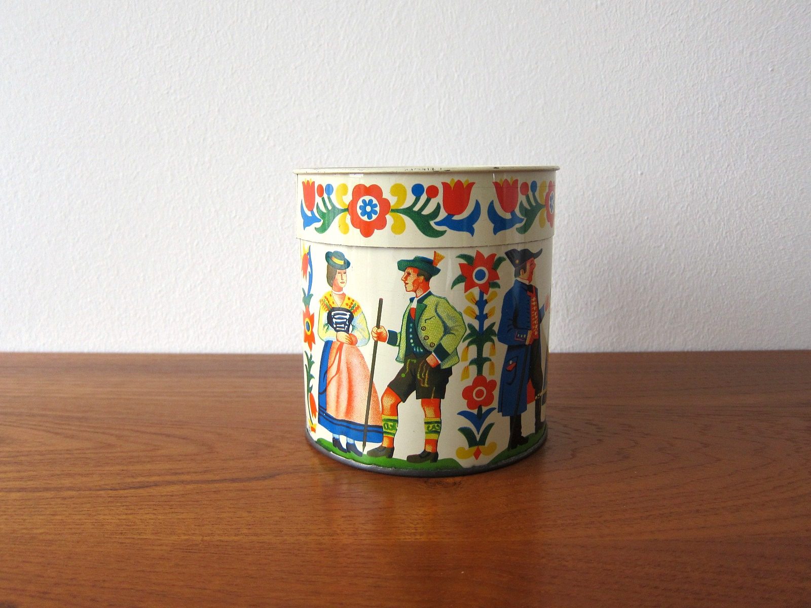 青やピンク、黒などの楽しい民族衣装を着た男女のイラストが入った古いアルミ缶。 円柱の形をしていて、レトロな東欧の花のモチーフが描かれて、とてもかわいらしいです。
