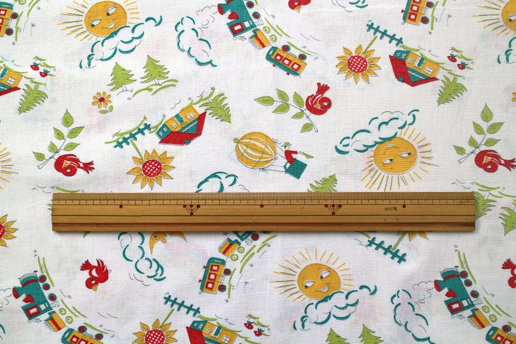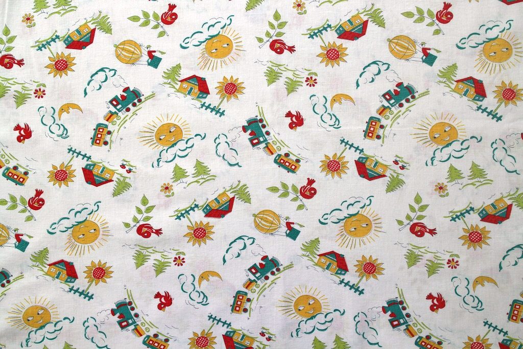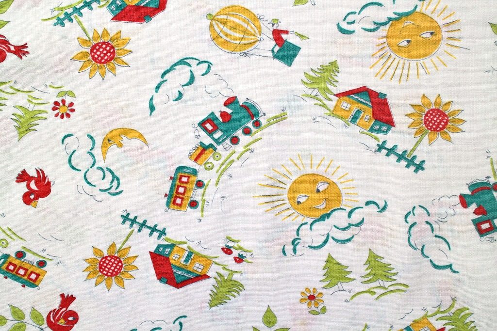 空に浮かぶ気球や元気よく駆け抜ける機関車、ニコニコ太陽が描かれた楽しいキッズ柄レトロファブリック。