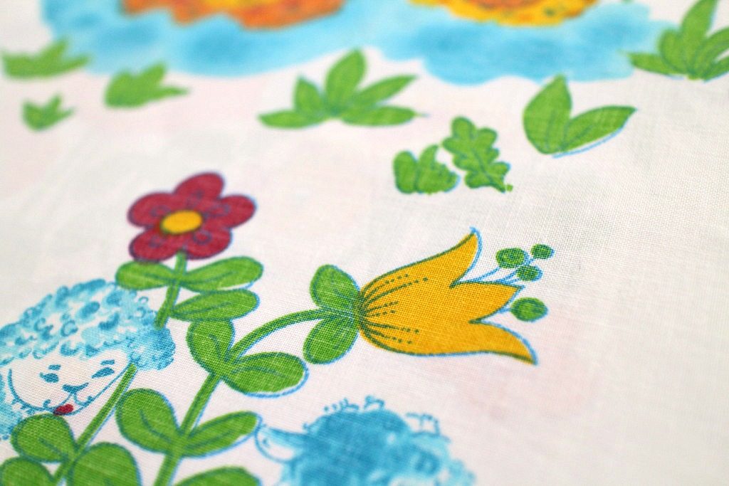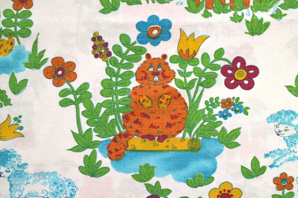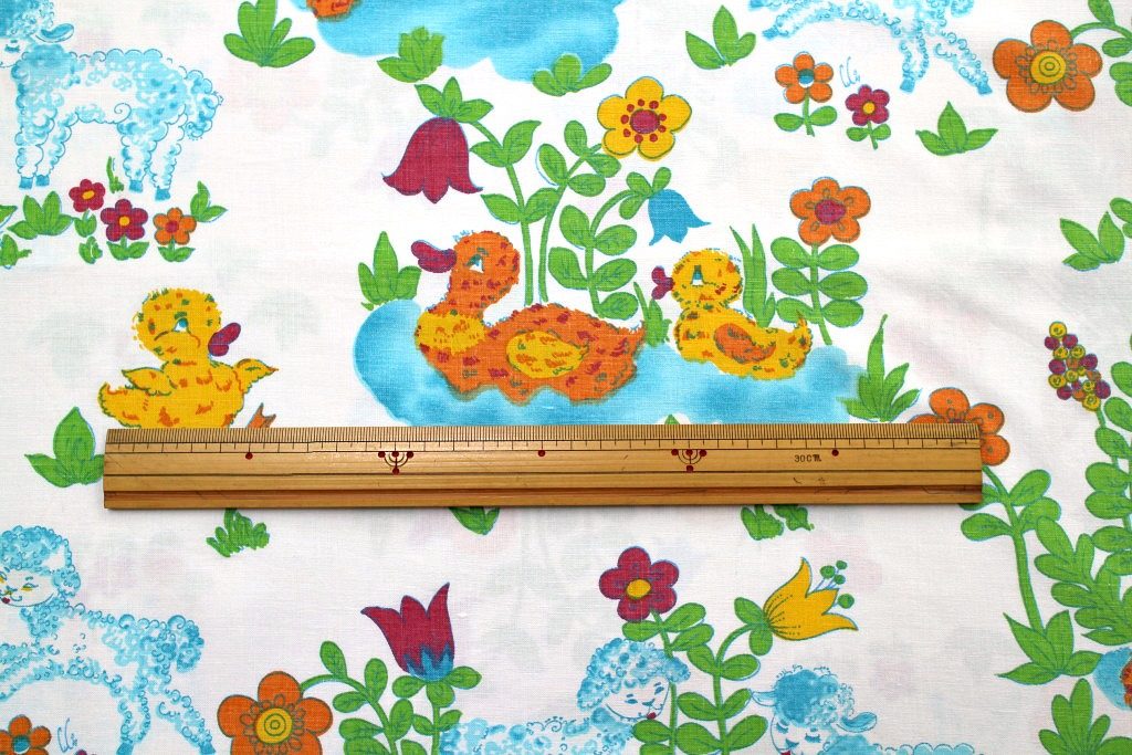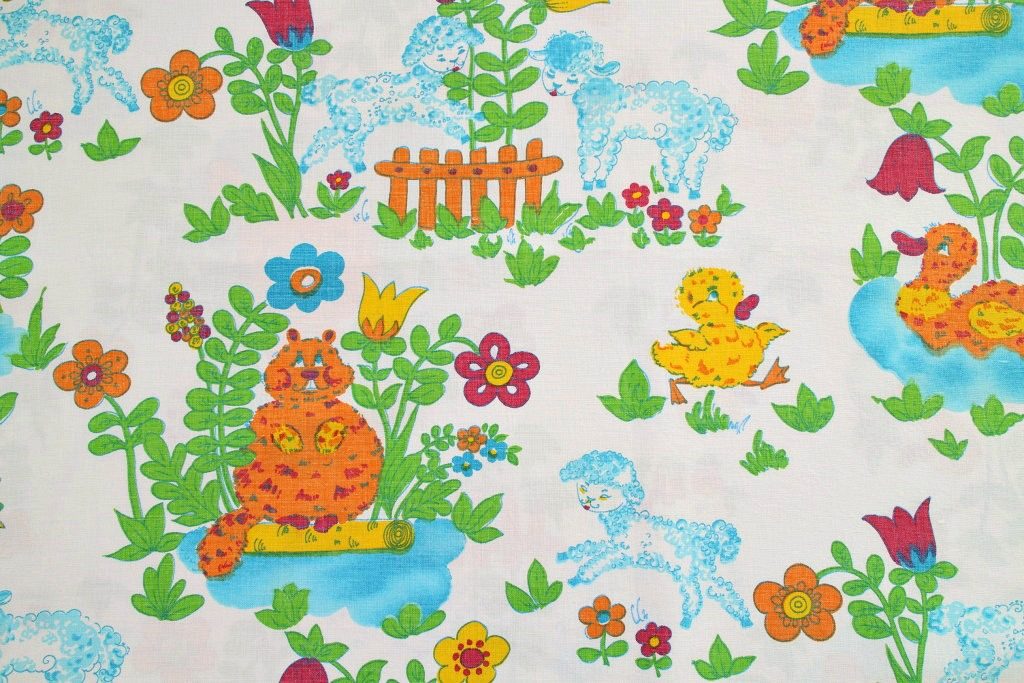 水辺にまどろむアヒルやヒツジなど 賑やかな動物柄レトロ生地 幅90cm