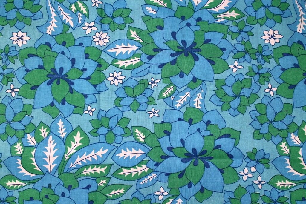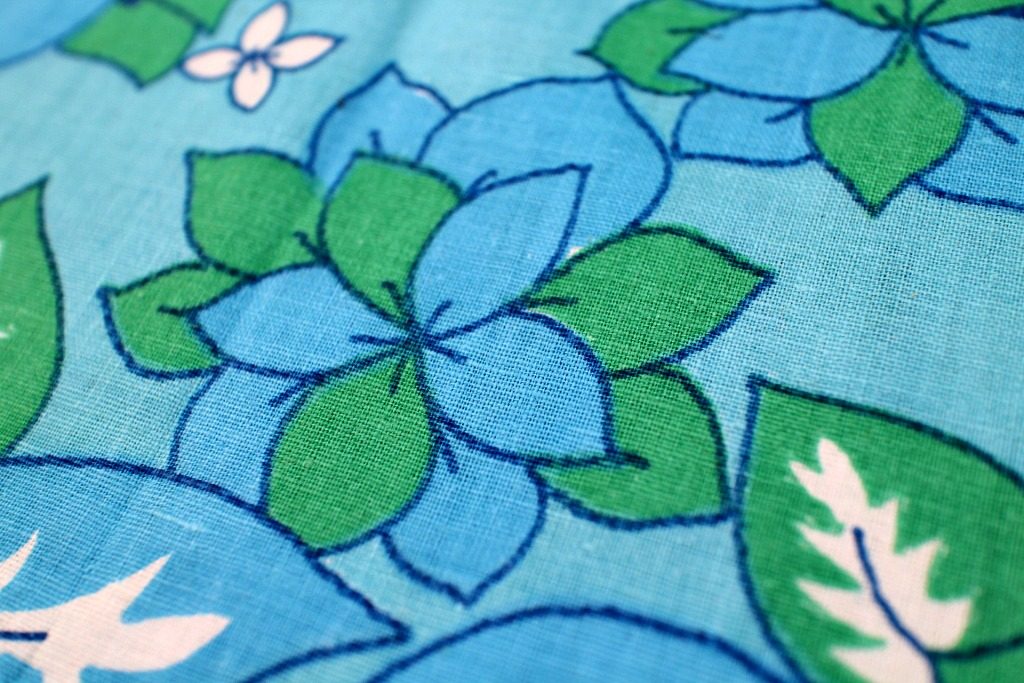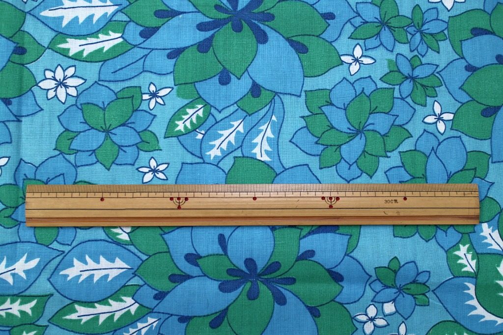 ブルー&グリーンの大きめ花モチーフがぎっしり詰まった、澄んだ空色カラーのヴィンテージファブリック。