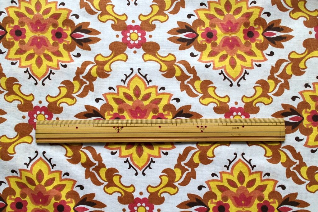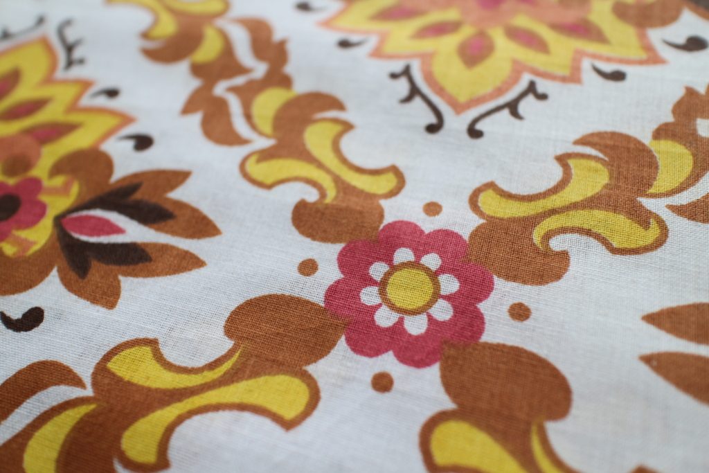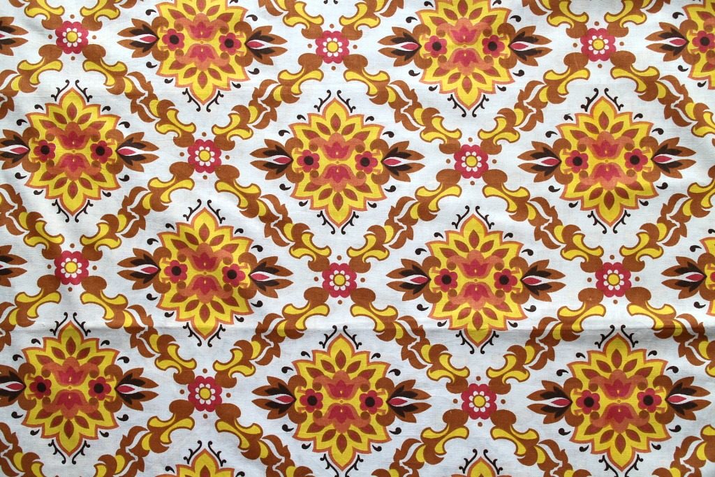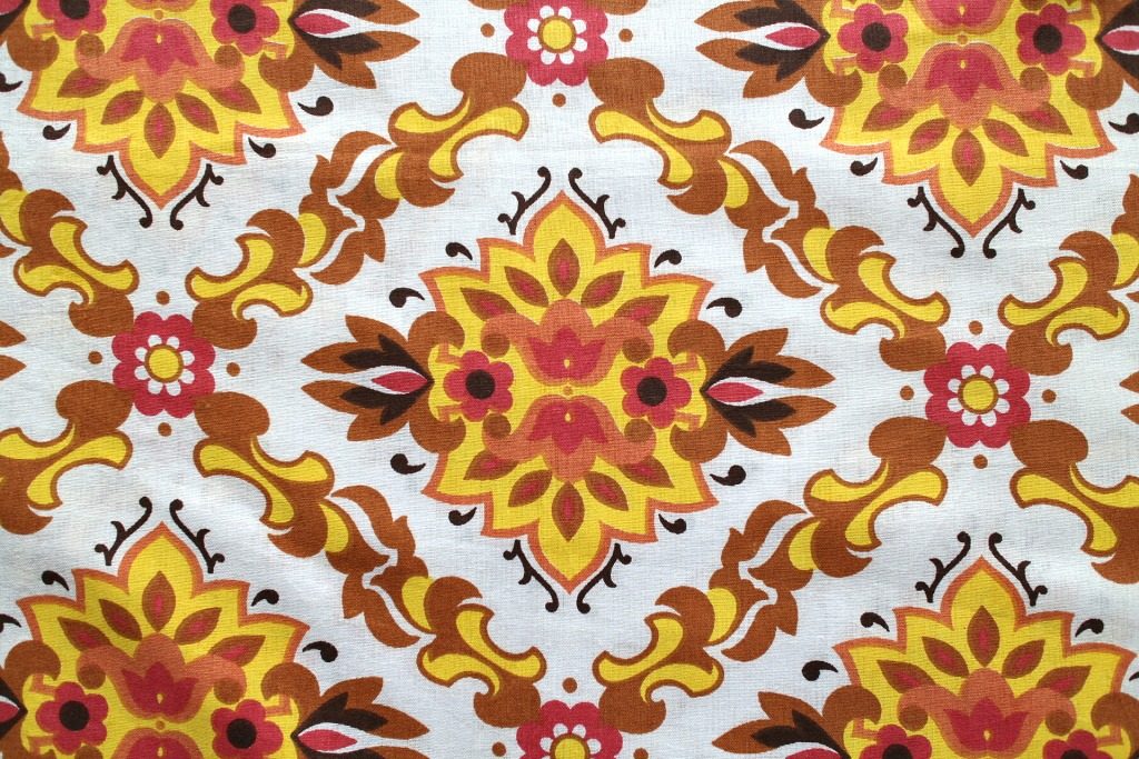 ひらめく花びらの格子が炎のように描かれたレトロ感いっぱいのヴィンテージファブリック。