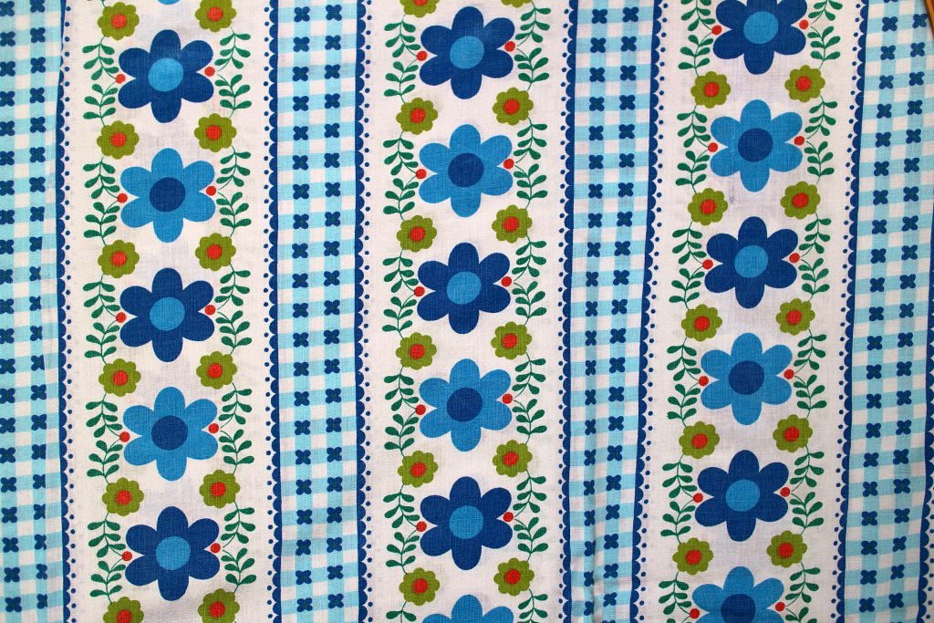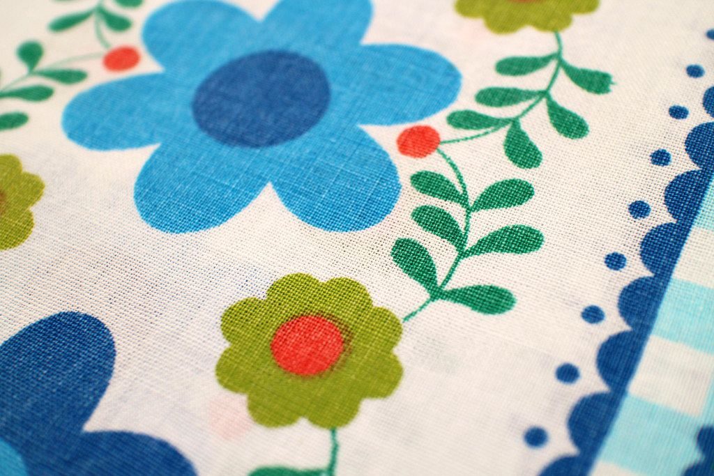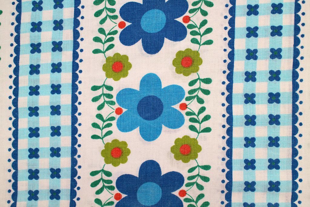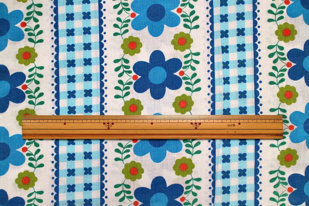 青と水色のキュートな花模様が交互に並んだコットン製レトロ生地。