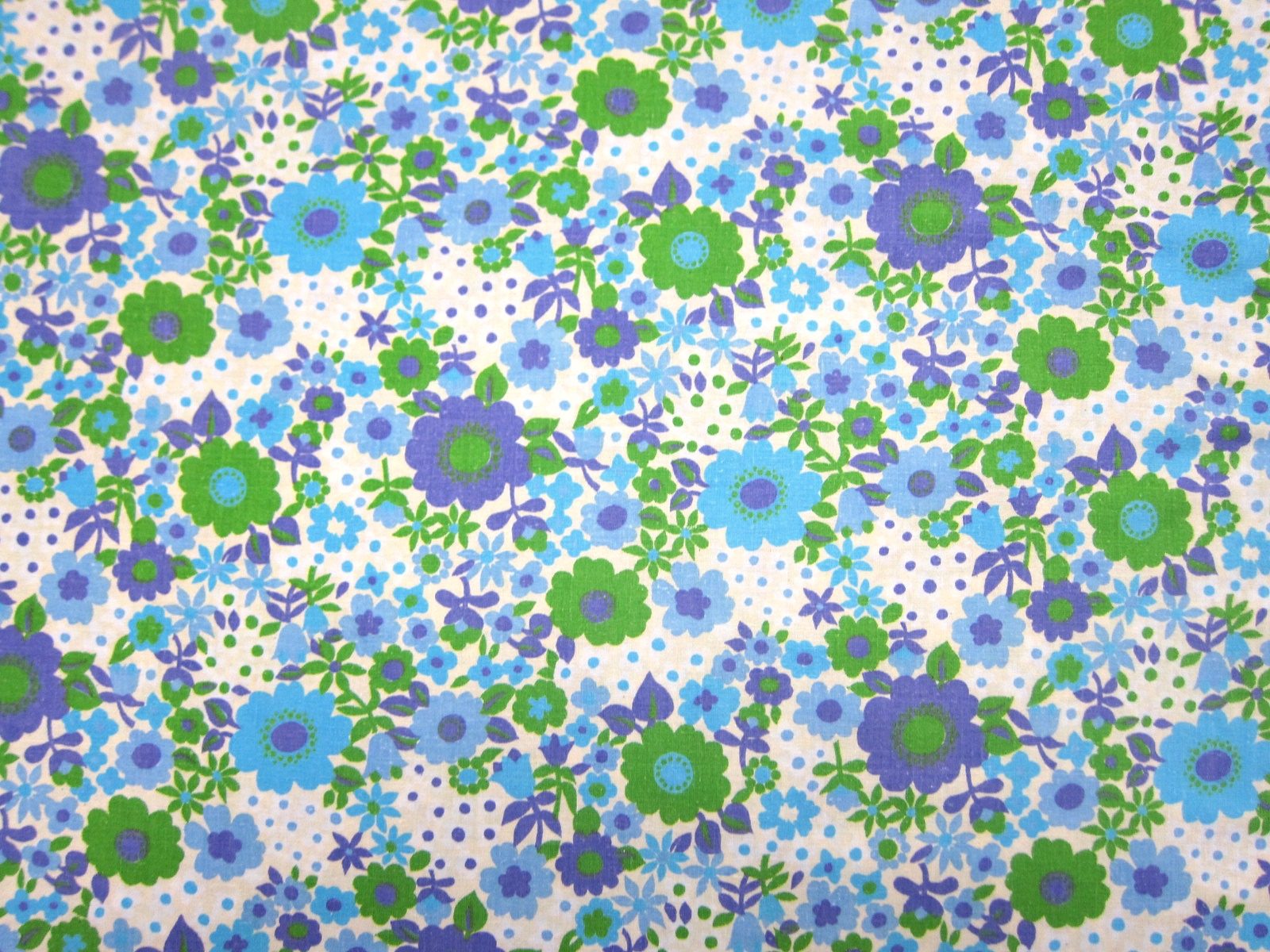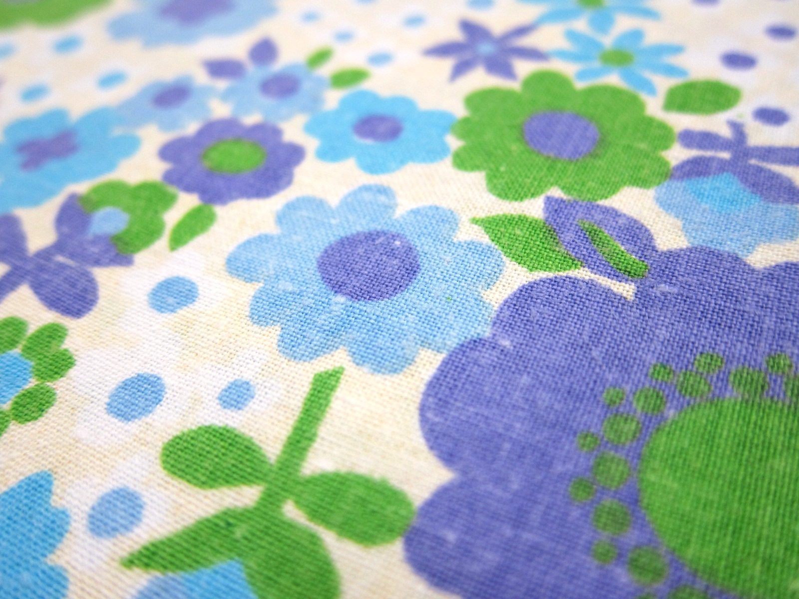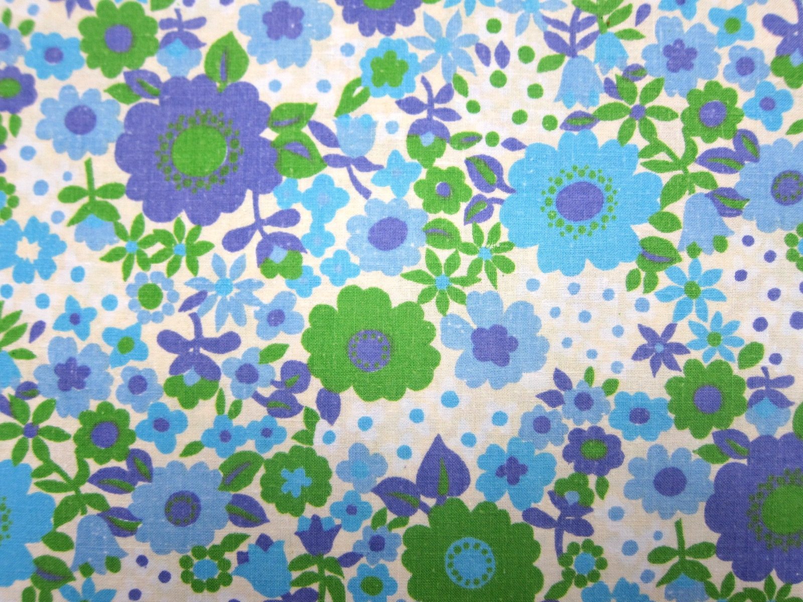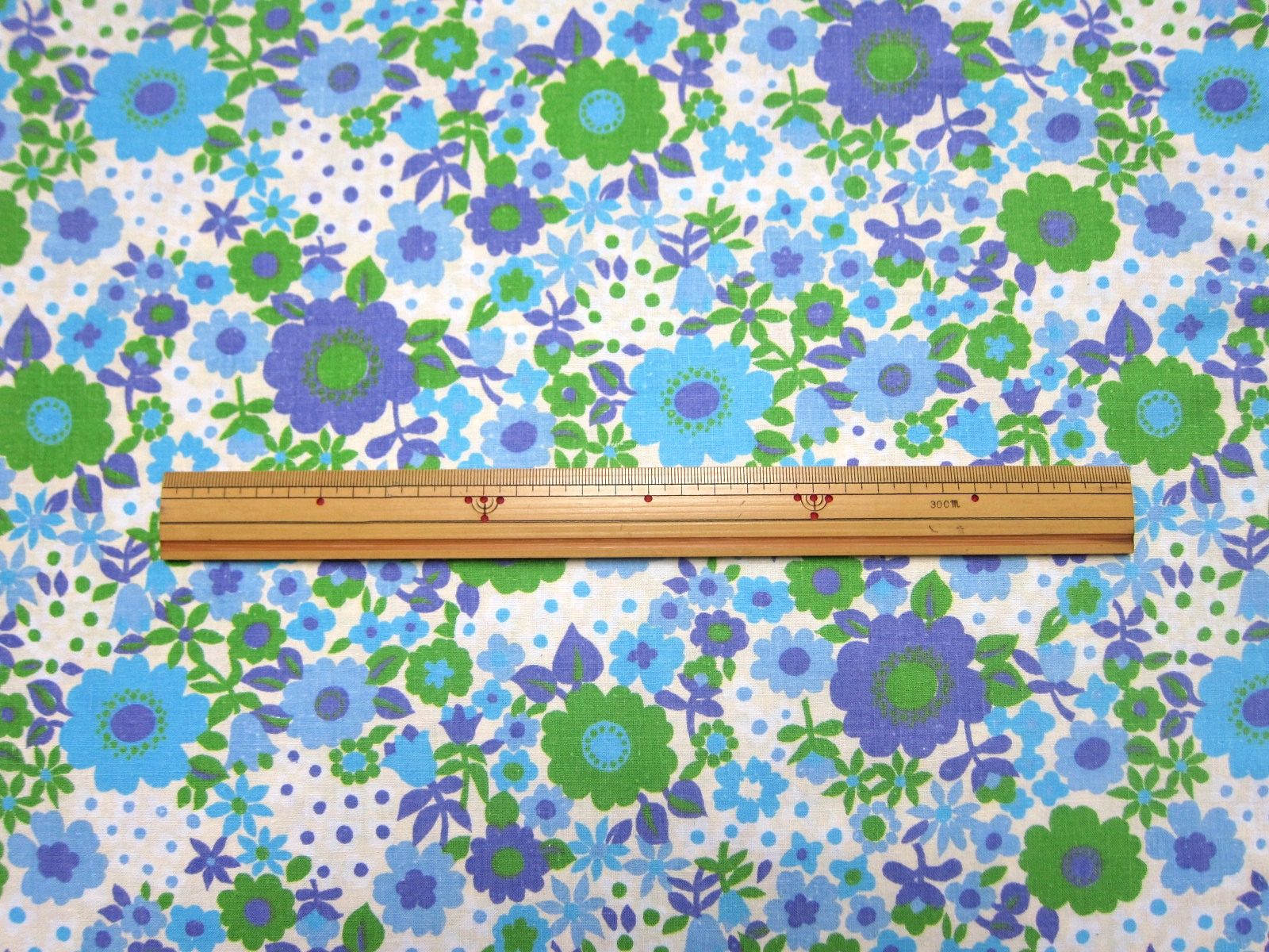 青と緑の爽やかな印象のあるヴィンテージファブリック。 70年代のもので、花柄パターンの生地です。 お花のサイズは比較的小さめです。